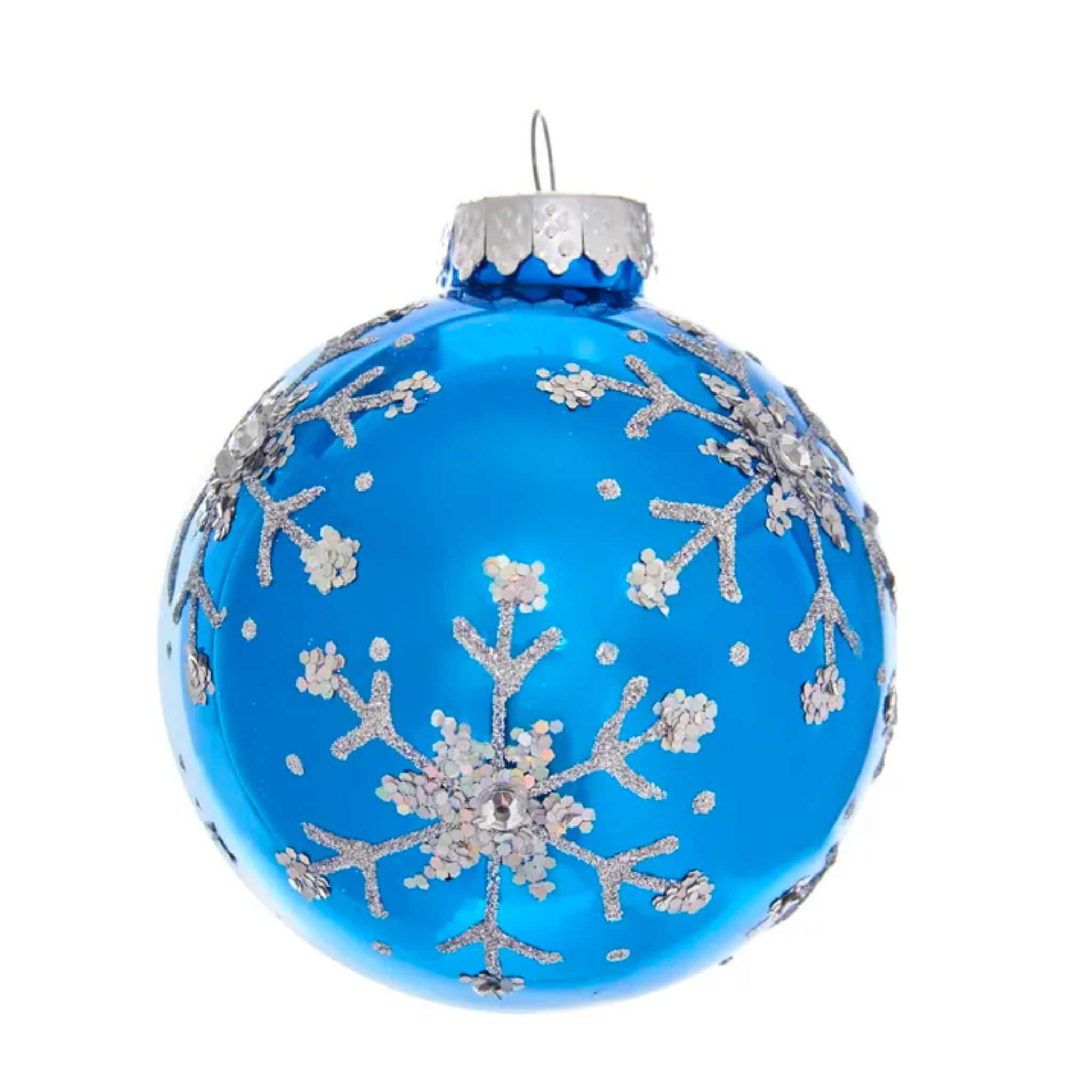 These Kurt Adler Blue and Silver Glitter Snowflake Glass Ball Ornaments are a classic addition to your holiday décor or Christmas tree. This ornament features an intricate snowflake pattern made from glitter, sequins, and gems.