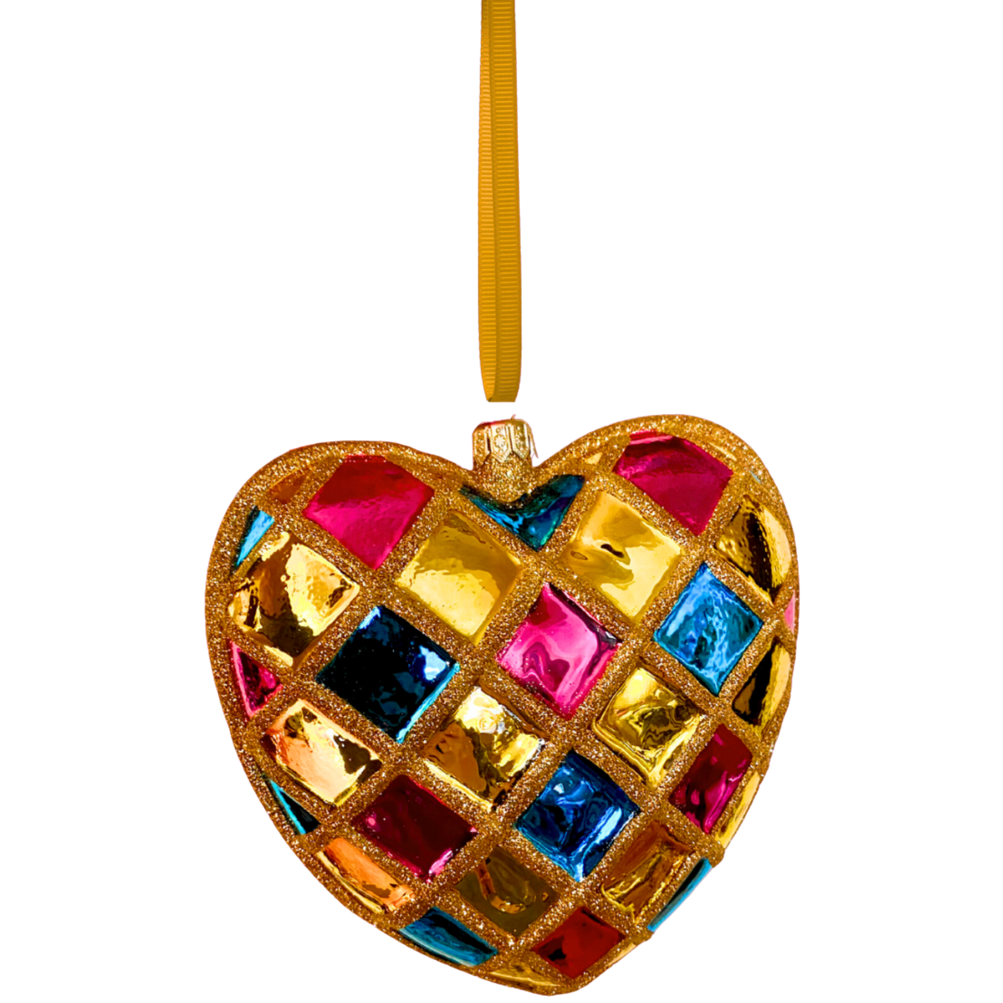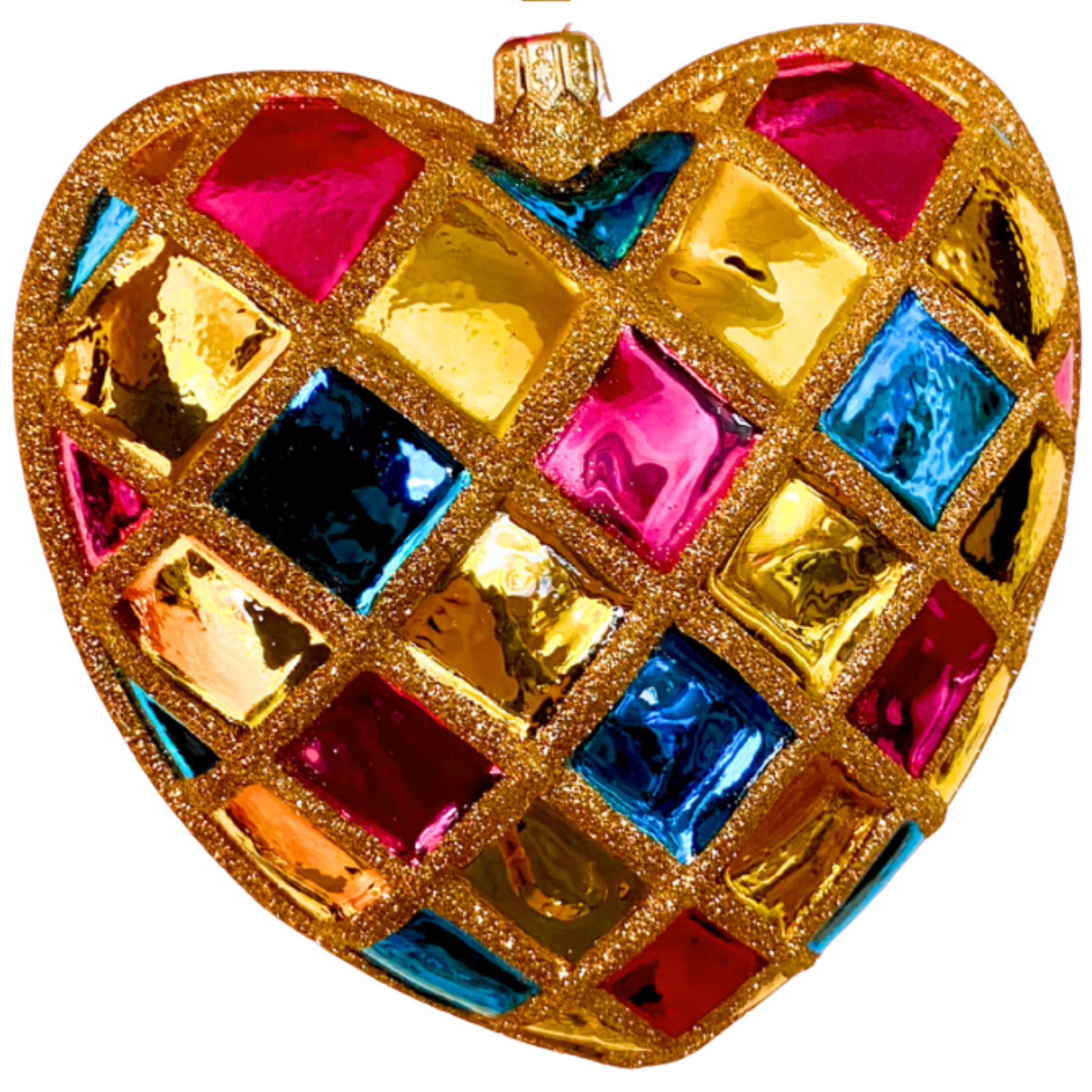 Add a touch of opulence and romance to your holiday décor with this breathtaking Glass Heart Christmas Ornament. Featuring a radiant patchwork of gold, sapphire, ruby, and fuchsia, each shimmering section glows with jewel-toned brilliance. Delicately overlaid with a lattice of golden dust. Perfect for lovers of rich detail and timeless elegance, this heart is a stunning symbol of holiday warmth and love.