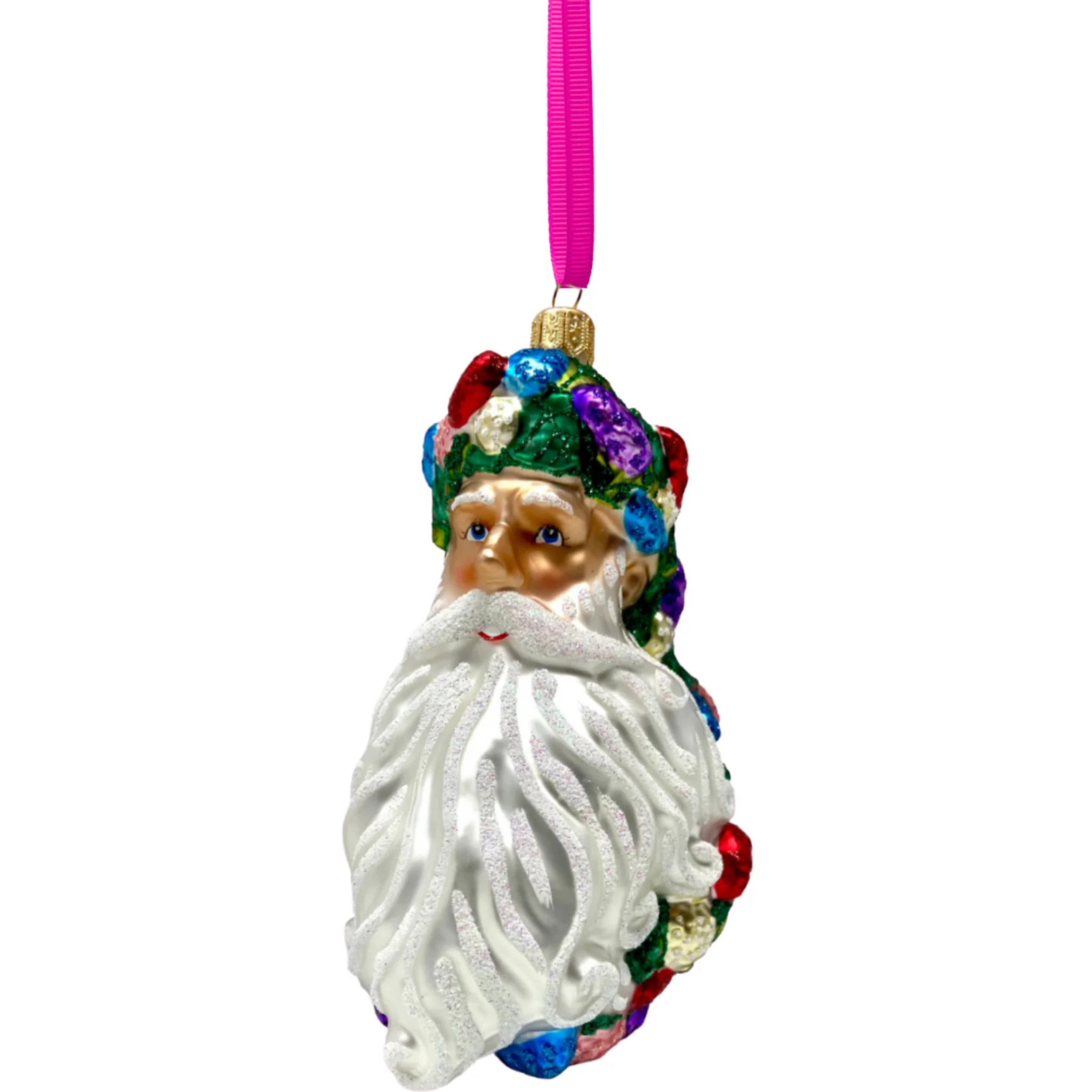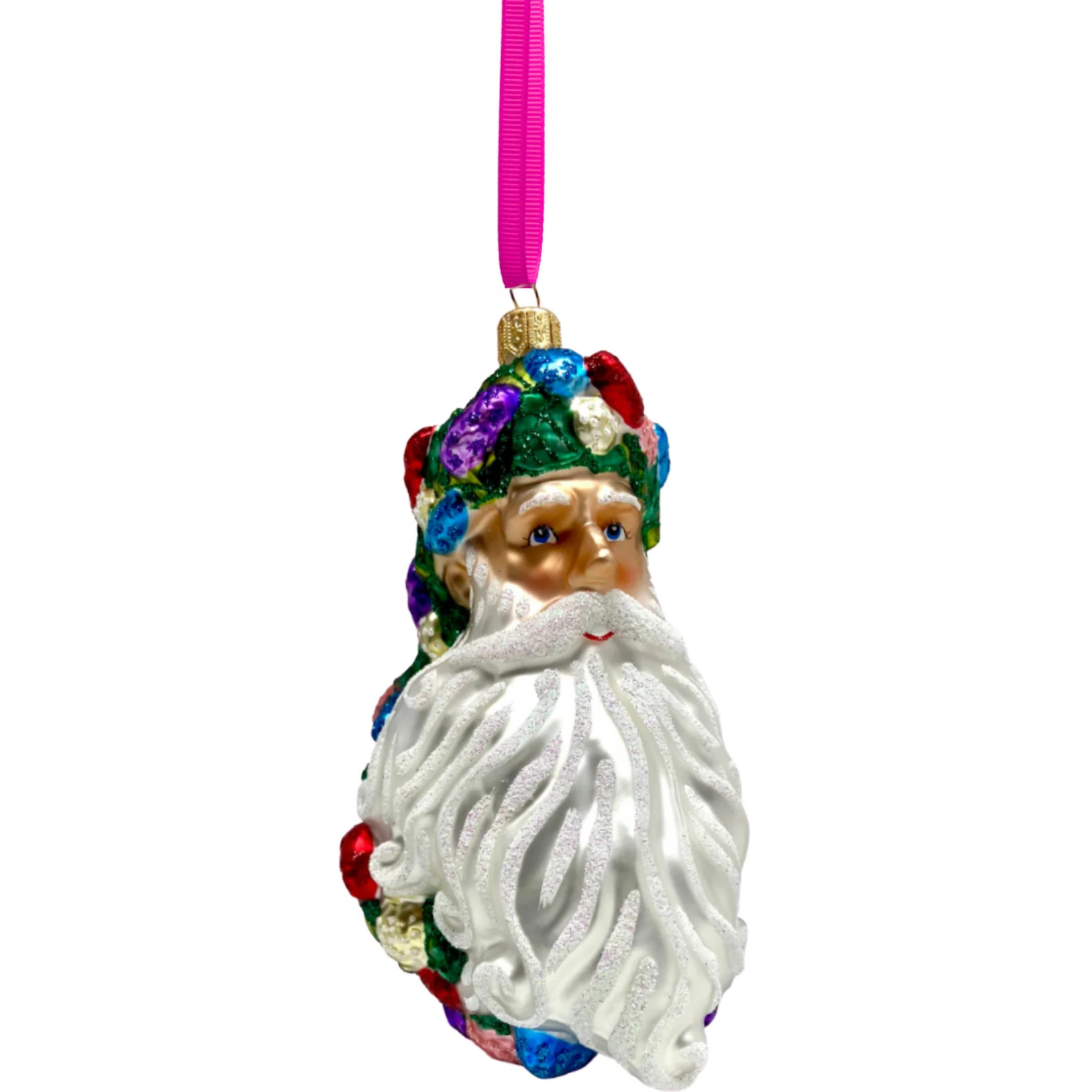 This charming glass ornament is crafted with intricate detail, Santa’s jolly face is adorned with a soft, rosy blush and a twinkling smile, bringing warmth and cheer to your holiday décor. Beautifully embellished with delicate floral accents, featuring soft blooms and leafy greenery that weave around the brim, creating a refreshing, botanical touch. The combination of Santa’s timeless features with the gentle beauty of florals makes this ornament both playful and elegant, perfect for adding a touch of festive magic to your tree or display.