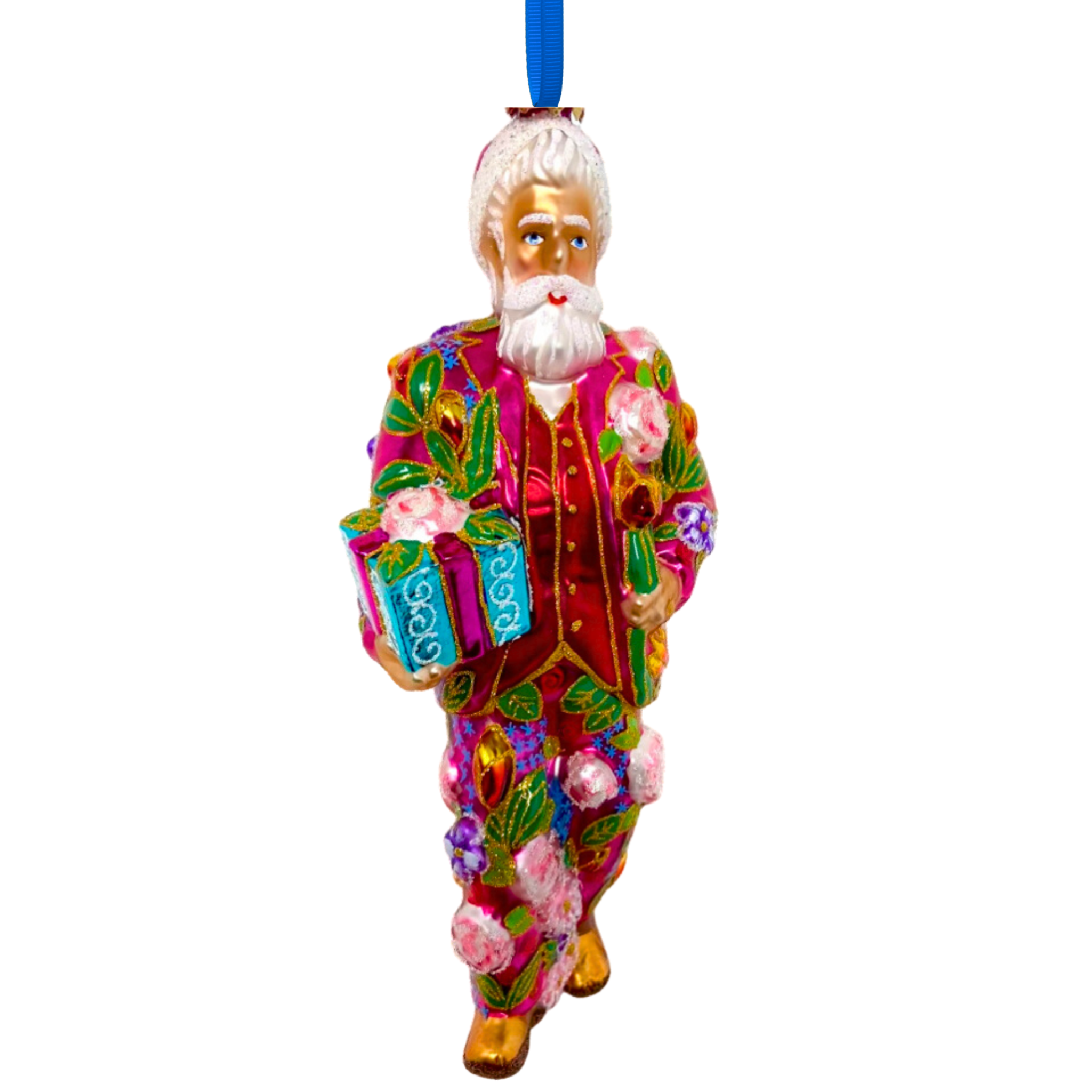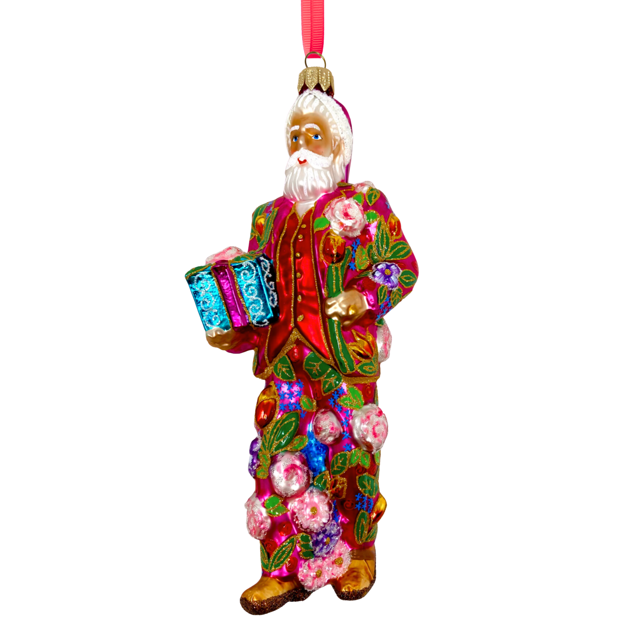 Celebrate the season with this stunning Santa glass ornament, dressed in a rich red coat bursting with painted blossoms and accented by intricate jeweled embroidery. A vibrant fusion of tradition and artistry, this ornament brings color, charm, and elegance to your holiday décor.