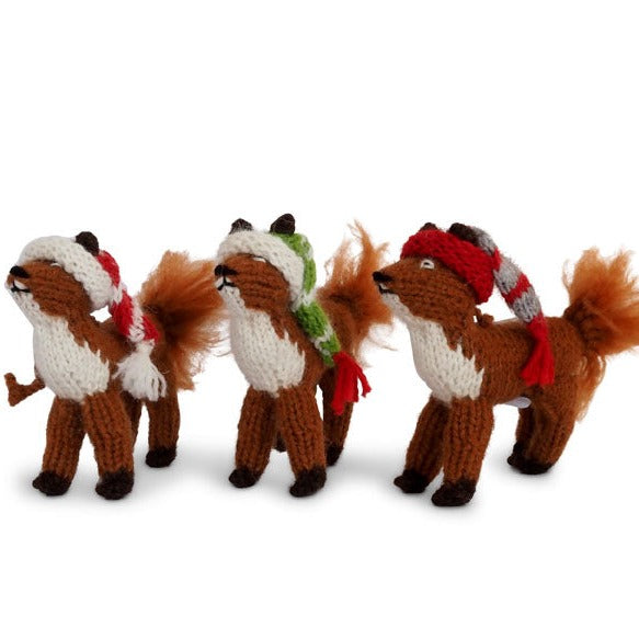 • This trio of white whiskered foxes are ready for a winter wonderland in cozy knit caps in green, red, and ecru.