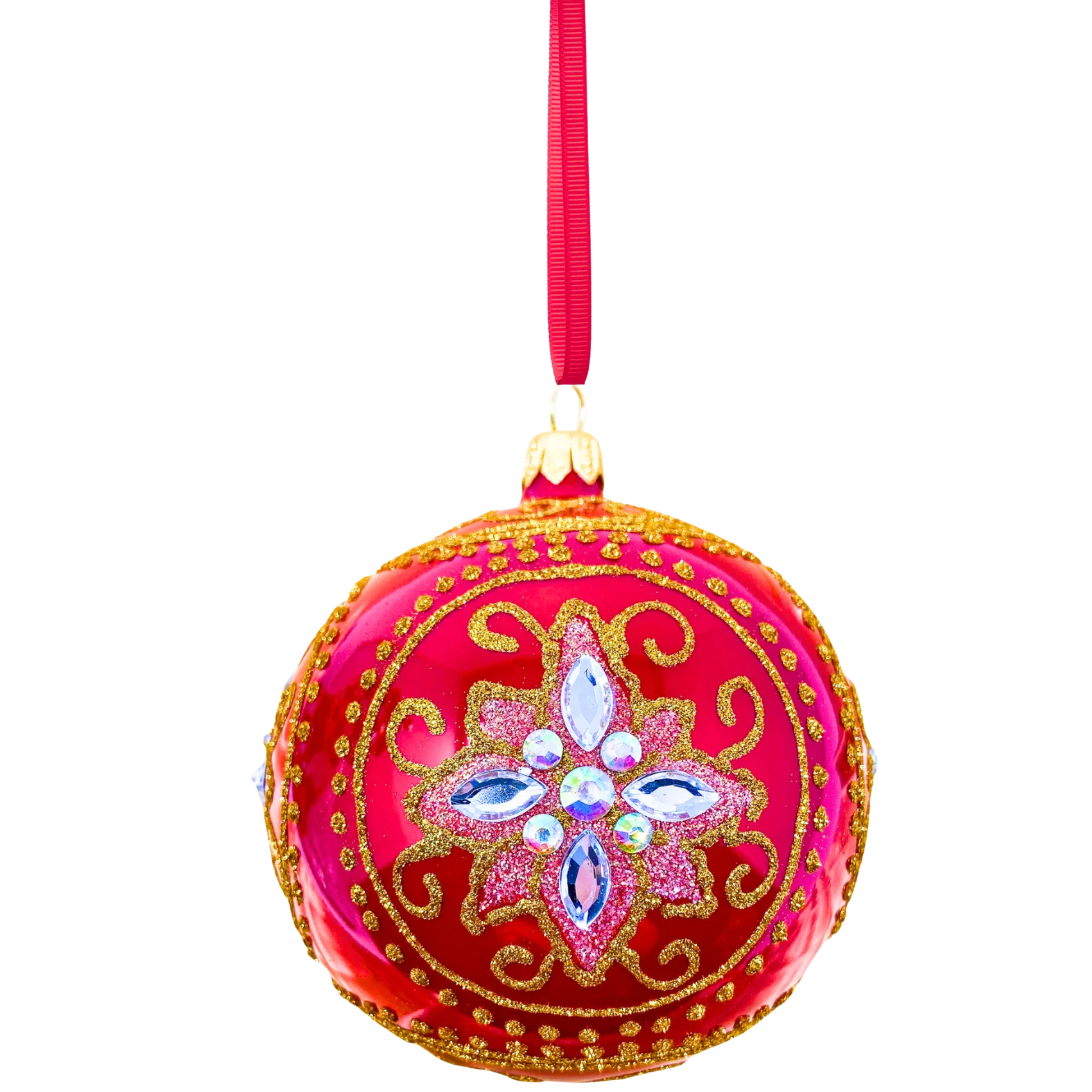 This elegant glass bauble ornament is a true embodiment of festive luxury, featuring a rich blend of burning garnet red and gold hues that exude warmth and opulence. The deep, fiery red contrasts beautifully with the shimmering gold accents, creating a striking visual effect. Intricate flourishes of ornate detailing wrap around the bauble, adding a touch of timeless sophistication to the design. Delicately placed faceted gems catch the light, adding a sparkling, jewel-like brilliance that enhances the ornament’s luxurious feel.