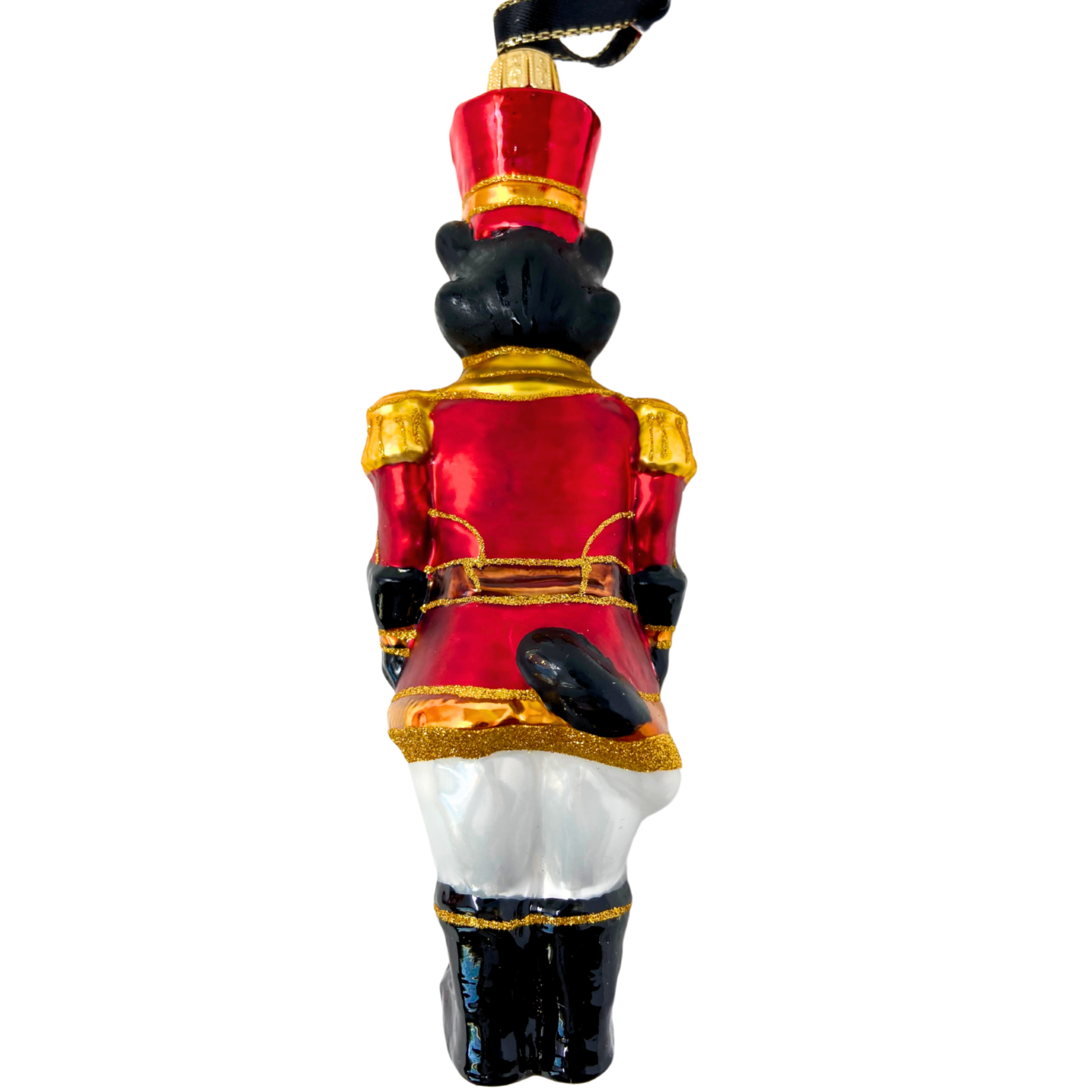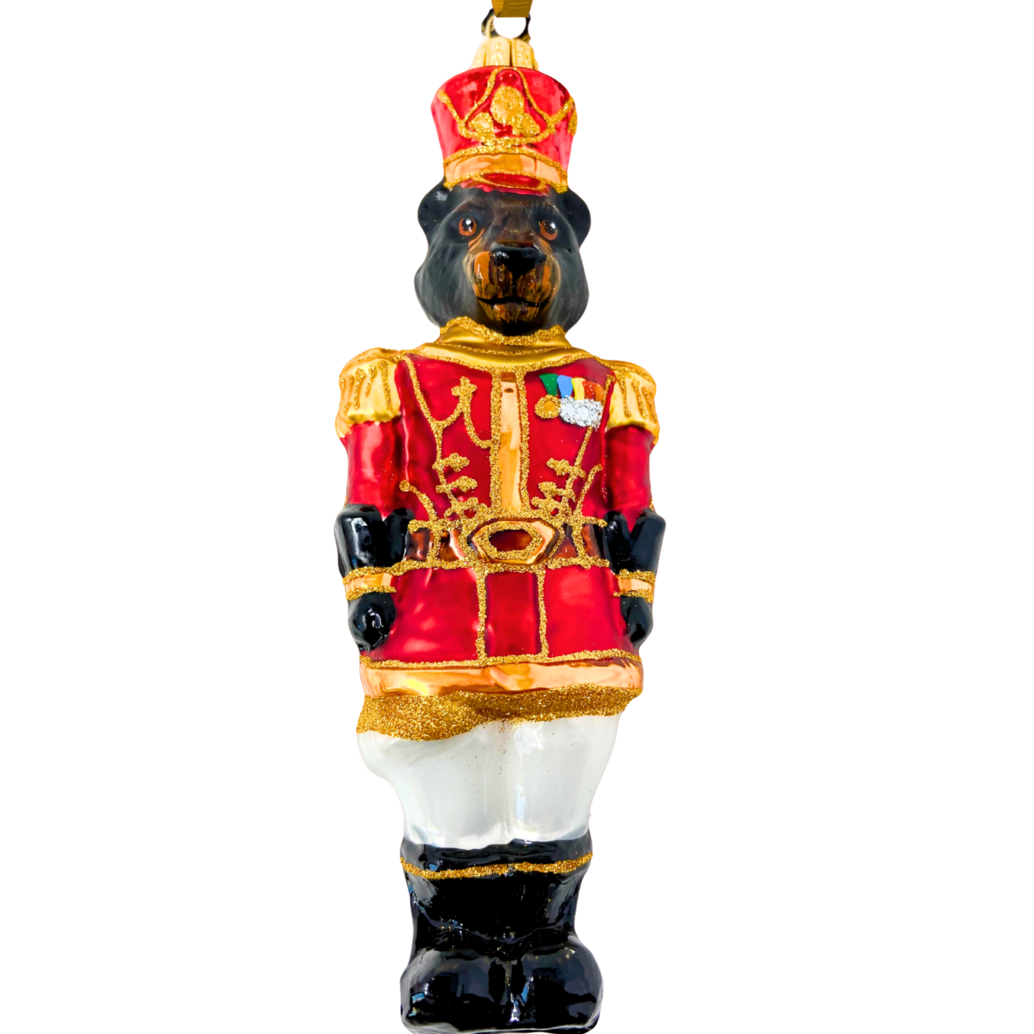 This charming glass Christmas ornament features a black bear dressed in a classic red Royal Guard uniform, complete with gold accents and a tall red hat. A whimsical nod to British tradition, perfect for adding character and charm to your holiday tree.