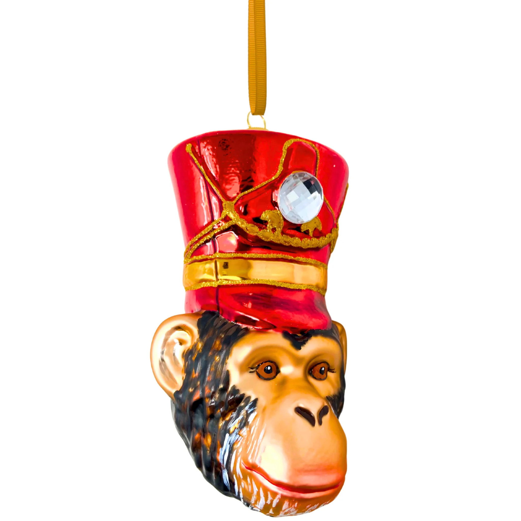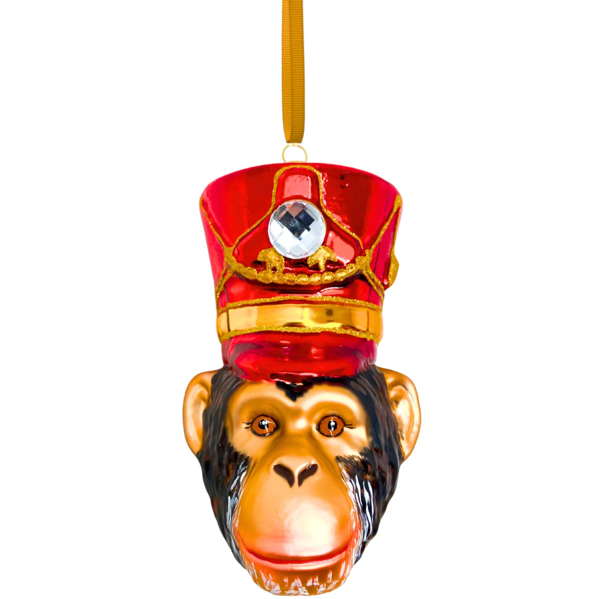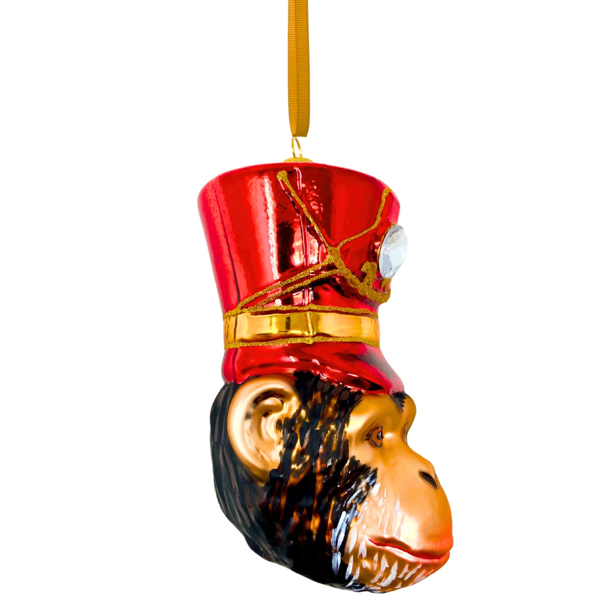 The cheeky chimp’s expressive face is crafted with exquisite detail, showcasing its curious eyes and endearing features. It’s topped off with a ruby-red regiment cap, complete with a sparkling jewel that adds a touch of regal elegance. The contrast of the vibrant red cap against the natural tones of the chimpanzee’s face creates a delightful and whimsical look, perfect for animal lovers or anyone who enjoys quirky, statement-making ornaments.