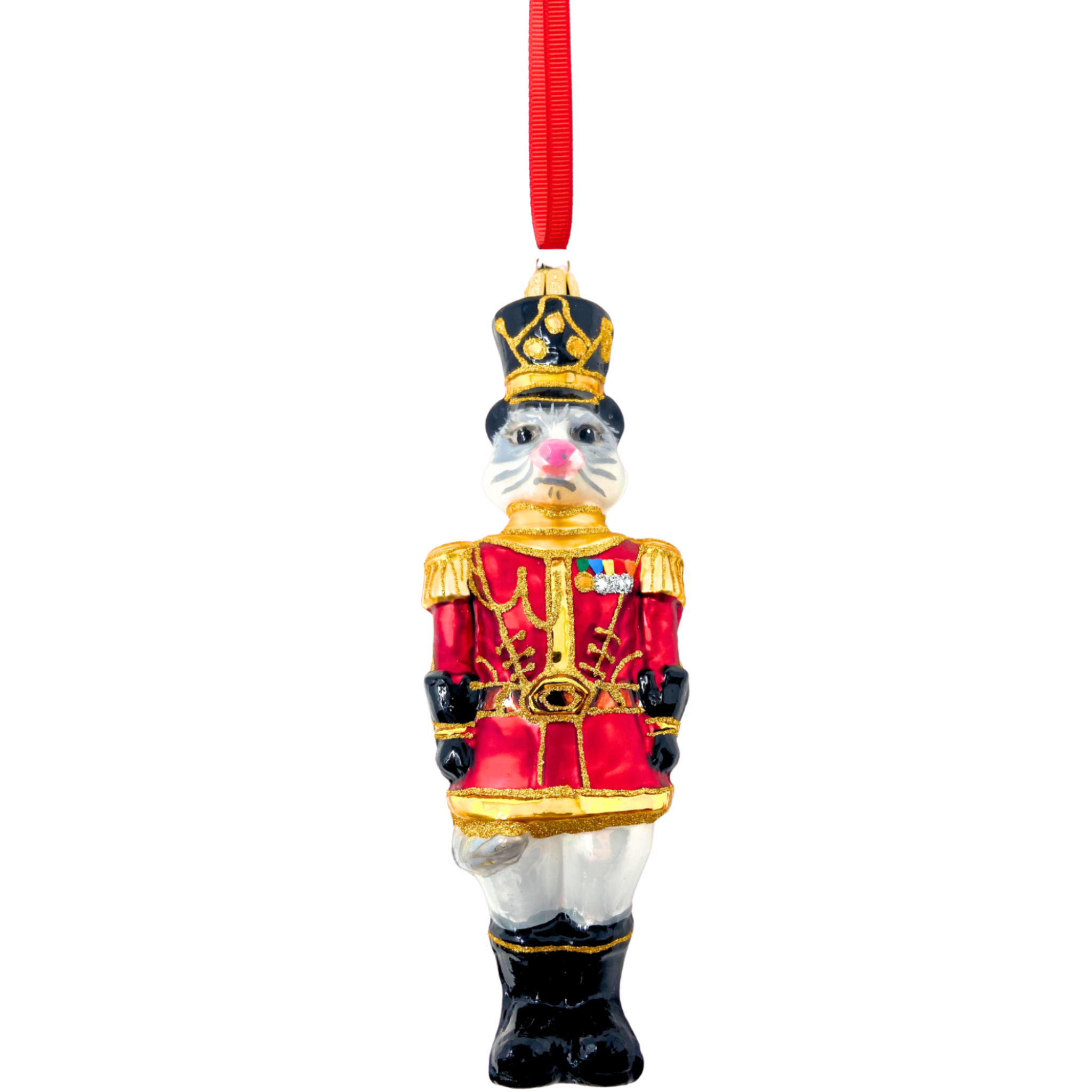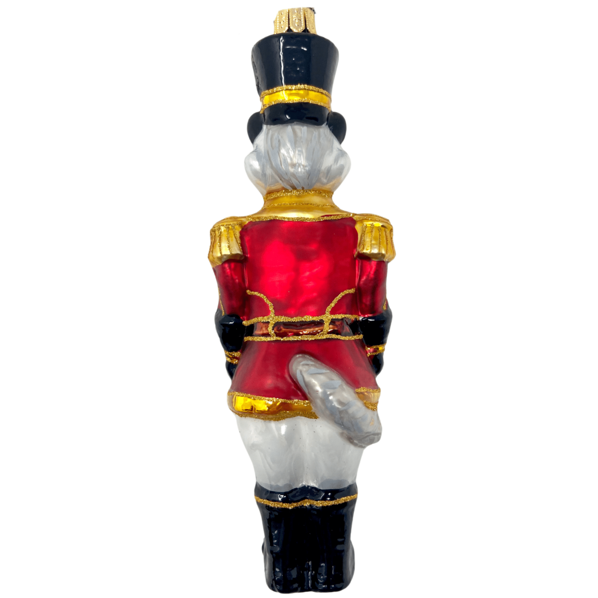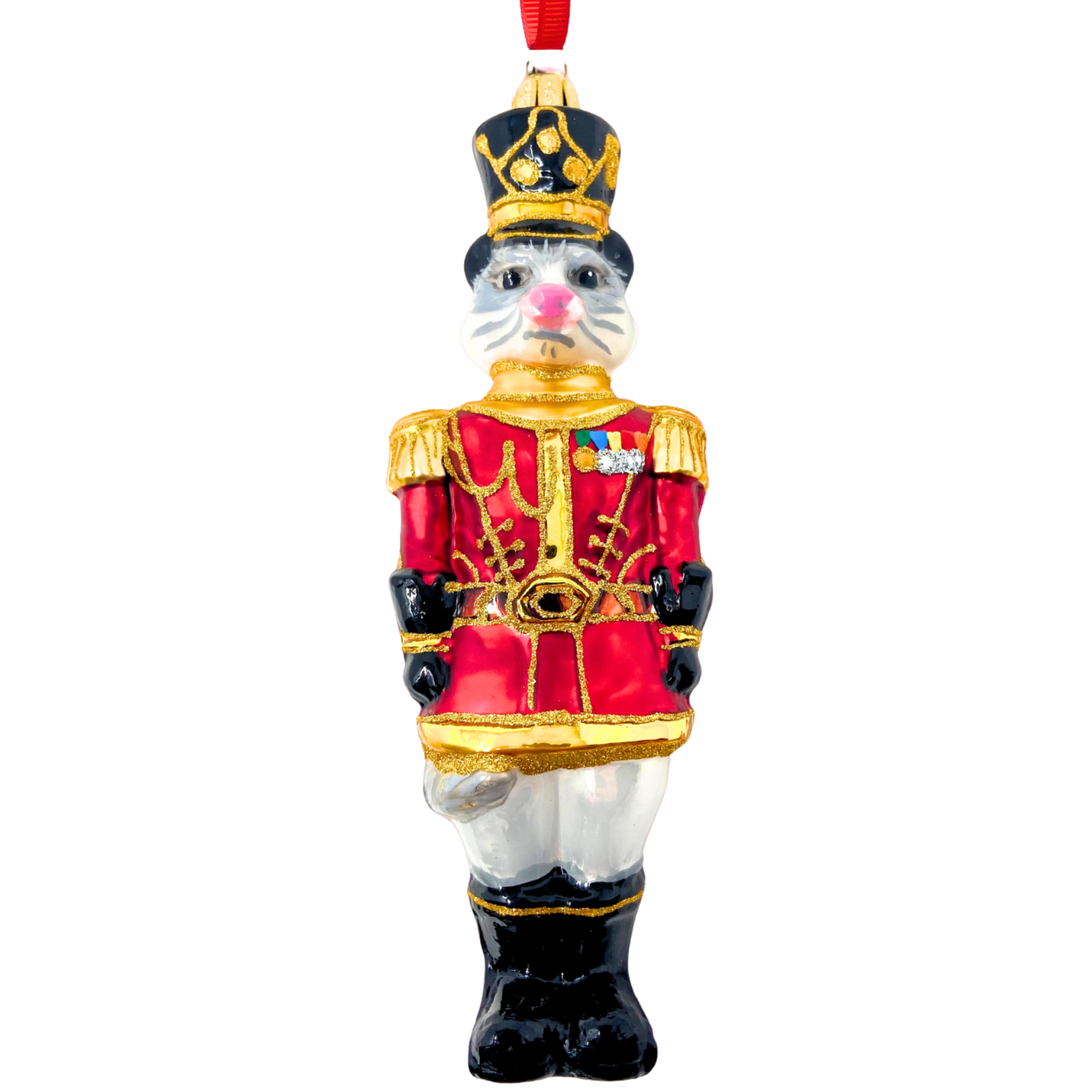Dressed in a classic British royal guard uniform - complete with a tall black bearskin hat and bright red coat - this delightful opossum brings a whimsical twist to tradition. Crafted from high-quality blown glass and hand-painted with intricate details, this ornament sparkles with festive glitter accents and a glossy finish. Whether you're a fan of opossums, a collector of unique ornaments, or just love a good conversation piece, this noble little marsupial is sure to stand at attention on your tree with pride.