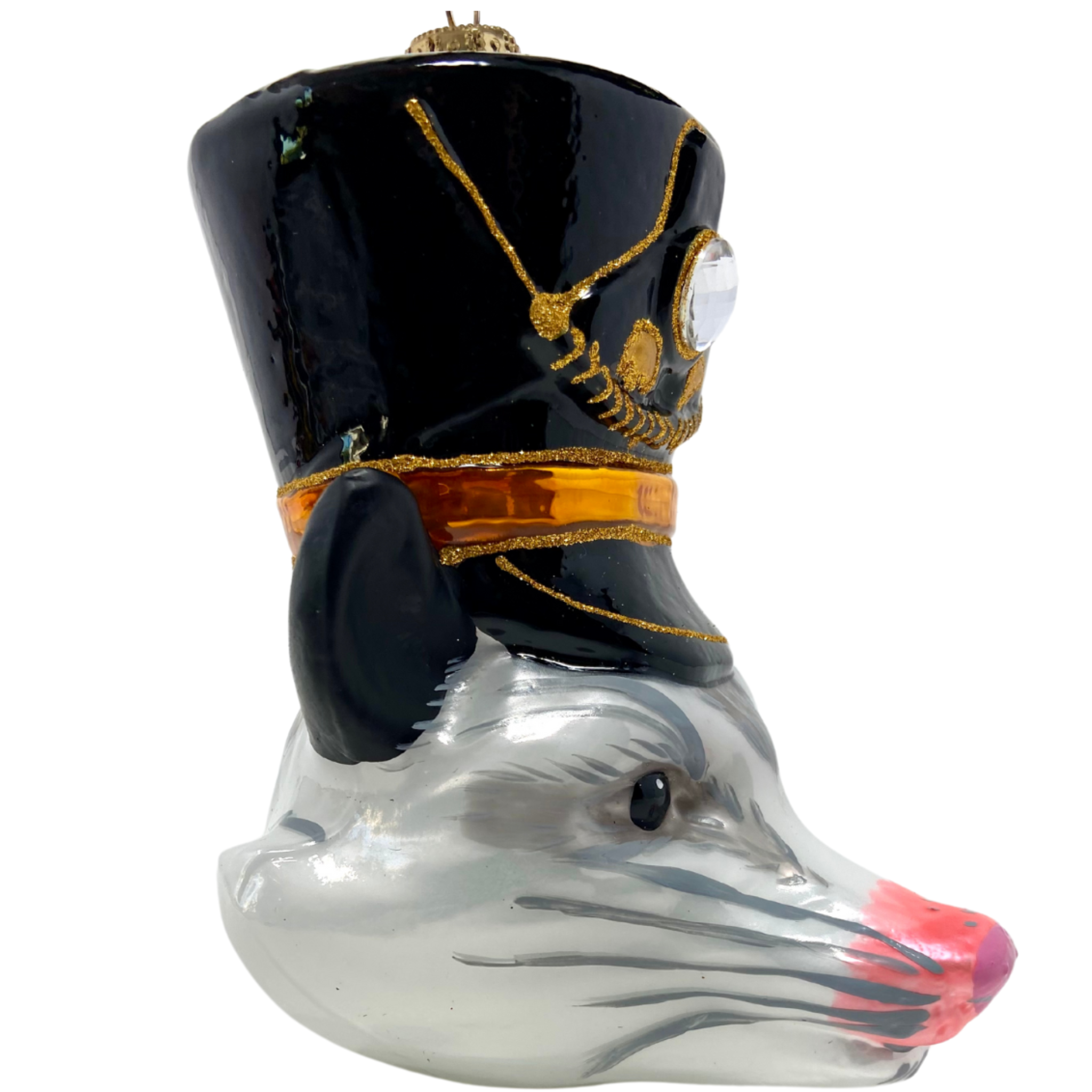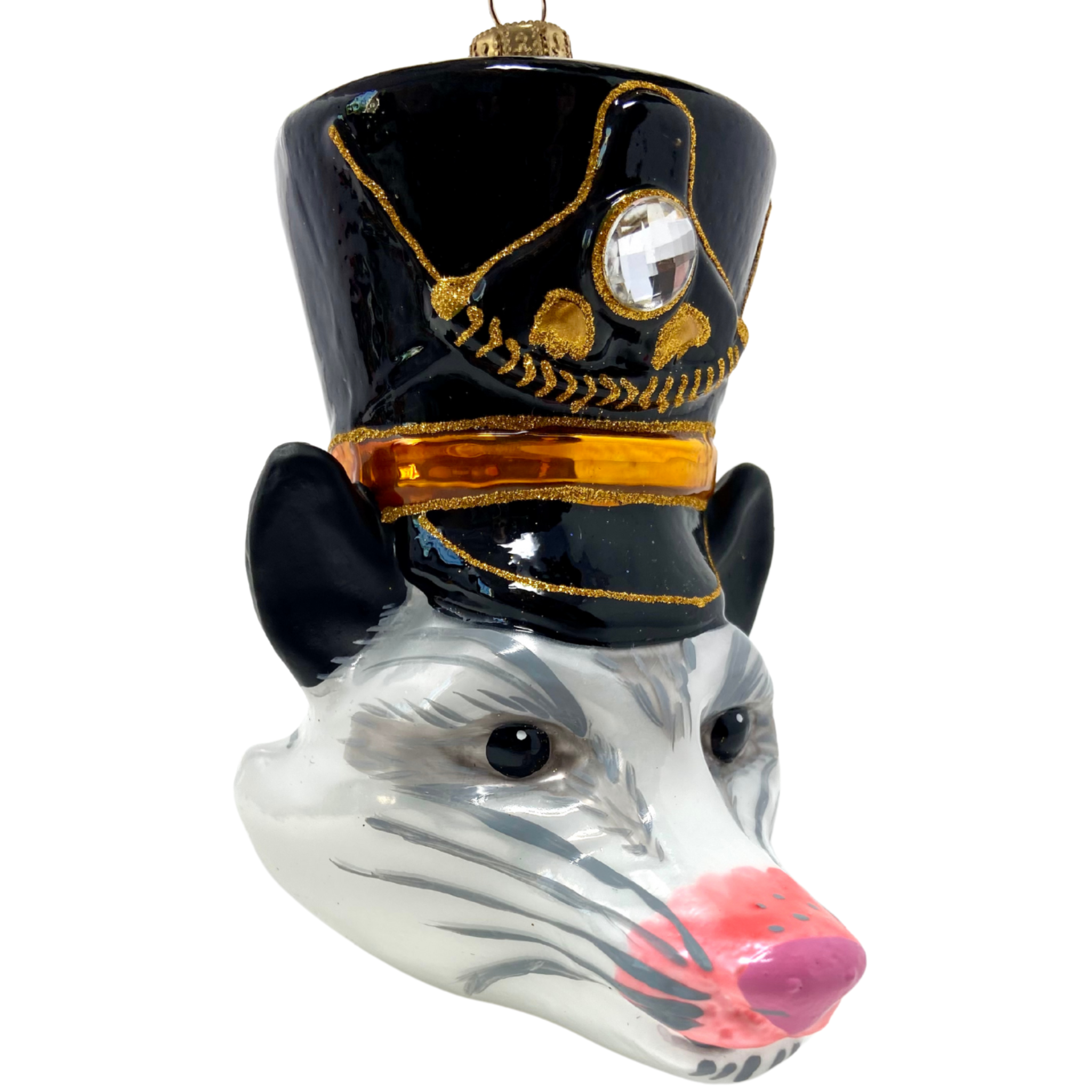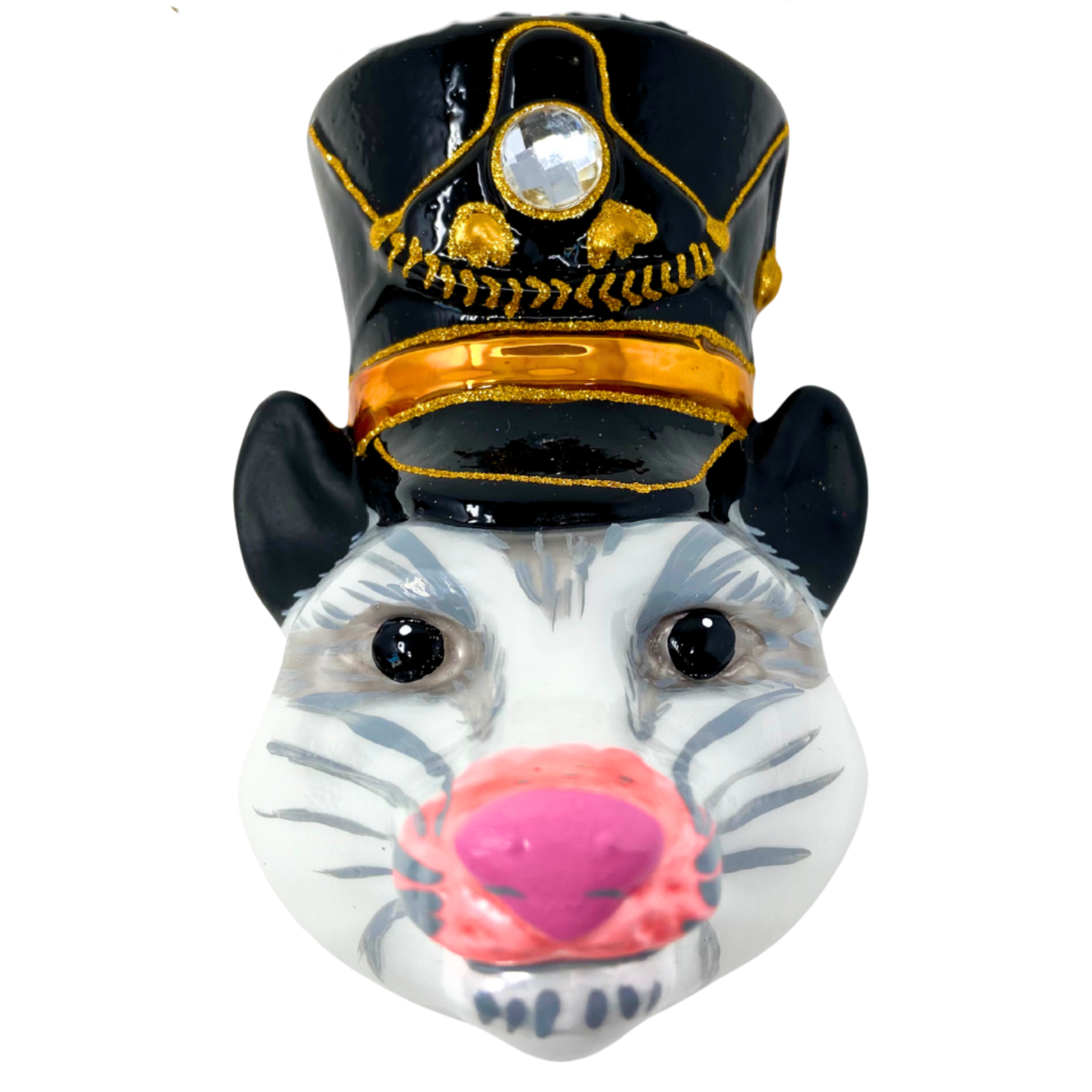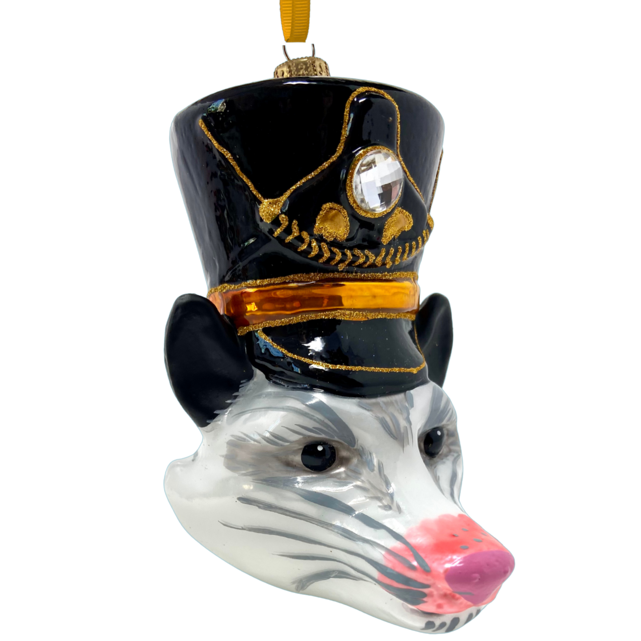 Add a dash of unexpected charm and regal whimsy to your holiday décor with this with this ornament, featuring a distinguished black soldier’s hat adorned with elegant gold details. This quirky yet classy ornament pairs the playful personality of an opossum with the stately flair of ceremonial military style - perfect for those who love their Christmas decorations with a bit of character.