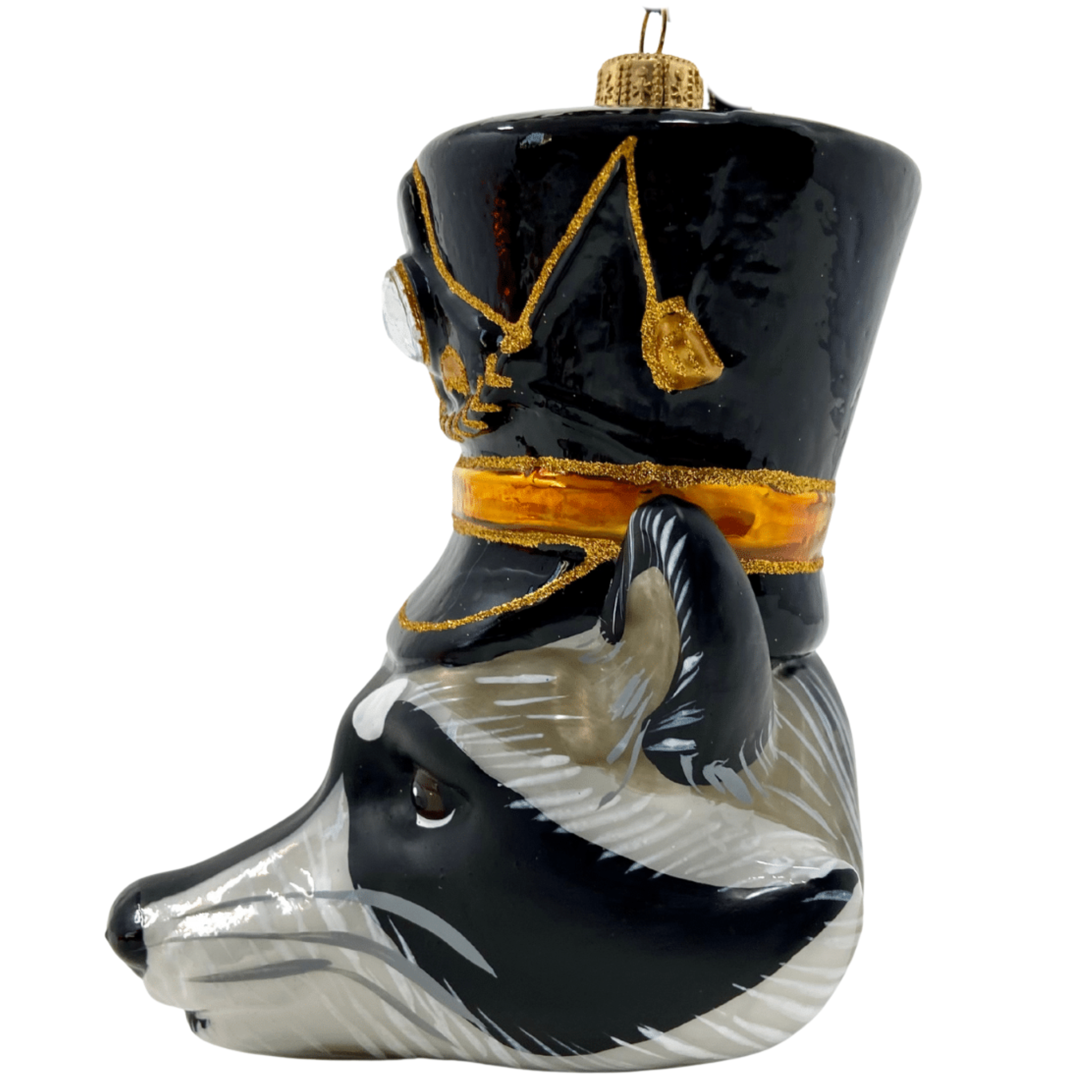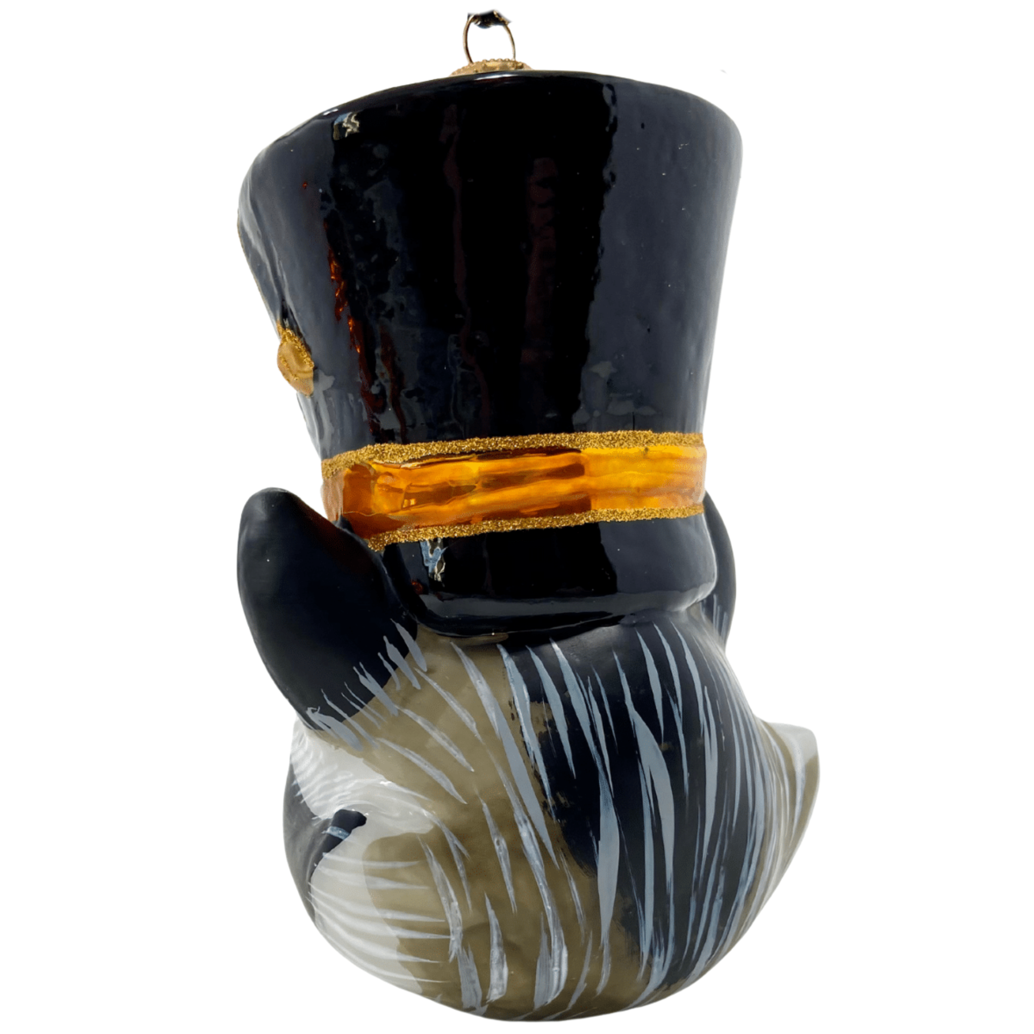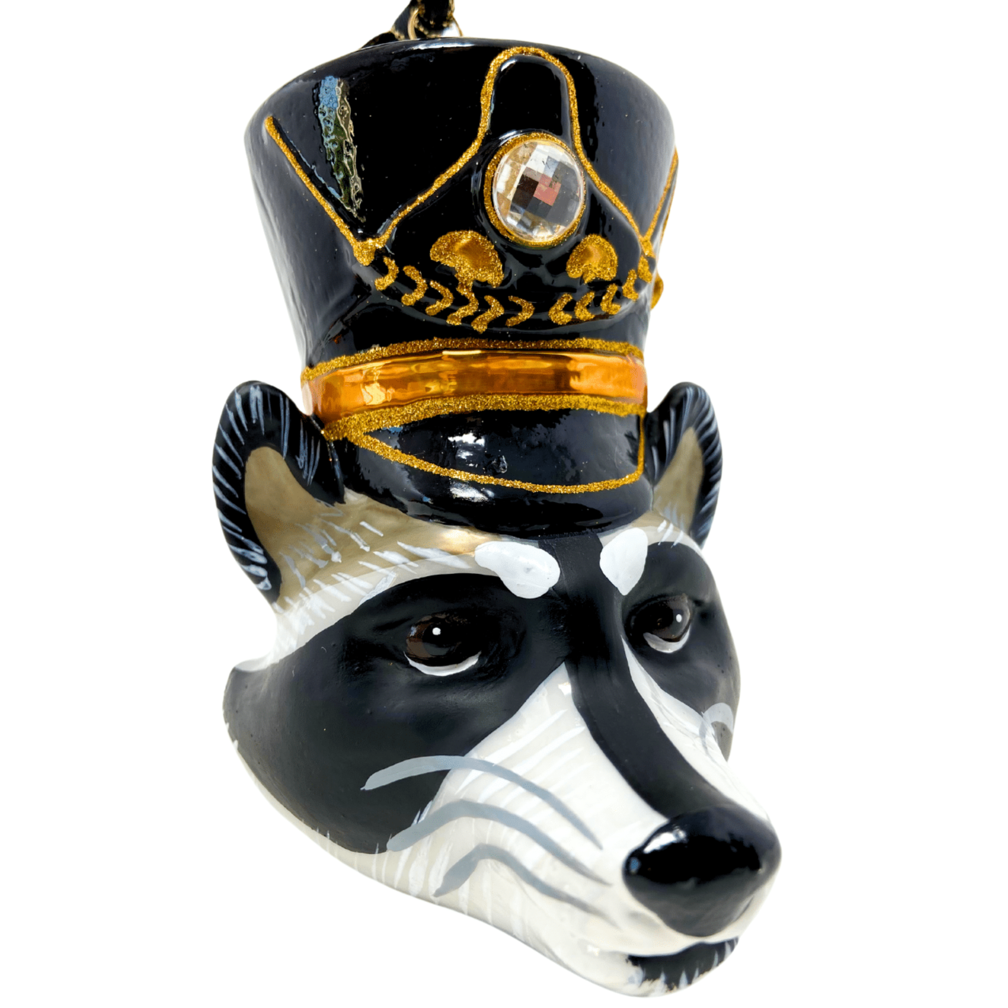 Add a touch of woodland charm to your tree with this raccoon head glass Christmas ornament, featuring a mischievous expression and a stylish black hat adorned with elegant gold details. A playful yet classy addition to your holiday decor.