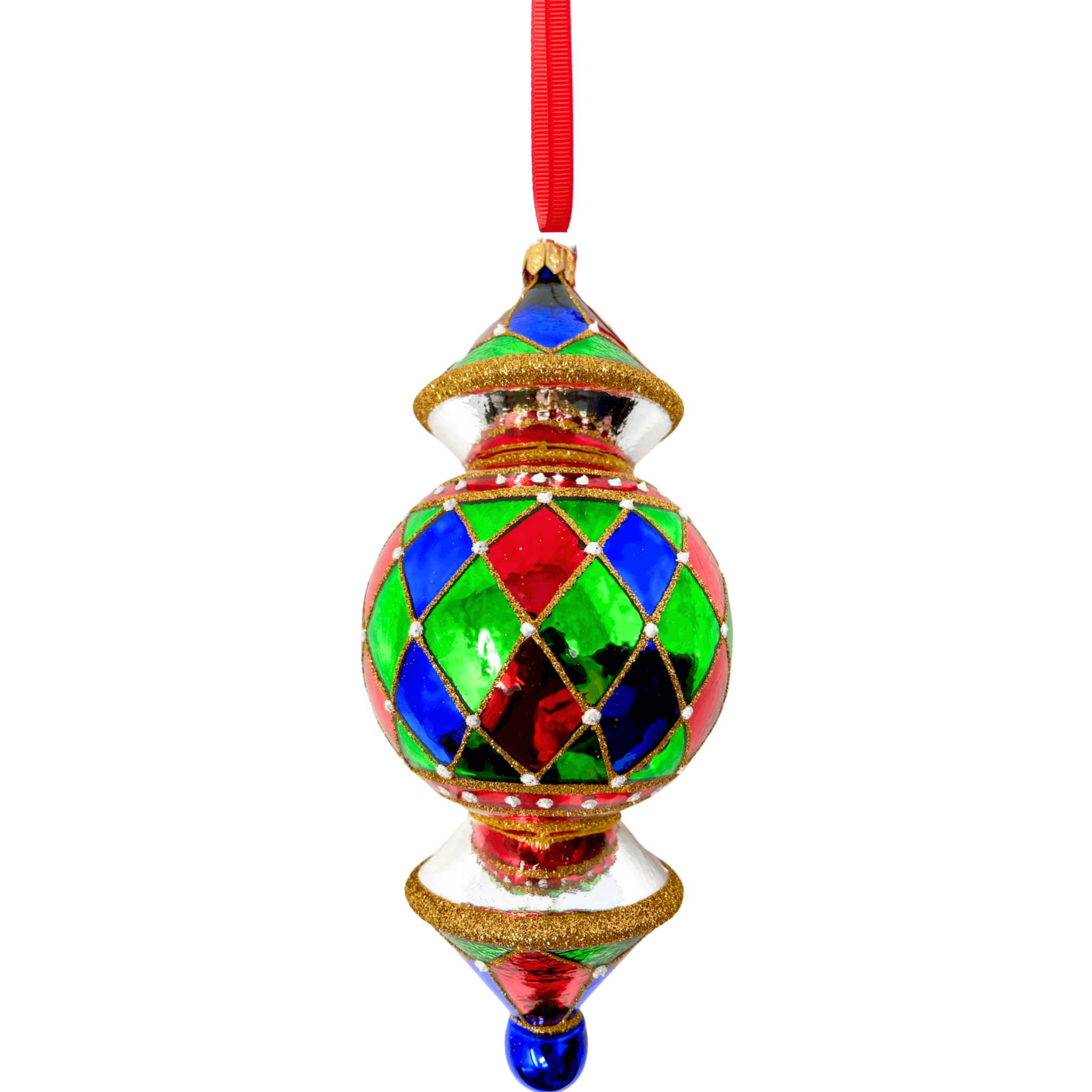 Add festive sparkle to your tree with this elegant glass Christmas ornament, featuring a diamond design in vibrant blue, green, and red, all outlined with shimmering glitter for a dazzling holiday touch.