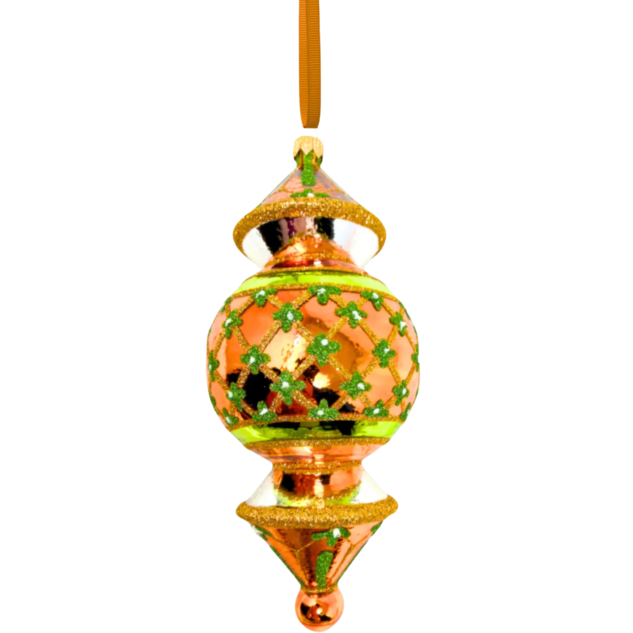 Vibrant and playful, this ornament brings a burst of retro-inspired cheer to your holiday décor. Its bold two-tone glass base is wrapped in a glittering grid pattern, delicately adorned with tiny floral accents that sparkle with charm and whimsy. Perfect for anyone who loves a pop of unexpected color and joyful detail.