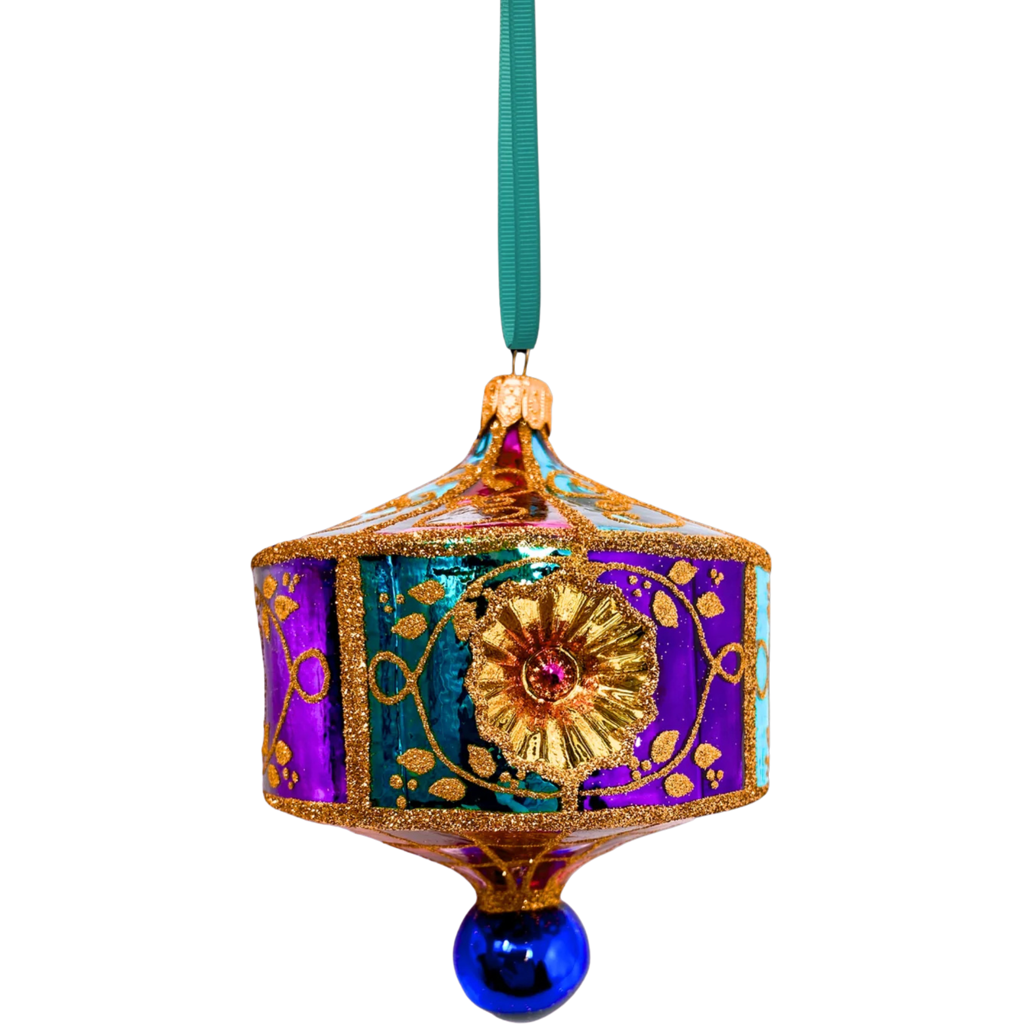 Bring an air of old-world splendor to your holiday décor with this captivating glass ornament, featuring a hand-painted stained-glass motif that shimmers in rich jewel tones of emerald and amethyst. Encased in delicate filigree gold, the design evokes the artistry of frescoed cathedral walls - ornate, luminous, and timeless. Each detail is thoughtfully rendered to reflect light beautifully, making this ornament a radiant focal point on any tree. A true heirloom piece for those who cherish elegance and craftsmanship.