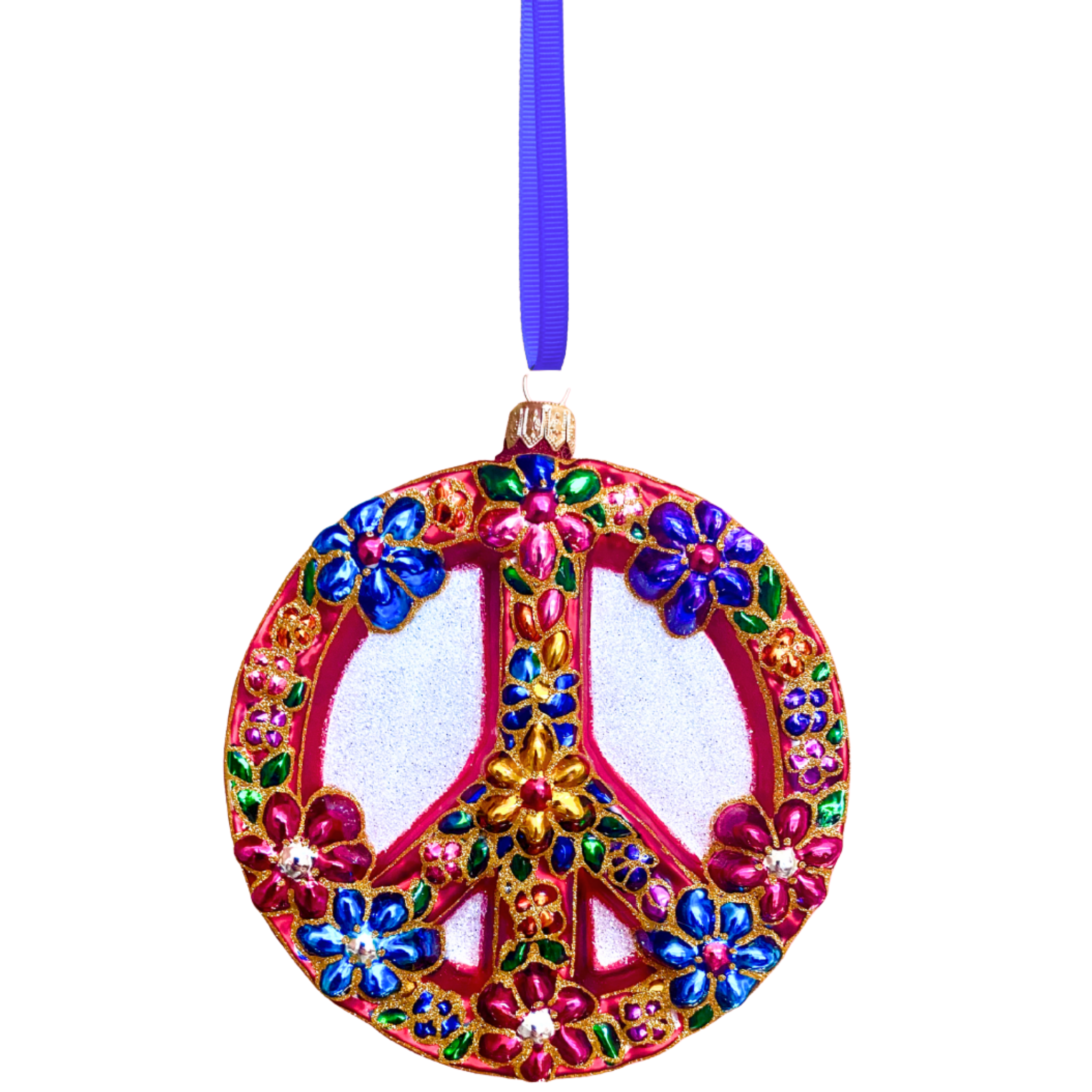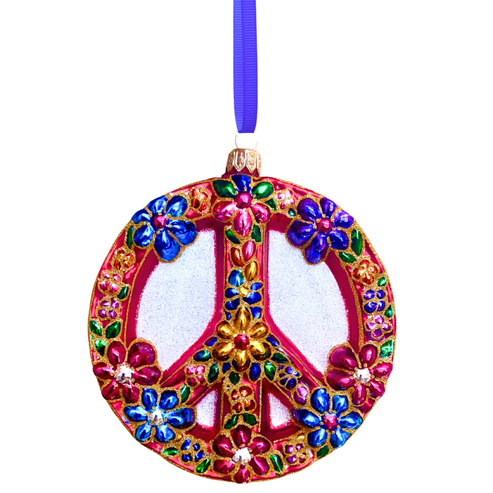 Celebrate the season with a message of harmony and beauty with this blooming ornament. Featuring a classic peace symbol beautifully embellished with delicate, hand-painted flowers in soft, cheerful colors, this ornament blends vintage charm with timeless elegance. The floral details add a touch of nature-inspired serenity, making it perfect for boho, retro, or whimsical tree themes.