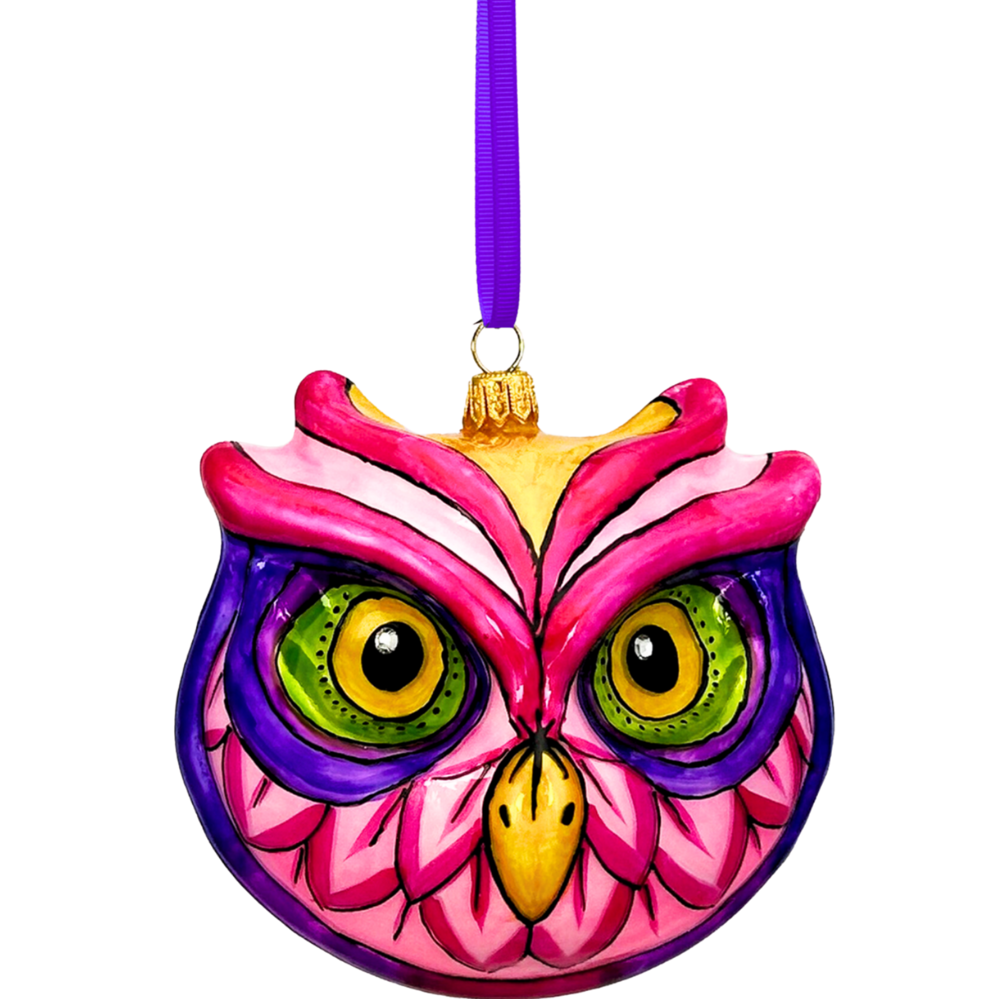Add a touch of enchantment to your tree with this striking owl head glass ornament, featuring saturated pinks and deep violets that shimmer with bold elegance. Piercing green-gold eyes bring this mystical creature to life, making it a captivating centerpiece for any holiday display.