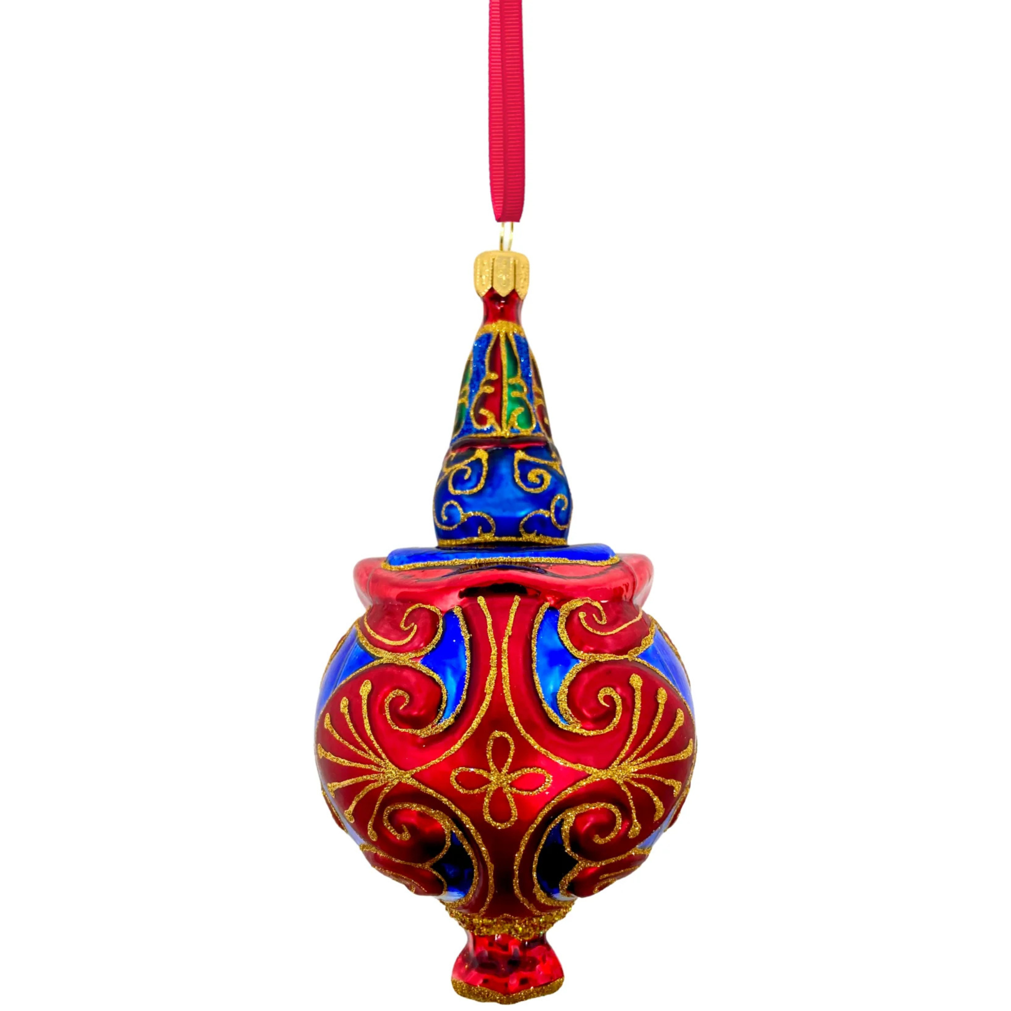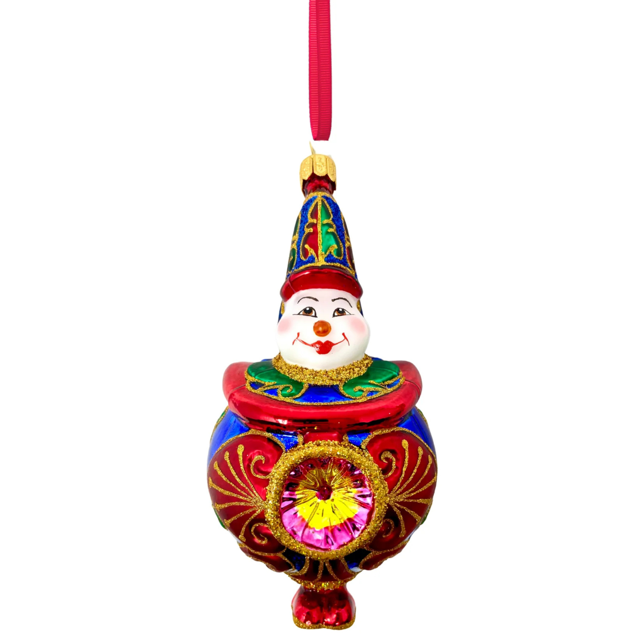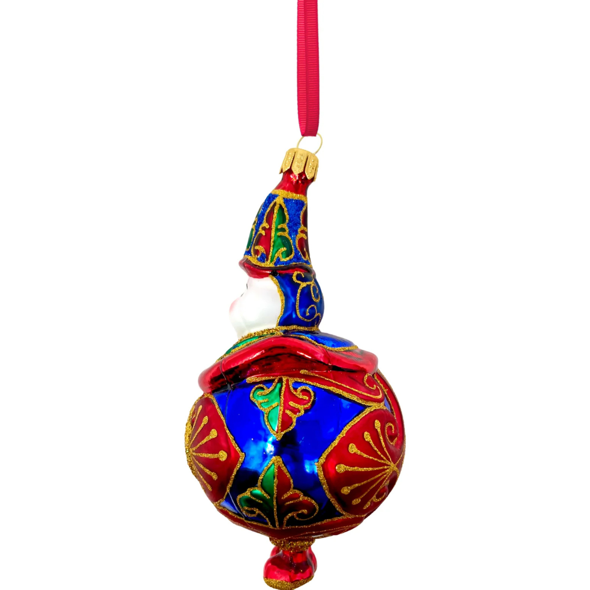 The ringmaster ornament is a showstopper that brings the magic of the circus to your holiday decor. Decked in regal red and imperial blue, the ornament features a dramatic robe with elegant curls of golden filigree, creating an aura of grandeur and sophistication. At the heart of the ornament, a striking pink reflector glows, adding a radiant pop of color and drawing the eye to the ringmaster’s commanding presence.