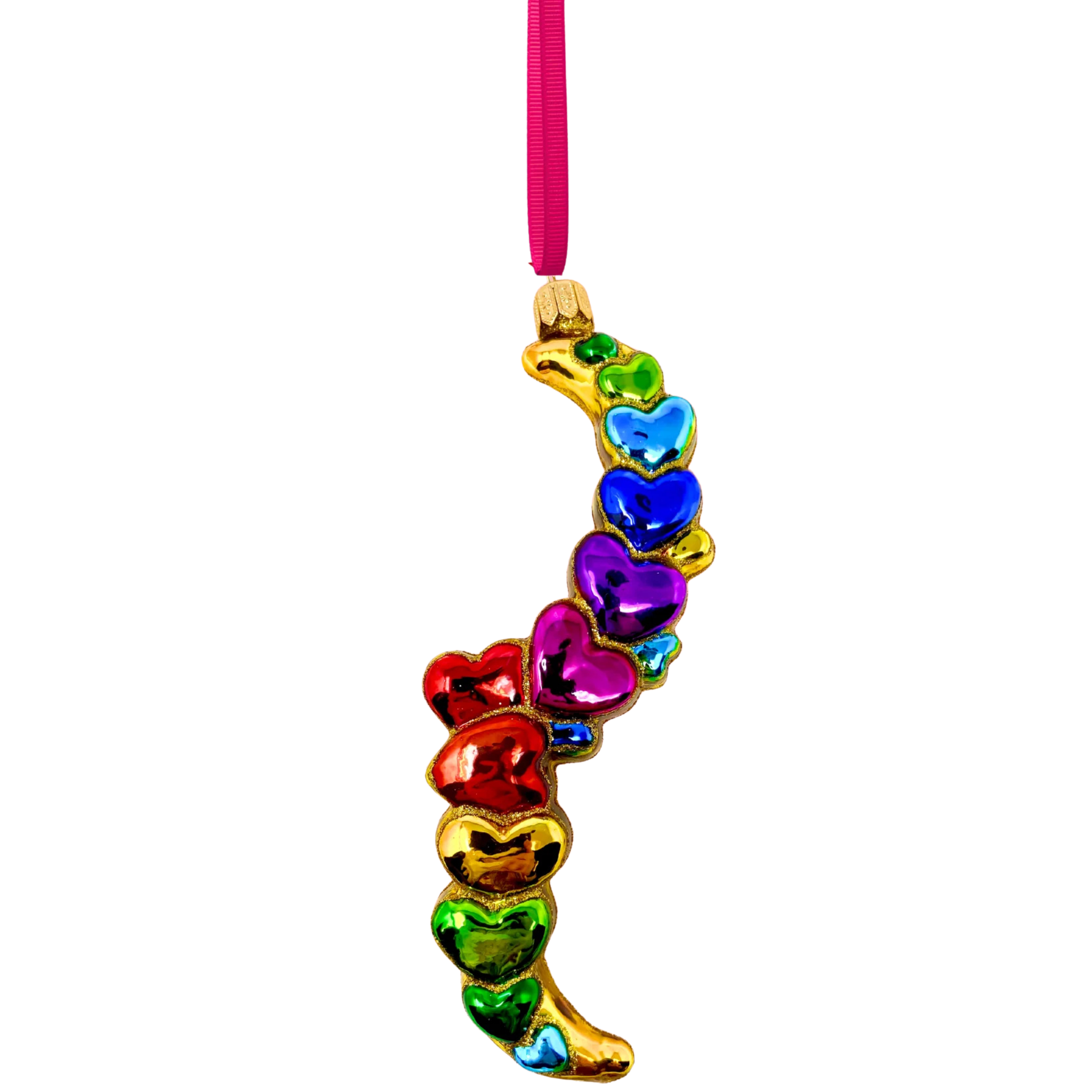 Add a burst of joy and color to your holiday decor with this whimsical glass ornament, featuring luminous hearts stacked in a playful swirl. The vibrant mix of colors radiates warmth and cheer, while the swirling design adds a sense of movement and fun. Perfect for bringing a lighthearted and festive spirit to your tree or display, this ornament is sure to catch the eye and spark conversation.
