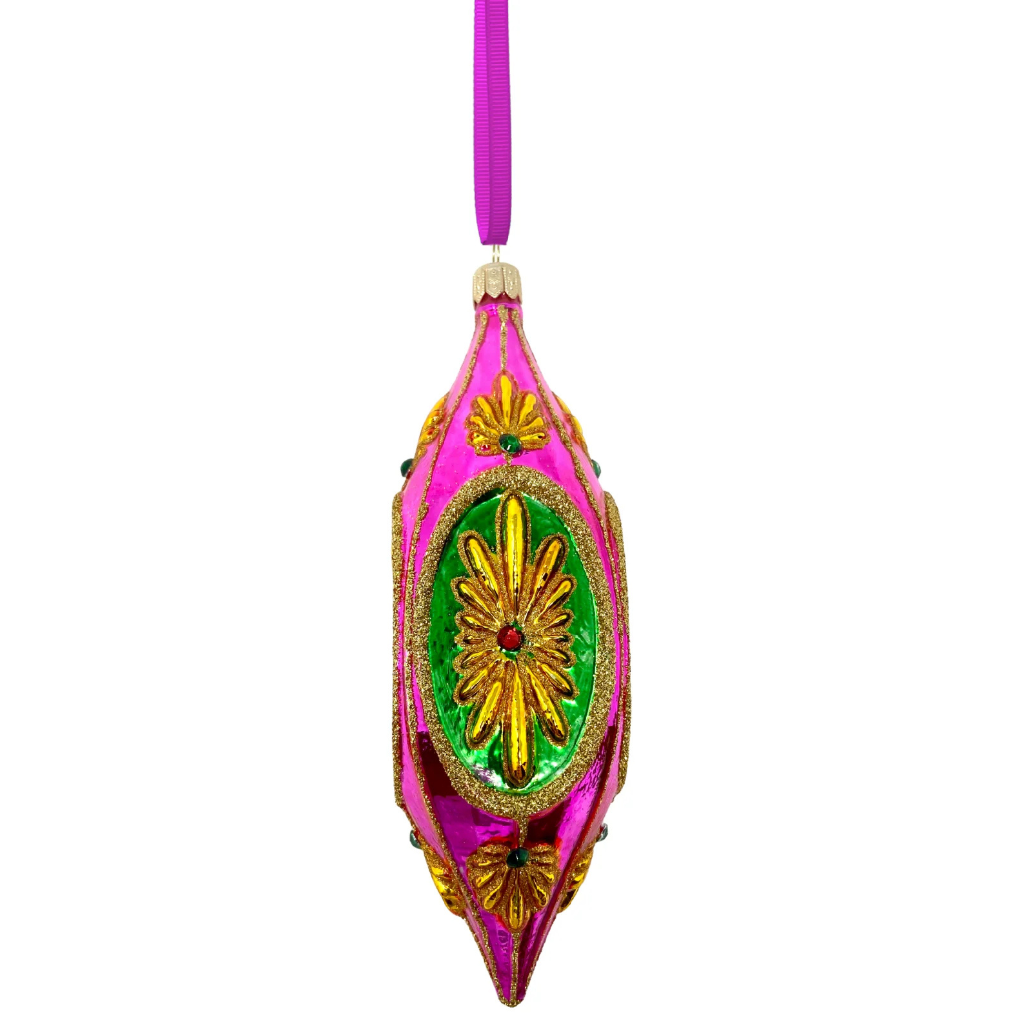 Sabrina exudes 1960s ingénue charm, dressed in bold hot fuchsia with a refreshing mint green reflector core. Regal gold floral accents and gemstone embellishments elevate her understated elegance, making her the subtle yet radiant star of your ornament collection.