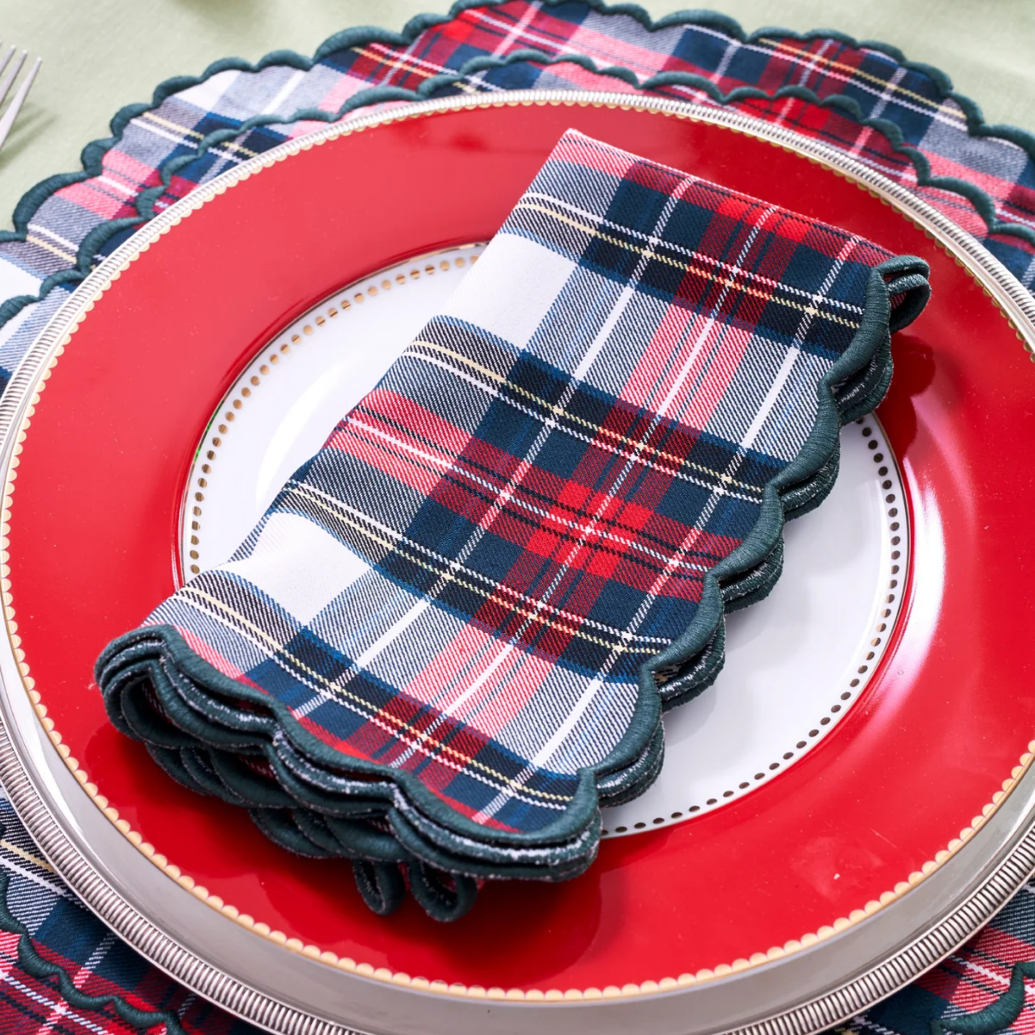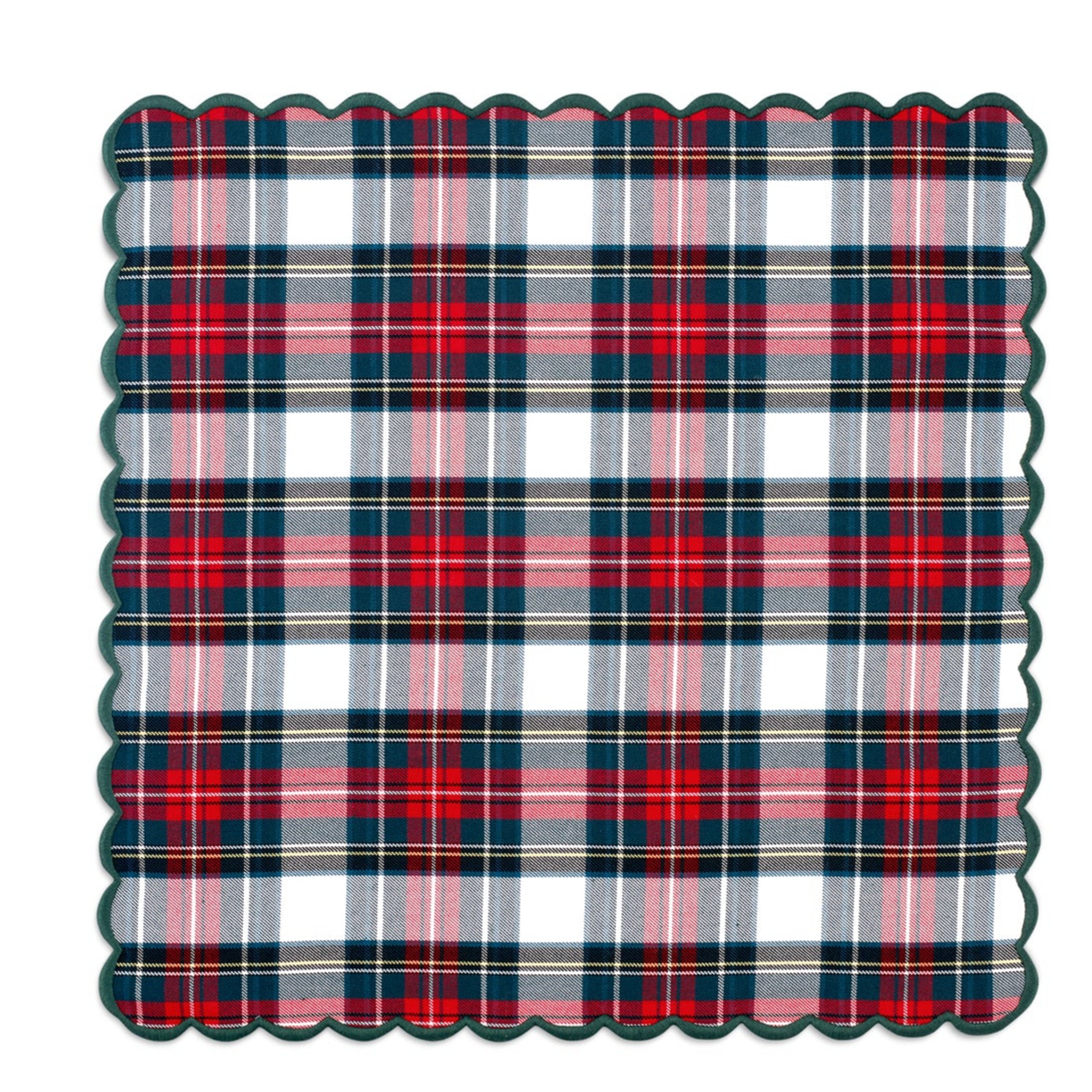 The treated fabric of this tartan plaid dinner napkin makes it liquid resistant. Add to your holiday spirit and table with the scalloped edge stylings of these napkins. Sold individually. This item is final sale and is not eligible for return. Click images for greater detail.