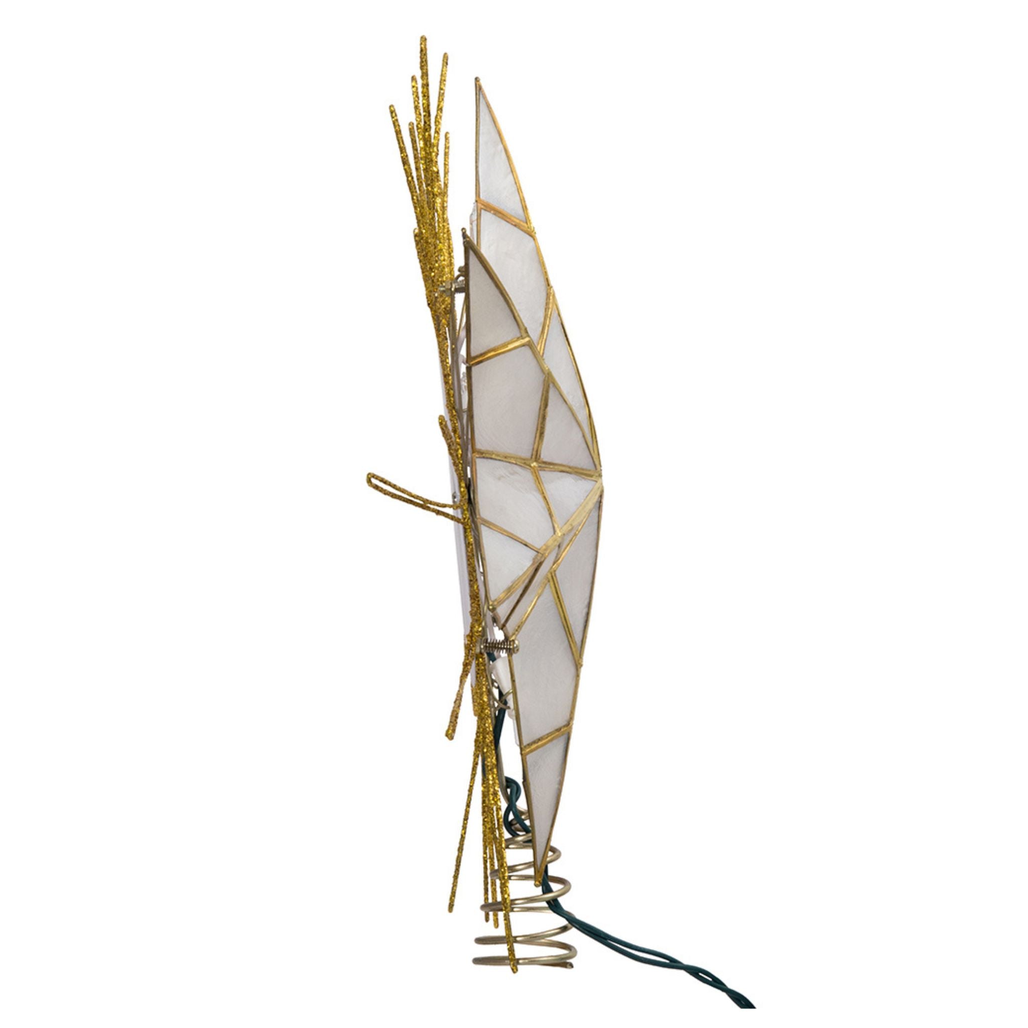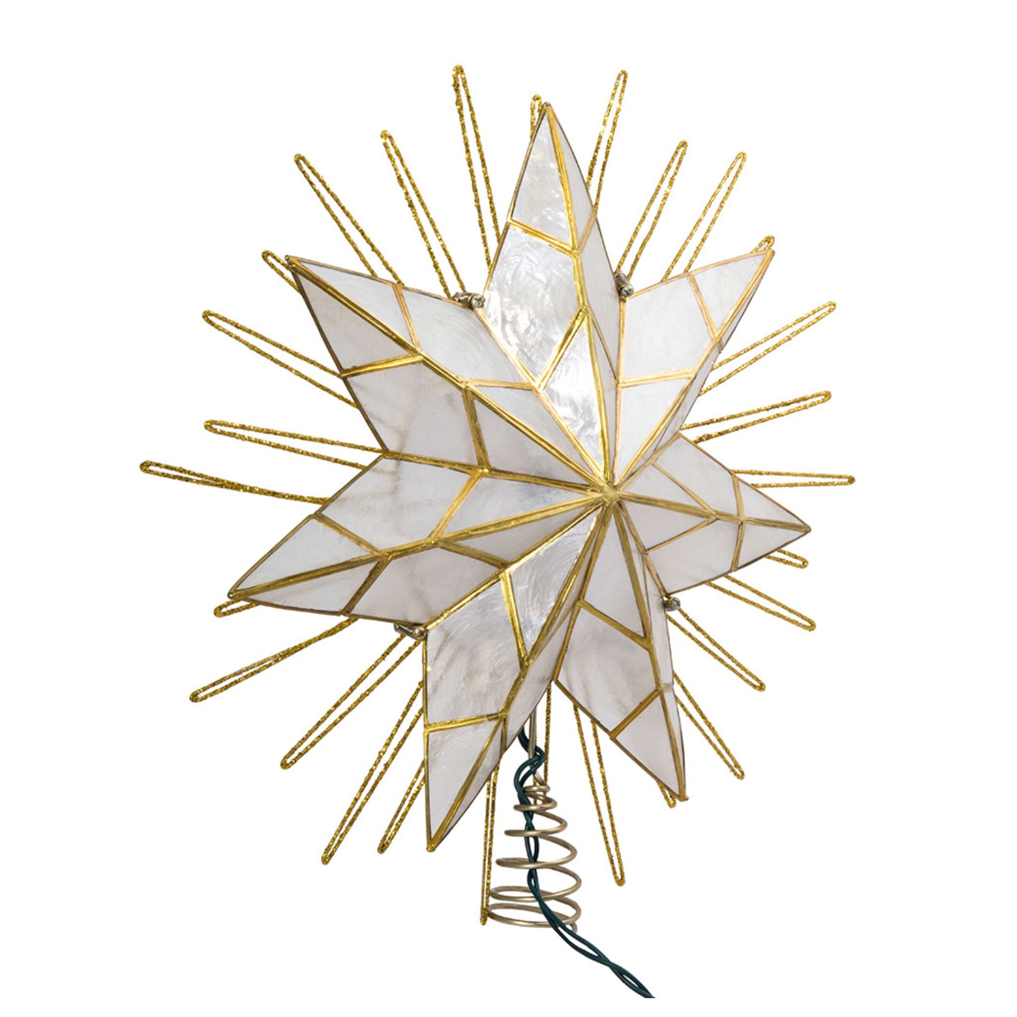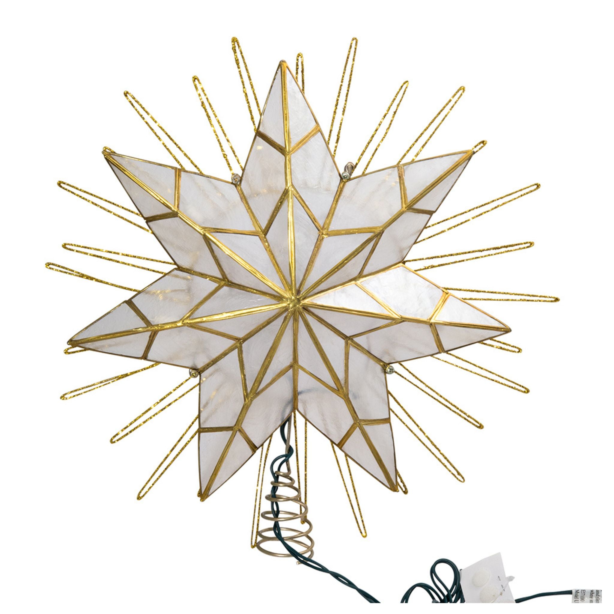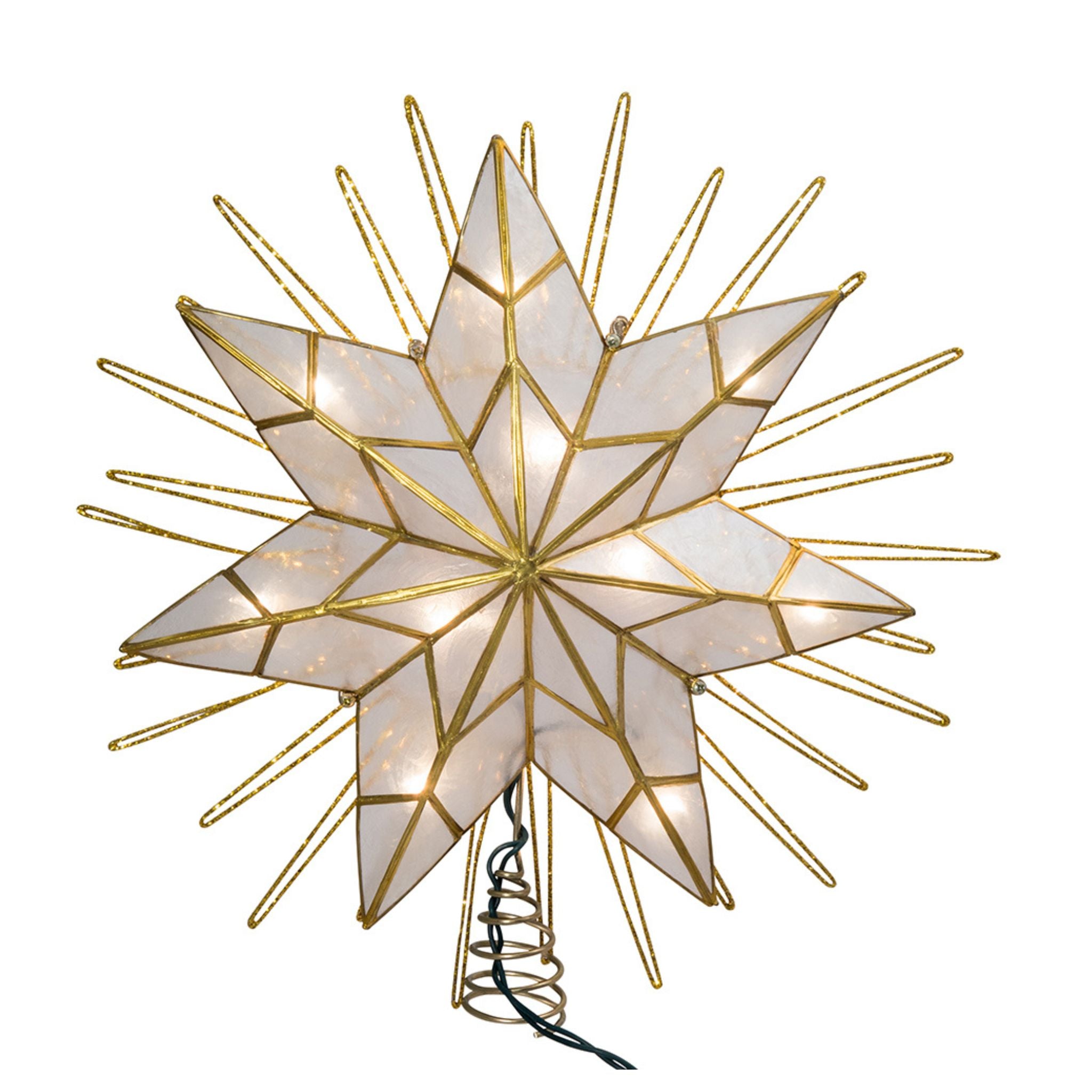 This 7-point natural capiz star-lighted treetop is a beautiful way to accent the lighting and décor of your Christmas tree. Featuring a large 7-point star made of natural capiz giving it a frosted look, framed by several surrounding wire ray accents, this bright star has a glittery gold-plated finish.