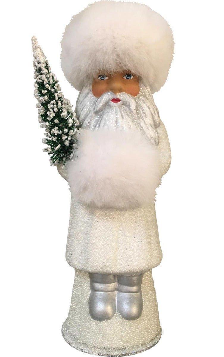 Ino Schaller inherited his father Carl’s business, but by the late 1940s, he moved into pressed cardboard figures, and by the plastic 1960s was producing pressed forms as well. The process of making Ino Schaller paper mache and composition figures takes seven days. On the first day, the craftsperson combines liquefied paper, clay, glue, and a few secret mineral ingredients. On the second day, the worker blends the mixture to a smooth consistency and pours it into a two-part plaster mold. In a short while, the plaster draws out some of the water content, leaving a thin paper mache shell. The crafter pours out the excess liquid, and the shell dries through the third day. On day four, the artisan dips the paper mache form in liquid plaster, creating a thin, smooth white skin for the hand painted details and trim. The plaster skin makes this a “composition” figure. On the sixth, seventh and eighth days, the artist applies layers of paint, fine details, and glaze, with drying time between each coat. Finally, the artists apply the finishing touches such as chenille, cellulose shavings, ground glass and mica. Ino Schaller Originals are Handmade from antique molds by the same workshop that made the originals 100 years ago. A true collectible, each limited-edition piece is signed by the artist. Today that is the Great Grandson of Ino Schaller, Thomas Schaller. Like the originals, these pieces are also traditional German candy containers; the base pulls off to reveal a hollow space where candy can be tucked away. This Russian Santa Claus with a white coat is holding a small Christmas tree. Measures: 10.75"H x 4.5"W x 4.5"D. Click on image for greater detail.