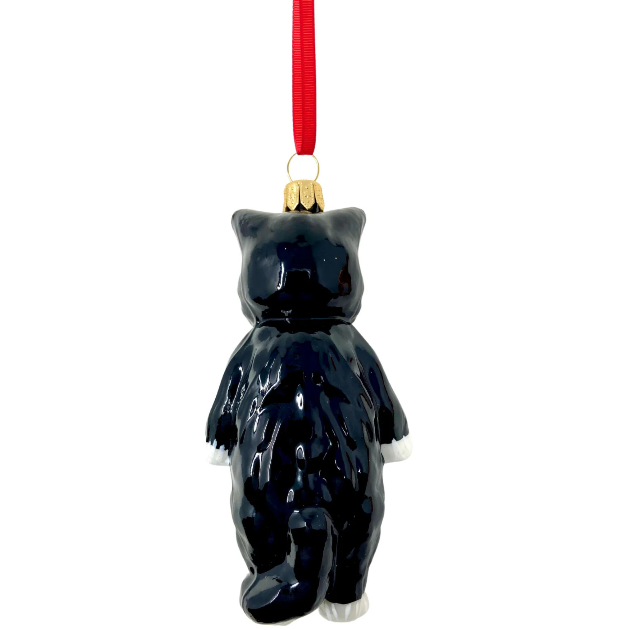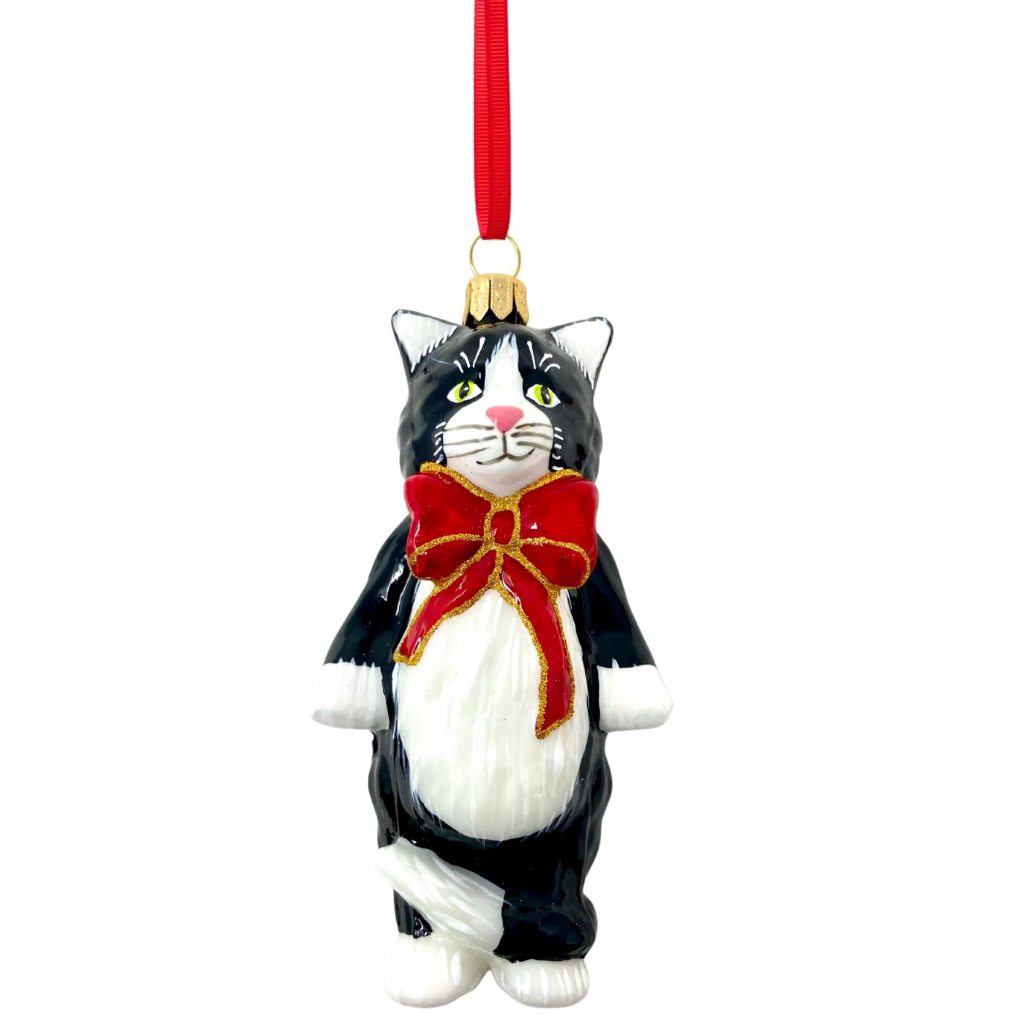 Add a touch of feline elegance to your tree with the Tuxedo Cat Glass Ornament. This charming ornament features a classic black-and-white tuxedo cat adorned with a festive red bow, capturing both sophistication and holiday cheer. A delightful keepsake for cat lovers and collectors alike.