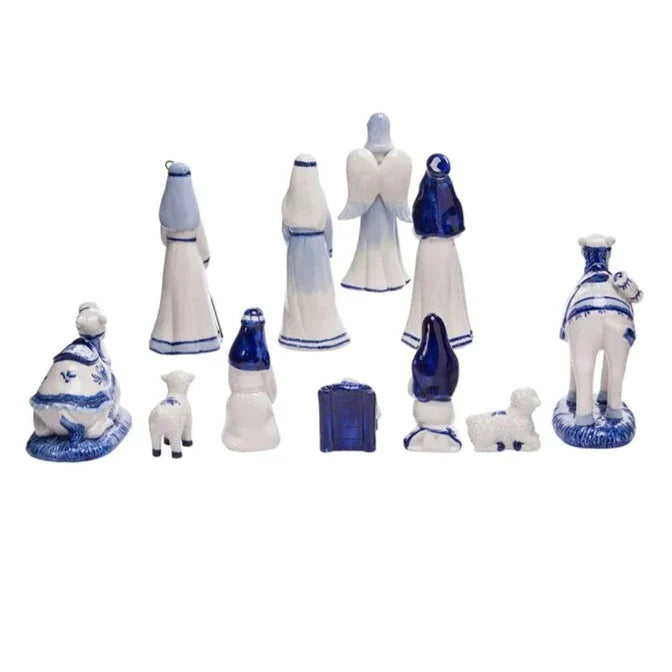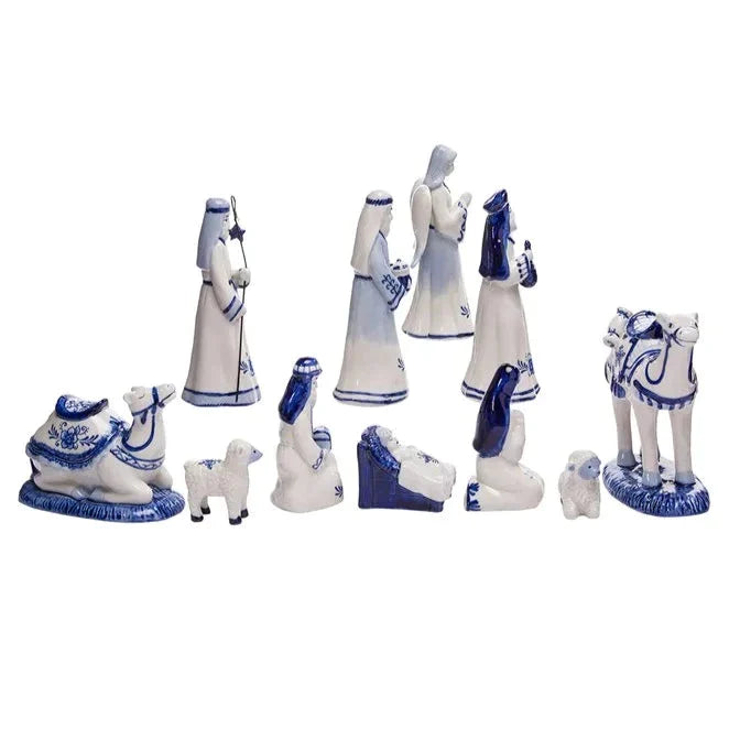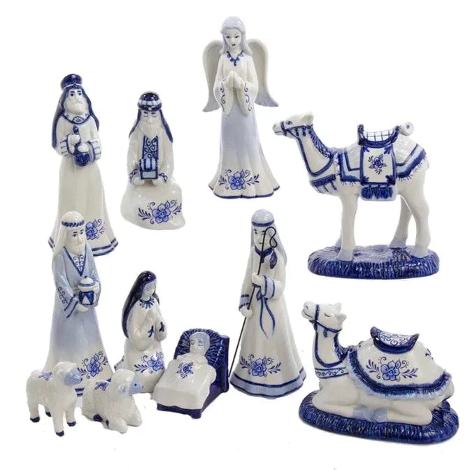 This Kurt Adler porcelain delft blue Nativity set is a beautiful way to add to your Christmas décor and to be reminded of the true meaning of Christmas. Features the characters from the nativity story in white porcelain with delft blue designs including, Baby Jesus, Mary, Joseph the Three Wise Men, an angel, two camels, and two sheep.