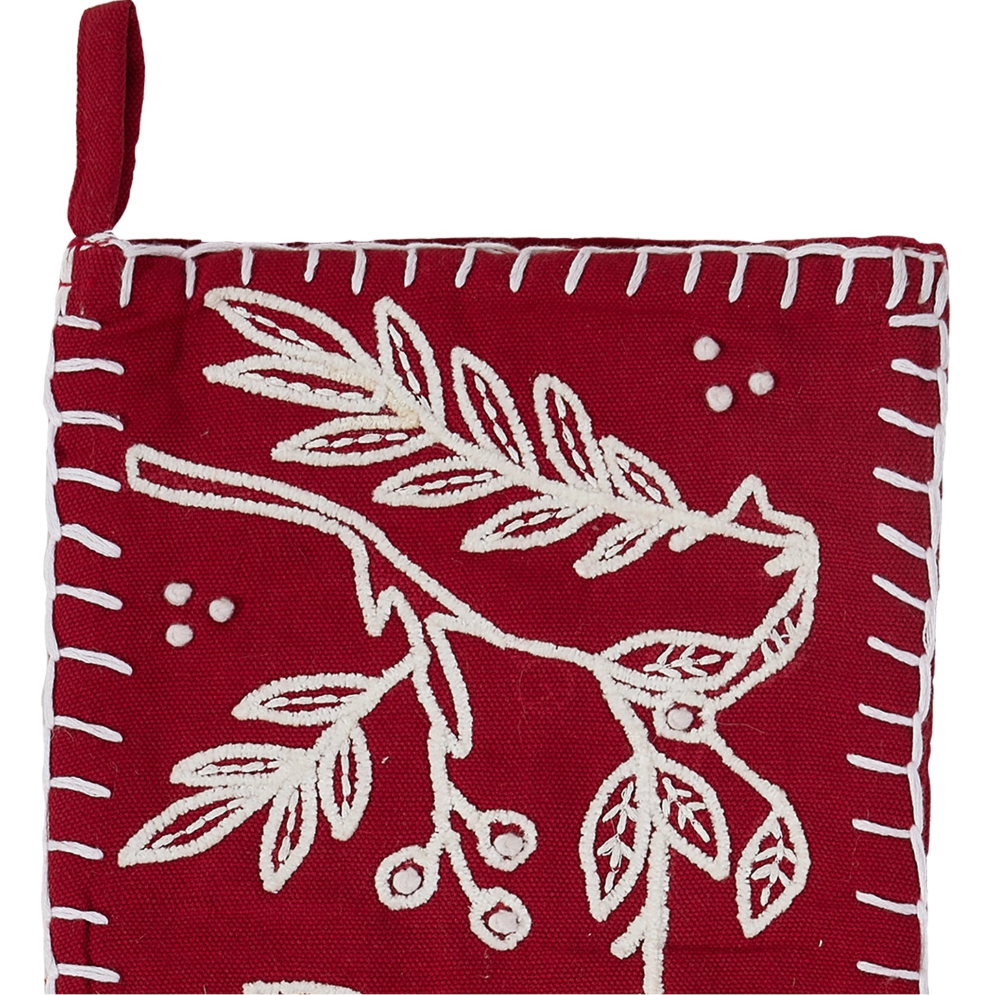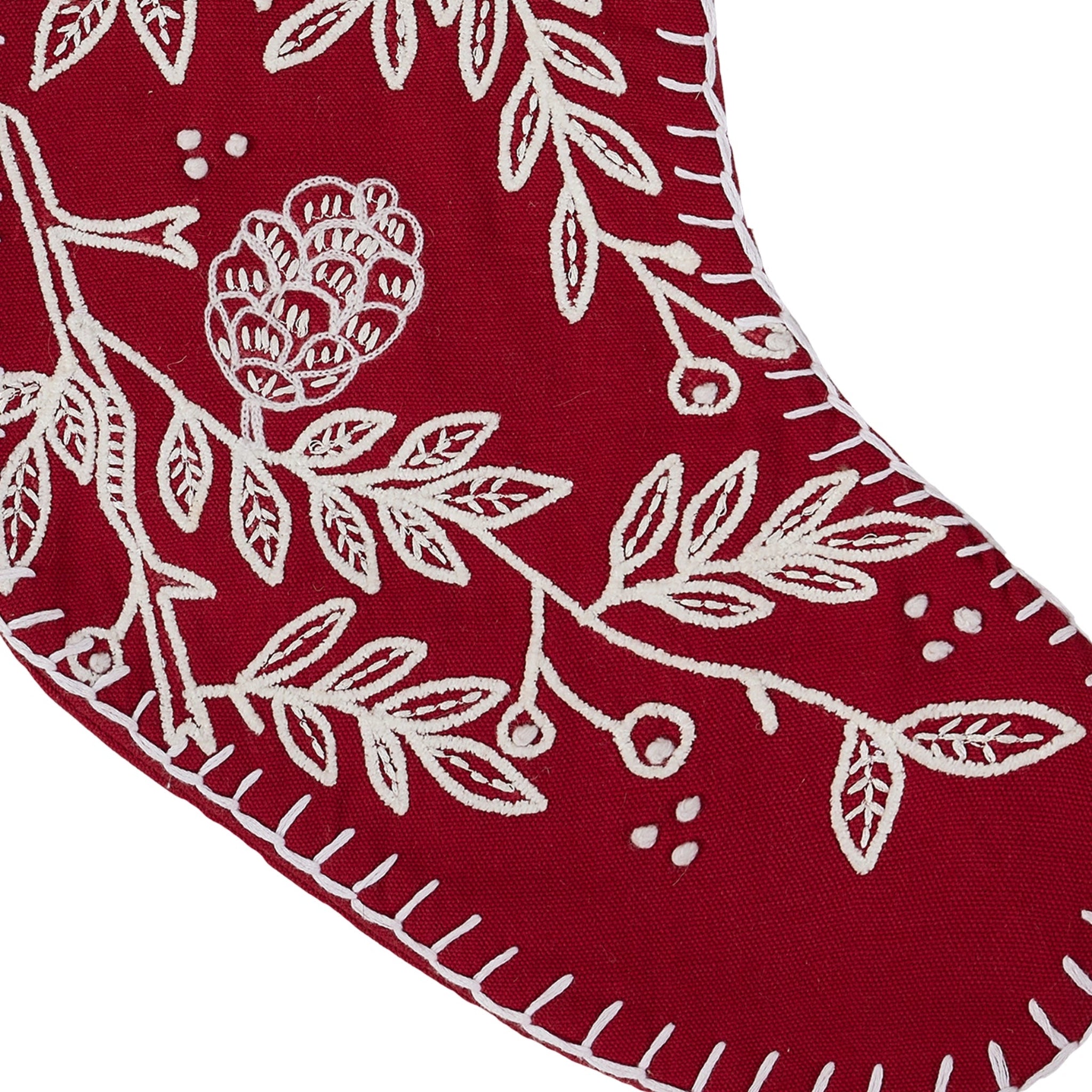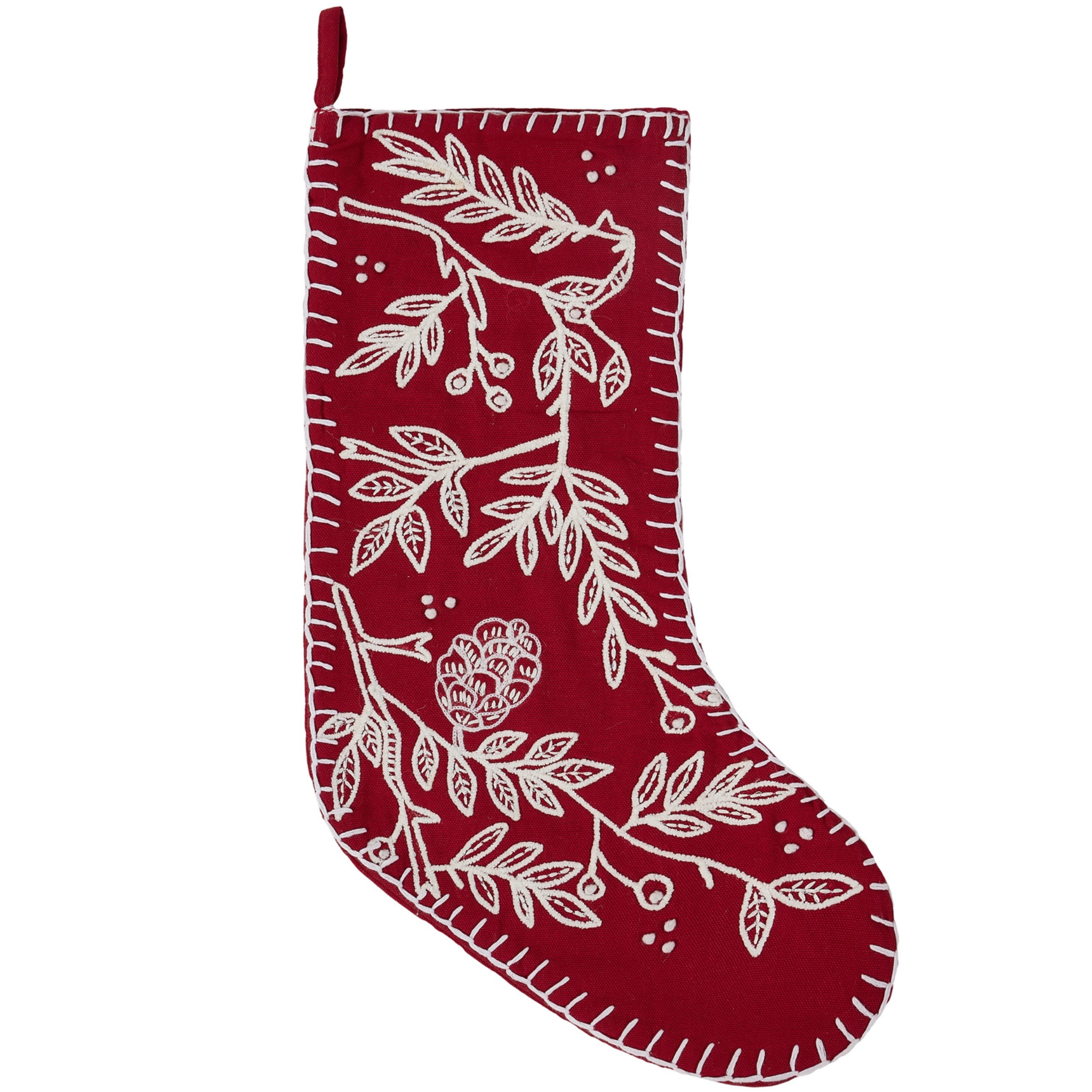 A charming holiday stocking featuring a rich red hue adorned with folk-inspired branch motifs. Crafted with cozy textures and timeless design, it adds a warm, rustic touch to your festive décor - perfect for filling with holiday treats and small gifts.