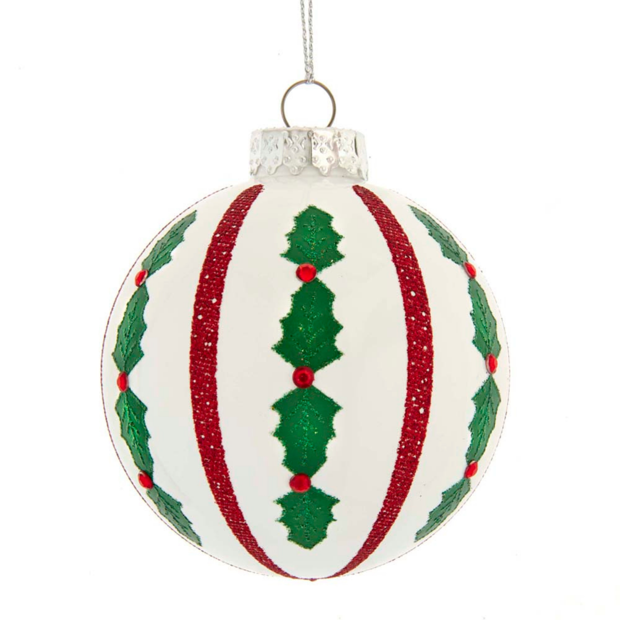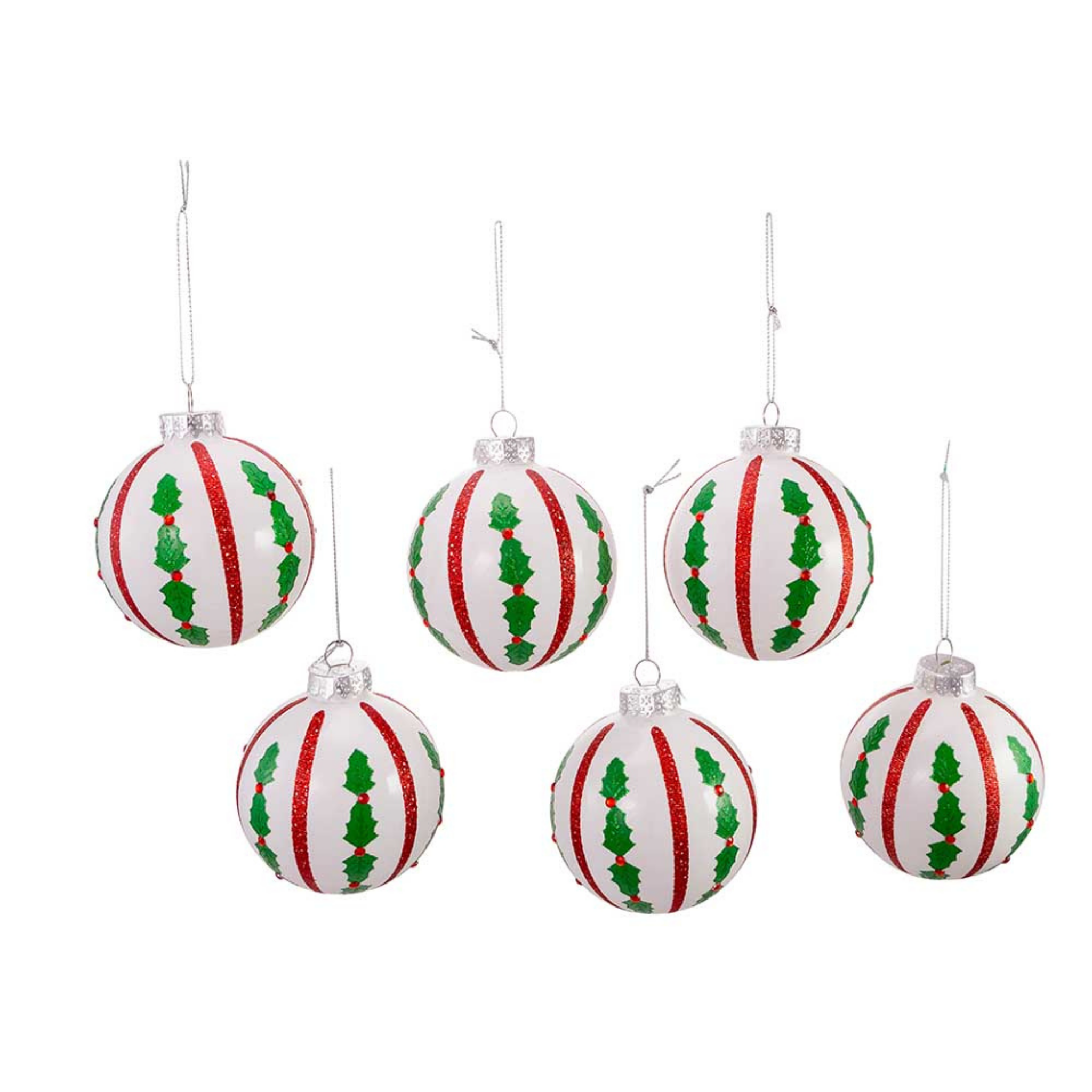 These white glass ball ornaments with a red, white and green holly leaf design from Kurt Adler are a beautiful addition to any holiday décor. Each white glass ball in this set has a glittered green holly leaf and red berry design with red glittered stripes.