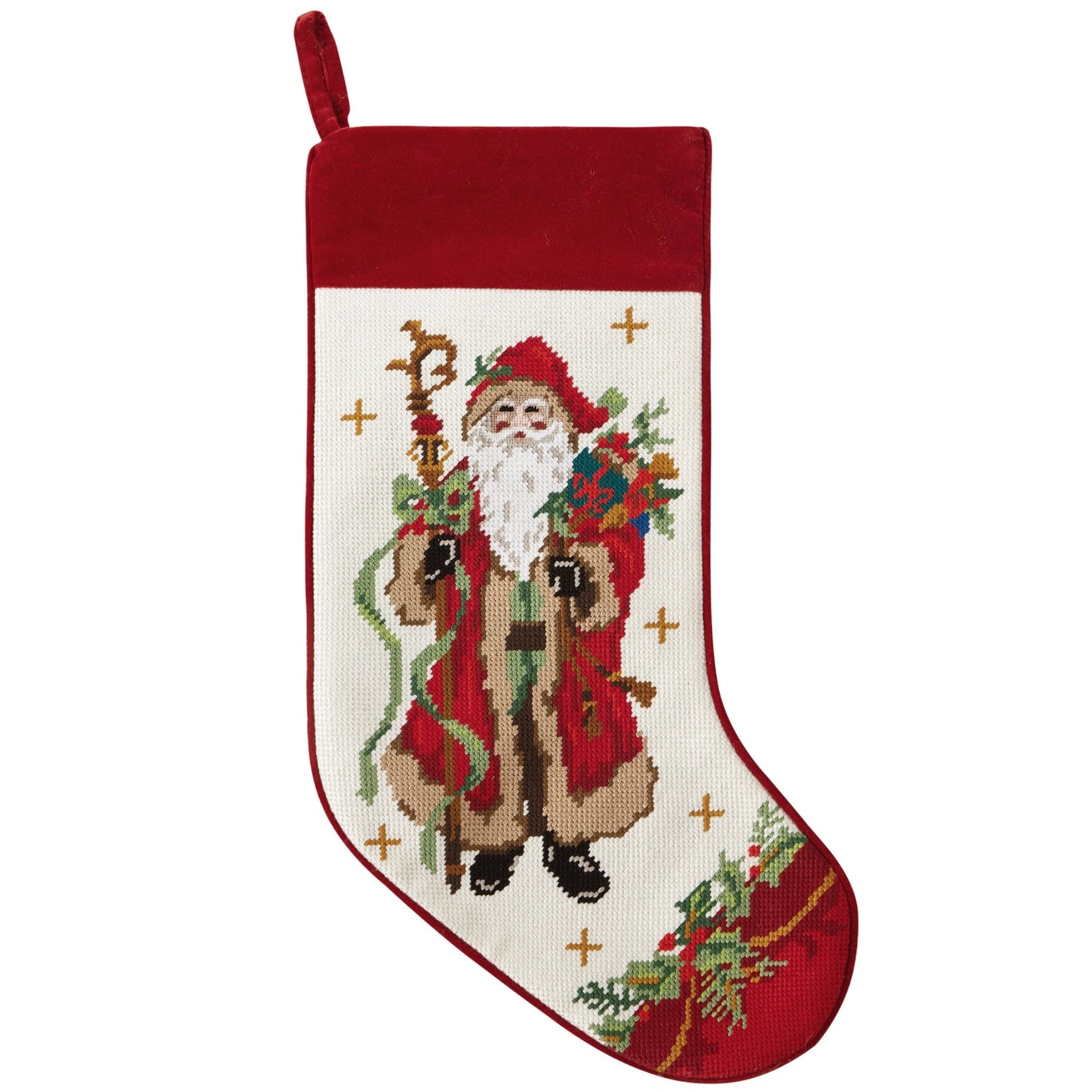 Bring classic holiday charm to your mantel with this beautifully detailed Santa with Staff Needlepoint Stocking. Crafted from 100% polyester, it features a richly embroidered scene of Santa holding his staff, surrounded by festive colors and intricate stitching. The timeless needlepoint design adds warmth and elegance to your Christmas décor - perfect for filling with holiday treats and small treasures.
