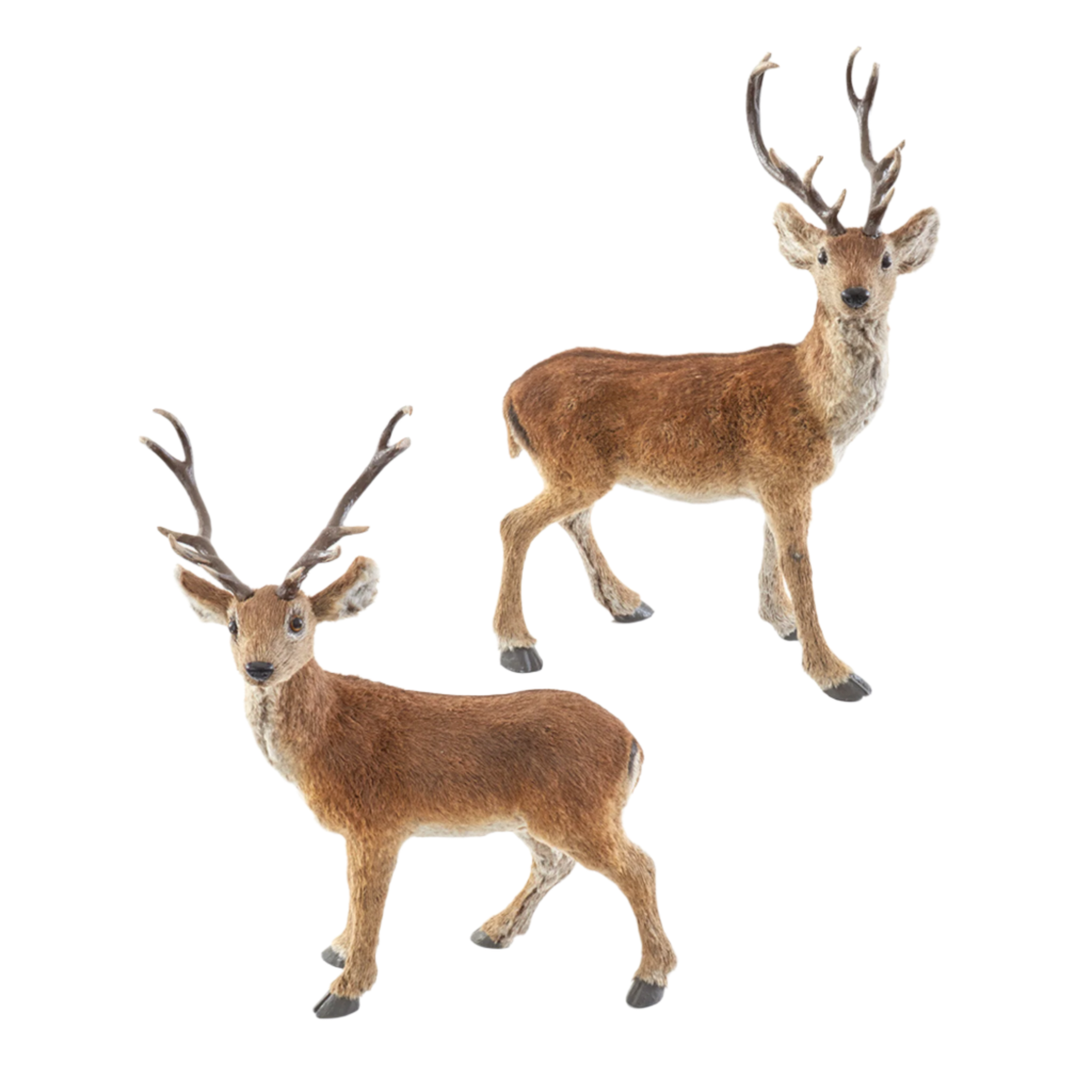 This Standing Brown Deer Table Piece Set from Kurt Adler, consisting of two pieces, is a captivating and elegant decorative ensemble designed to add a touch of natural beauty to any space. Crafted with exquisite attention to detail, these pieces depict graceful and poised brown deer standing in a regal manner. Each piece showcases a different pose, allowing for a dynamic and visually appealing display. The lifelike representation of the deer, with their intricate detailing and realistic features, creates a sense of wonder and brings the essence of the outdoors into your home or office. Made from durable materials, the brown deer table pieces are expertly finished with a rich brown hue that mimics the tones of nature, offering a sense of warmth and sophistication. The set complements a variety of interior design styles, whether placed together as a centerpiece or separately to accent different areas. Ideal for adorning tabletops, shelves, or mantels, these pieces serve as conversation starters and focal points, inviting admiration and appreciation from onlookers. The Standing Brown Deer Table Piece Set, with its grace and charm, is a delightful addition that infuses a space with a touch of wilderness and grace.