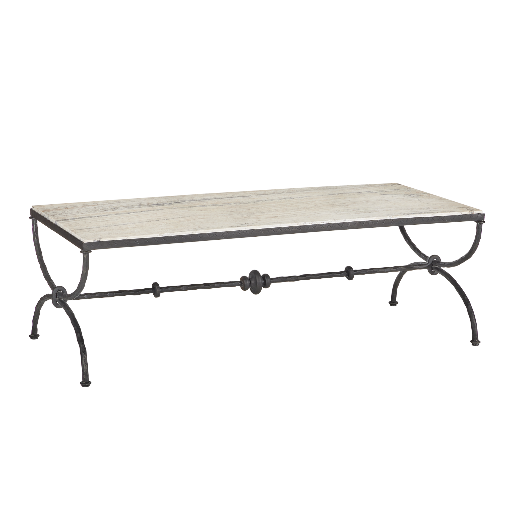 The Agora White Travertine Cocktail Table draws inspiration from classical Greek design. Its white travertine top has dynamic veining that adds natural texture to the piece. The hourglass-shaped legs give the table a sculptural presence, while a stretcher with decorative orb detailing adds an extra layer of interest. Finished in a rich bronze, the metal frame contrasts beautifully with the light color of the stone, which will vary from piece to piece.