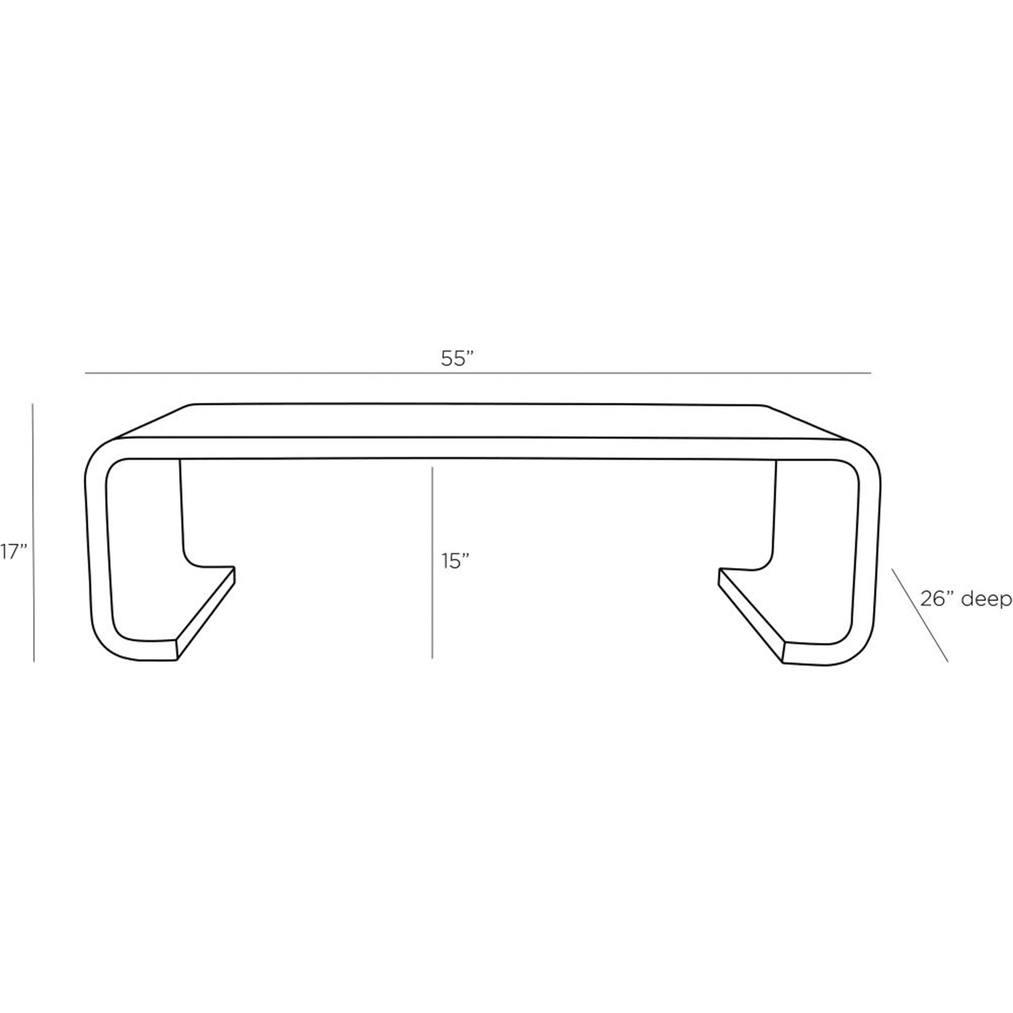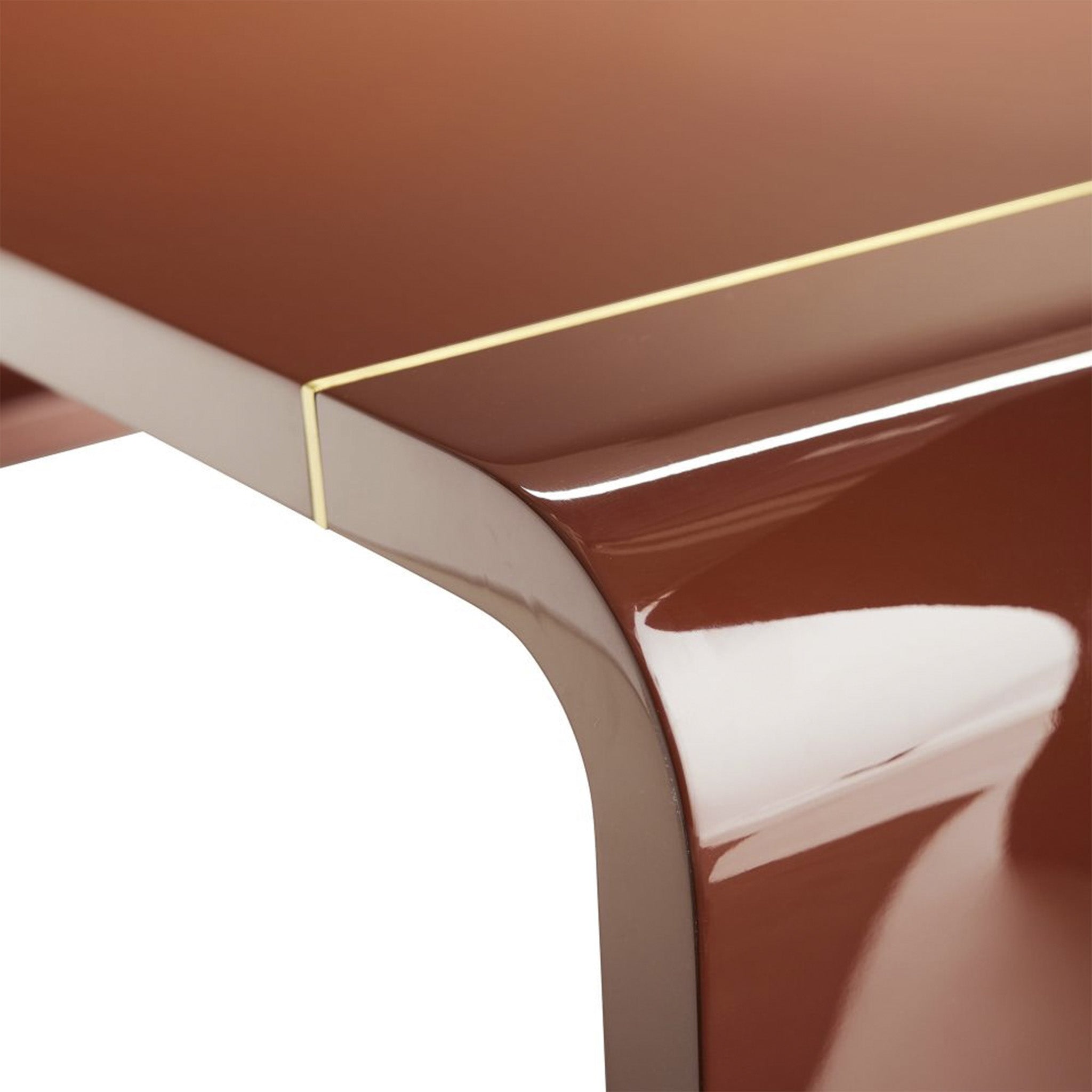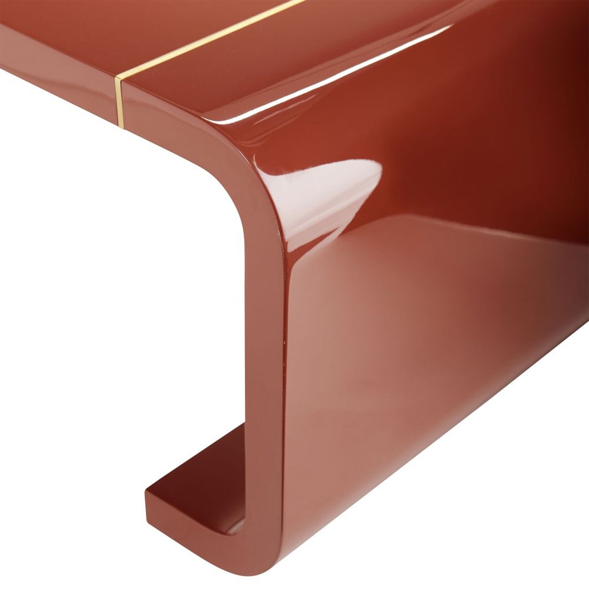 A modern take on a traditional scroll table, the Turnley Cocktail Table provides a sleek profile. The rich and vibrant paprika lacquer finish brings a luxe shine to the surface, while thin antique brass inlay stretches edge to edge. The softened angular shape of the legs breaks away from the traditional scroll leg, bringing forth a modern interpretation.