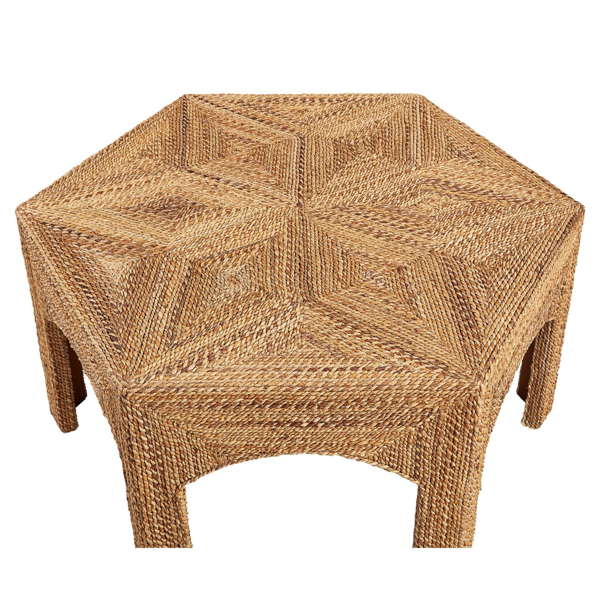 Boho chic and slightly Moroccan in feeling, this unique table is crafted from tightly woven and coiled dried natural banana fronds which are very sturdy. The hexagon design provides inspiration for the graphically arresting star design on the tabletop. What a unique way to bring texture into your design!