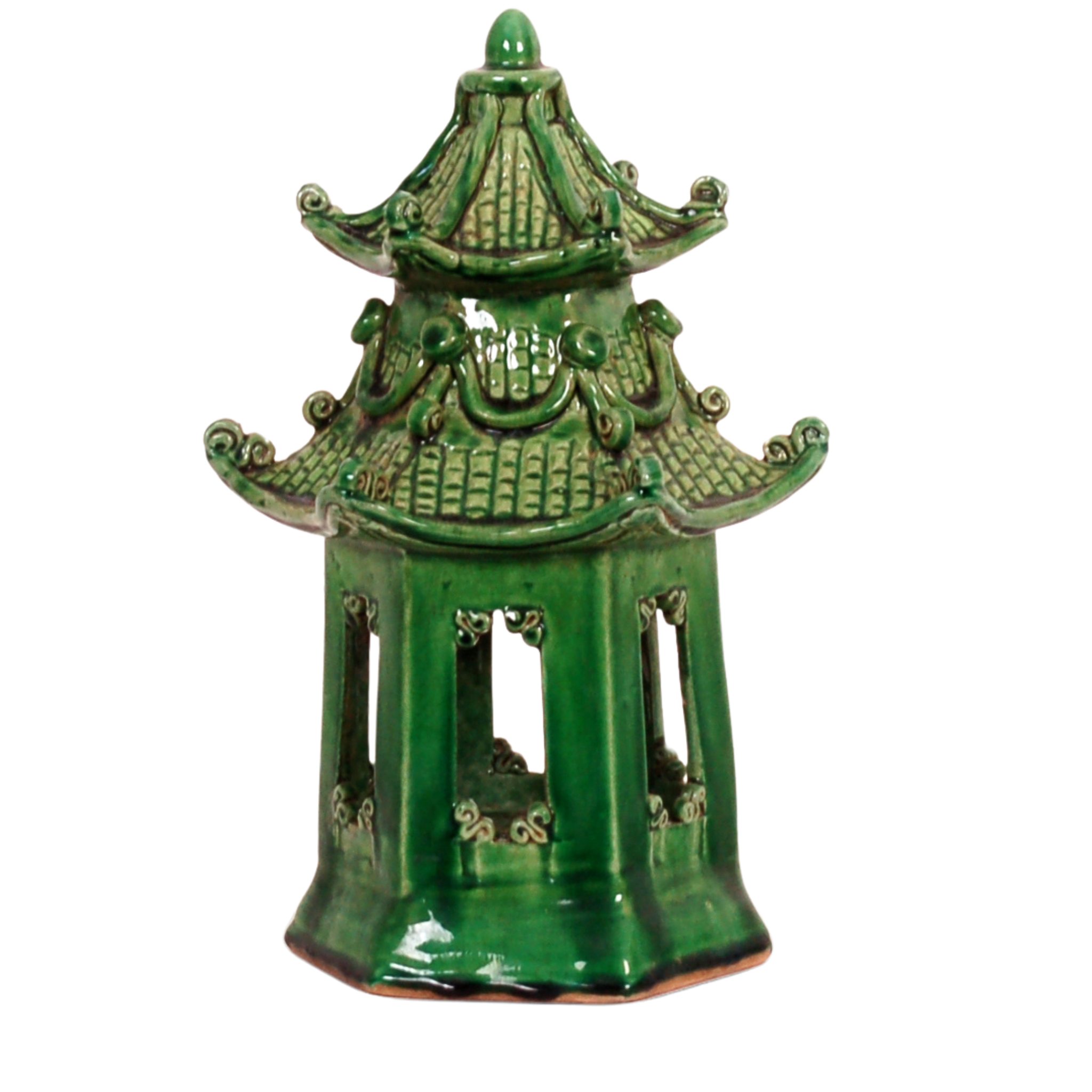 Reproduction hand formed porcelain pagoda with washed green finish.