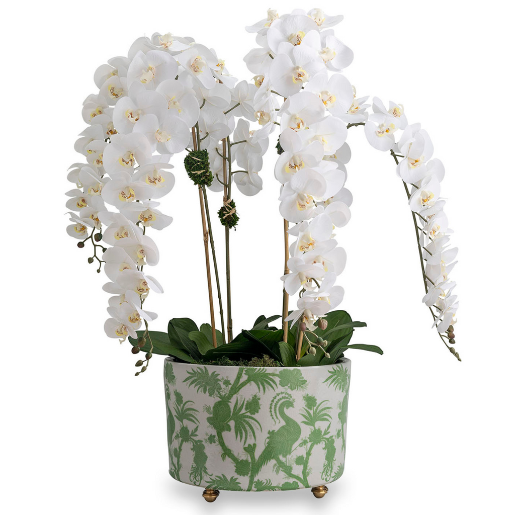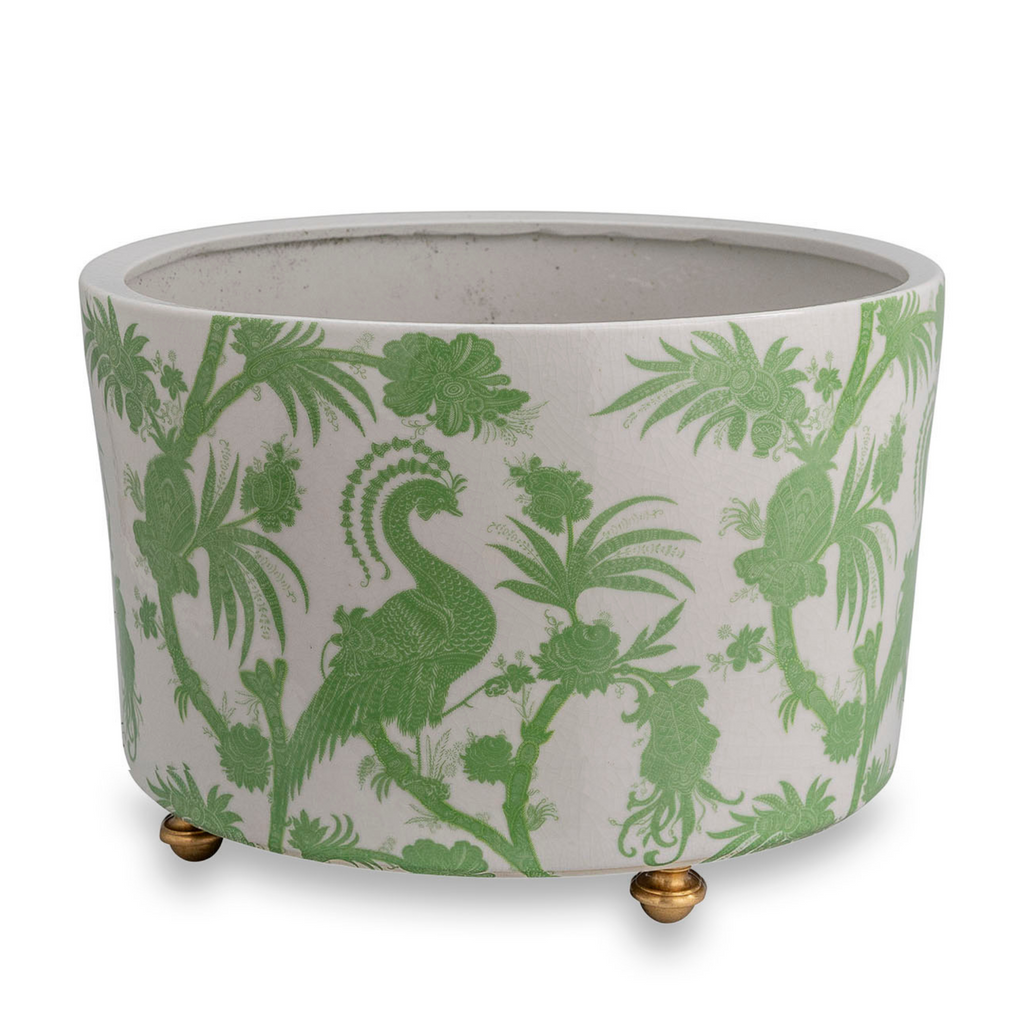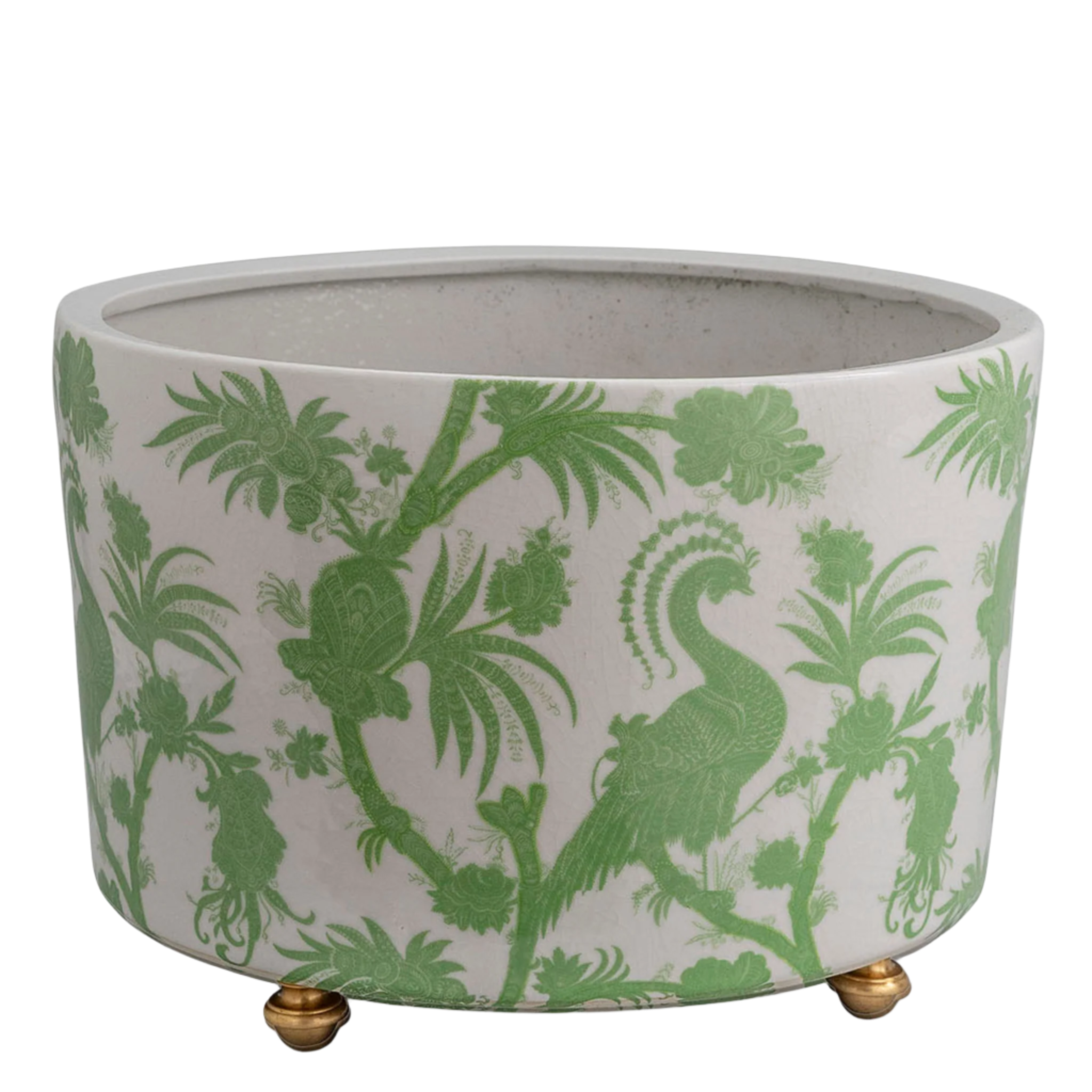 Balinese peacock is inspired by a nineteenth century archival French wallpaper roller print. Decidedly a South Seas look, the Scalamandre' green on white pattern is rendered in exotic motifs of fruit, foliage and peacocks with delicate batik-like details. The center basin planter is made of porcelain with solid brass metal feet.