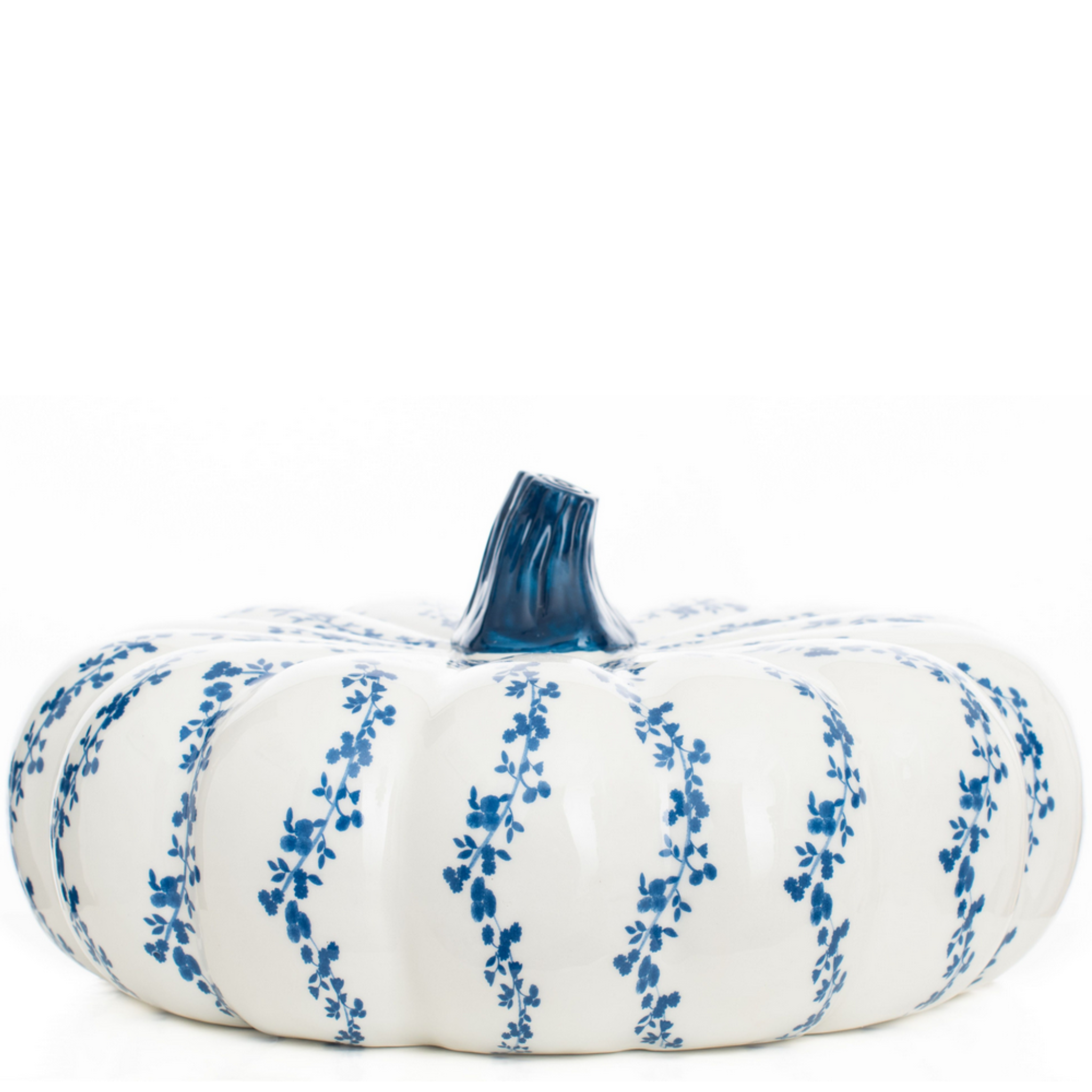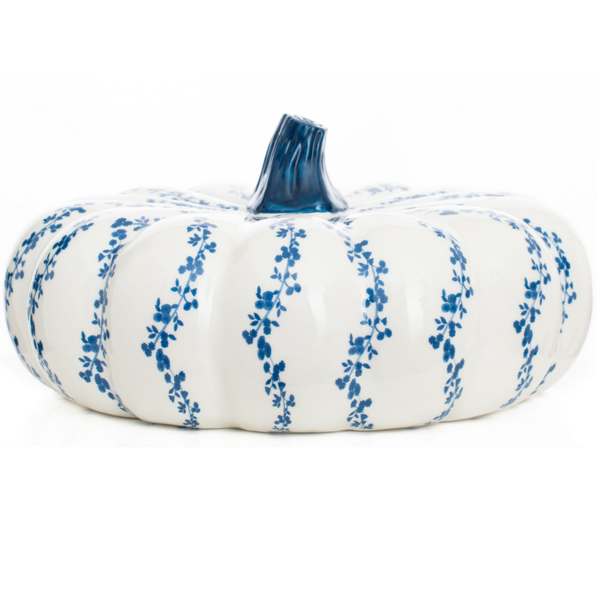 Make a grand statement this fall with this extra large decorative pumpkin. Elegantly crafted from porcelain, this striking decorative piece blends classic charm with refined sophistication. The white finish is beautifully accented by flowing blue vine stripe designs, offering a timeless palette that complements both traditional and contemporary décor. Its smooth porcelain surface and hand-painted design make it a standout addition to your harvest décor - versatile enough to display from early autumn through Thanksgiving.