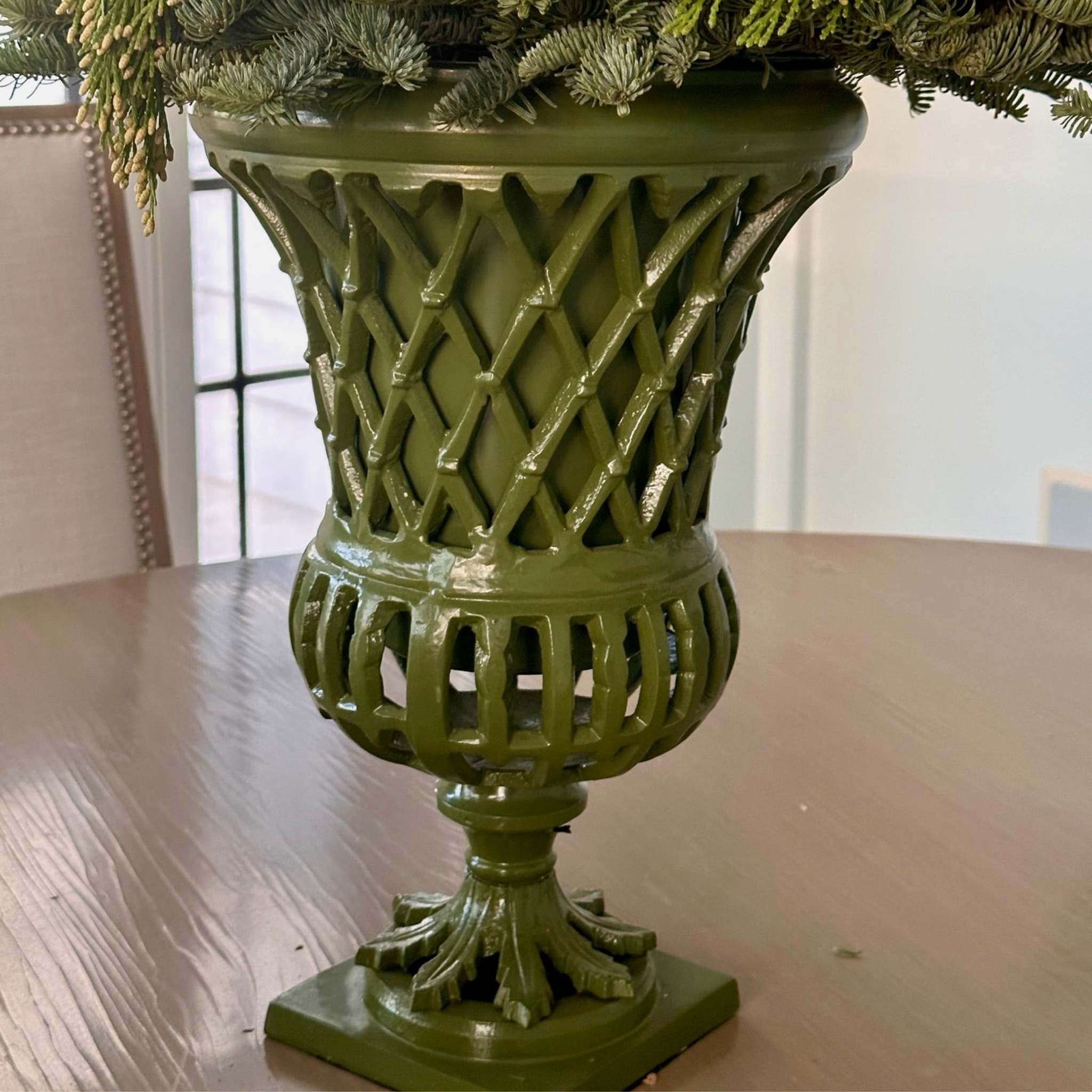 Introducing a smaller size of our best selling lattice urn! This size is great for both indoors and out. Made of cast aluminum with a removal shell liner for easy planting. Endless possibilities with this beauty! Done in a gorgeous rich shade of green.