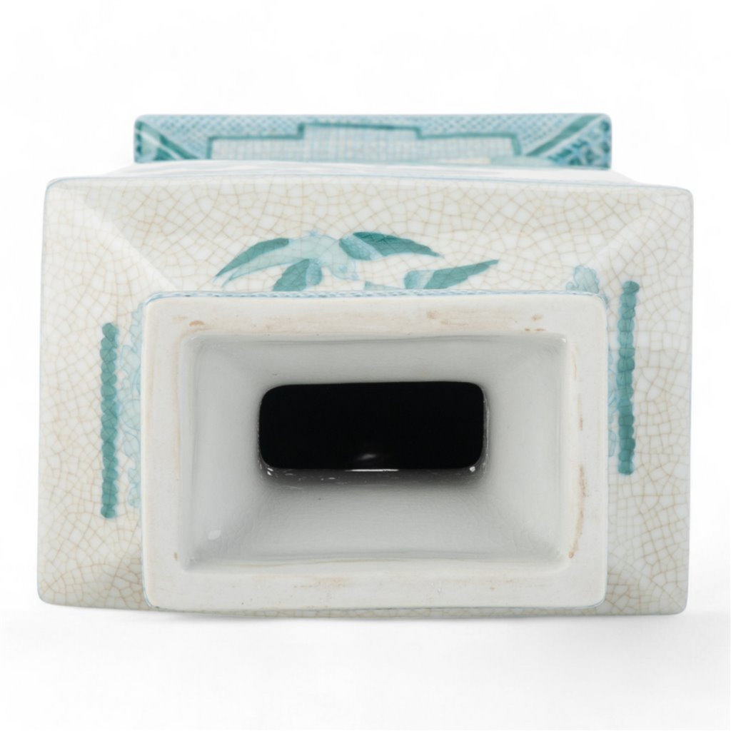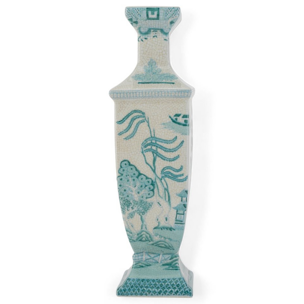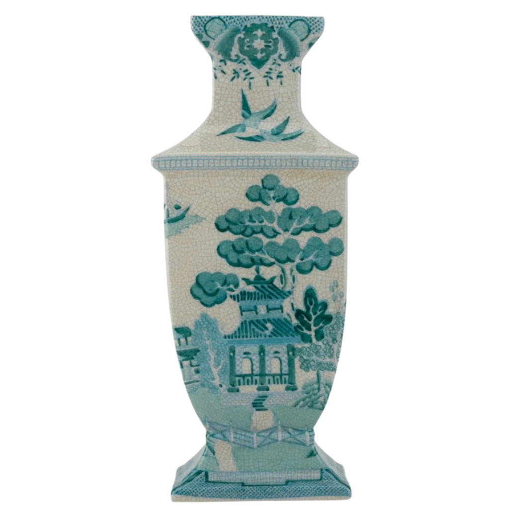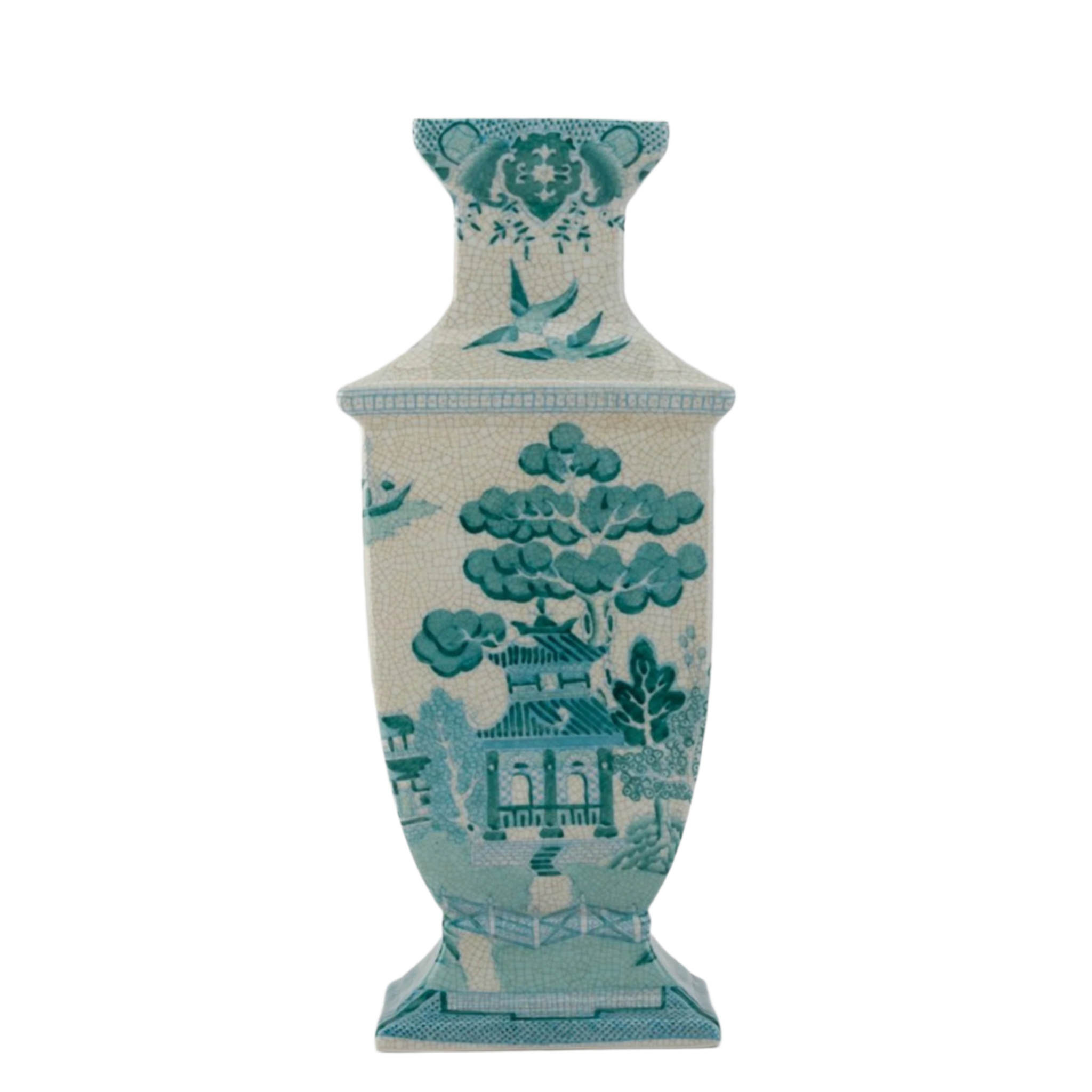 The vase features turquoise and white willow pattern. This item was handmade with care and attention to details. All handmade items may contain small imperfections which add to its own uniqueness and character.