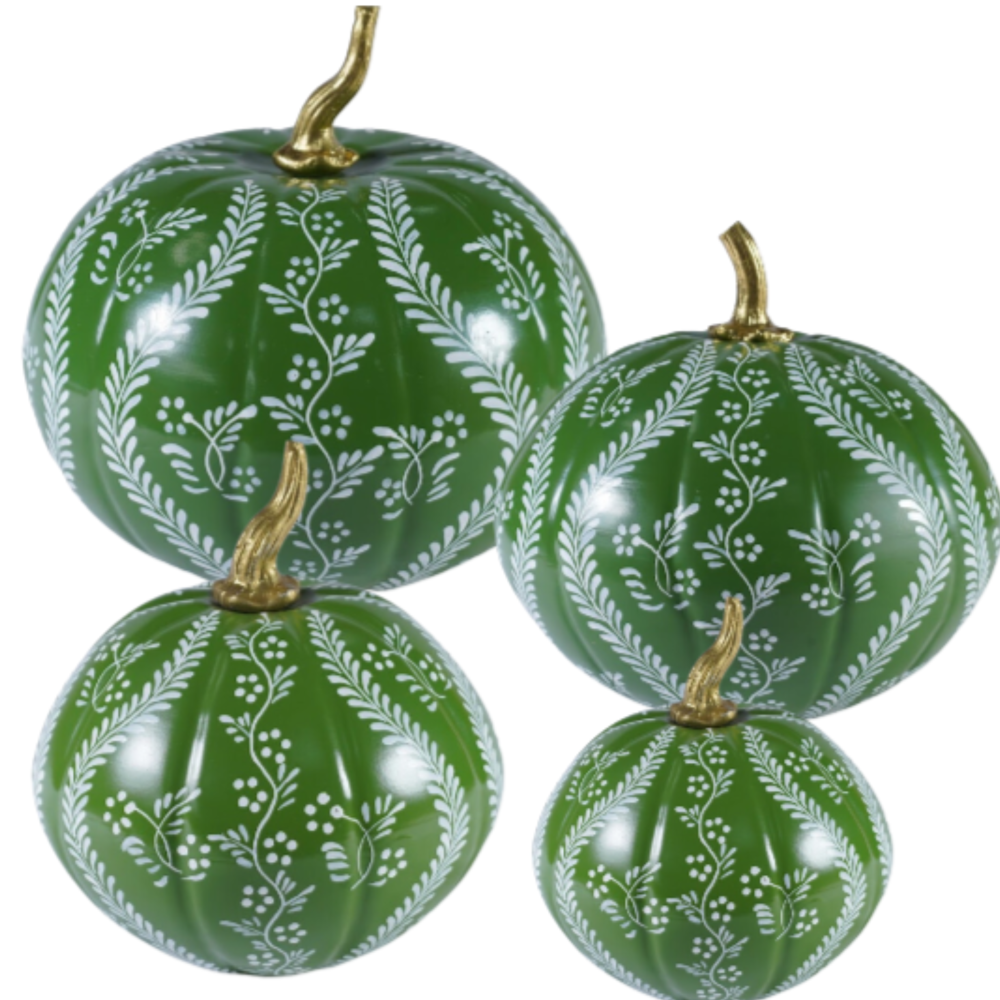 Bring a fresh twist to your fall décor with this decorative pumpkin featuring a white trellis design. Handcrafted from metal, this charming piece blends rustic harvest style with a touch of modern elegance. The rich green finish is beautifully complemented by the crisp white trellis pattern, creating a striking yet balanced look that's perfect for seasonal displays. Whether used as a standalone accent or incorporated into a larger centerpiece, this metal pumpkin adds texture, color, and artisanal detail to any space.