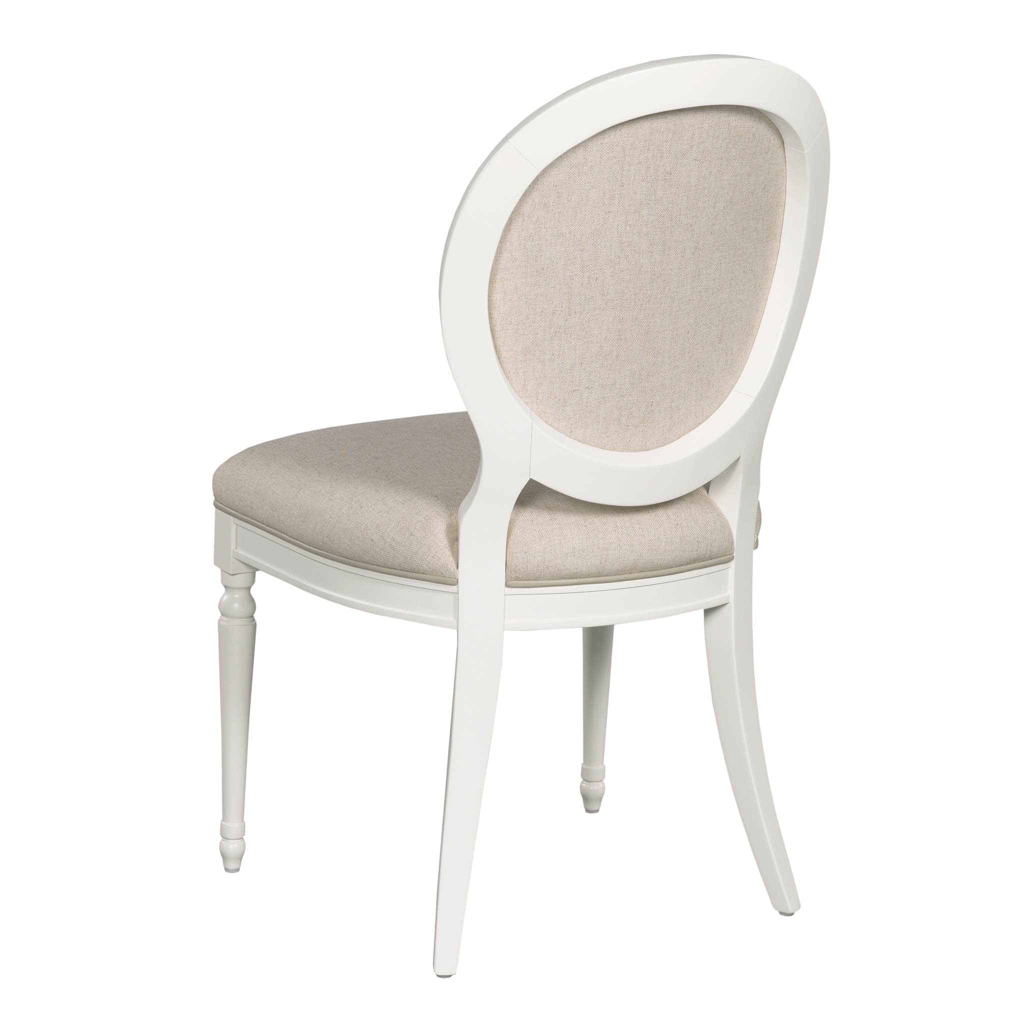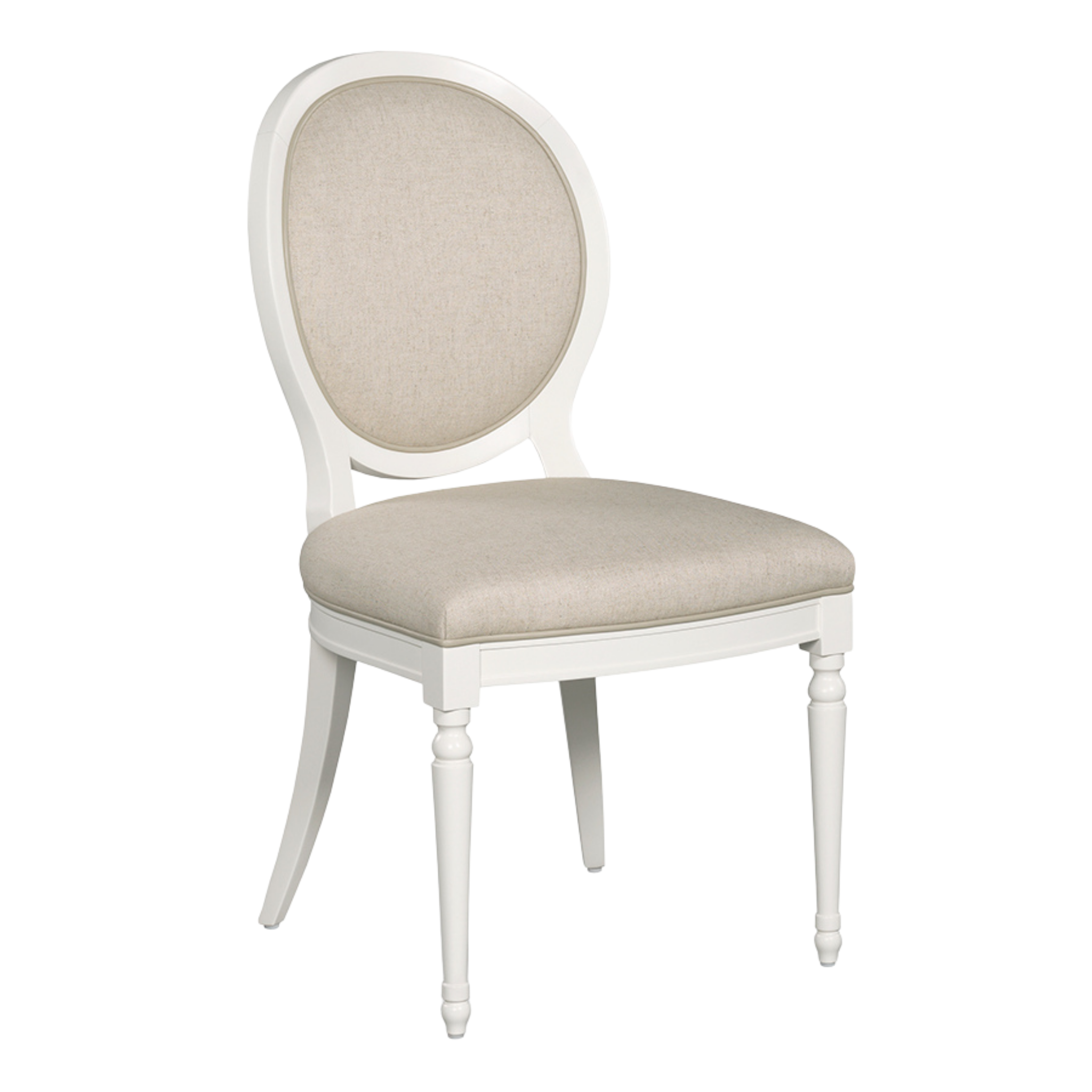 This chair features a round shaped upholstered back over an upholstered seat with contrast welt.