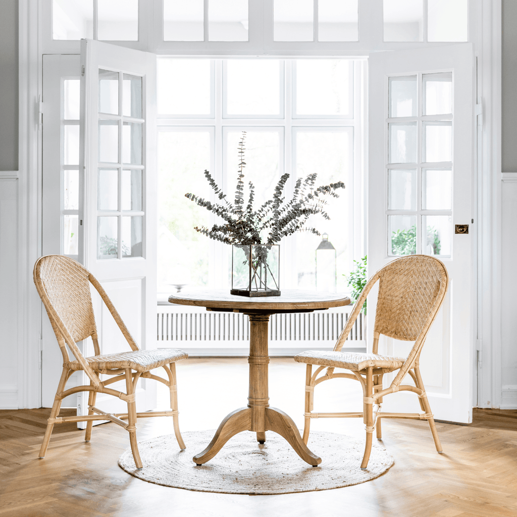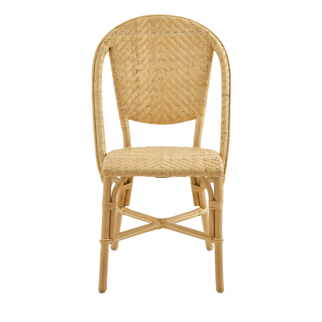 This bistro chair is crafted of 100% woven rattan seat and bindings. This stackable dining chair will be an instant hit with those looking to decorate a home, retro cafe, bar, or restaurant.