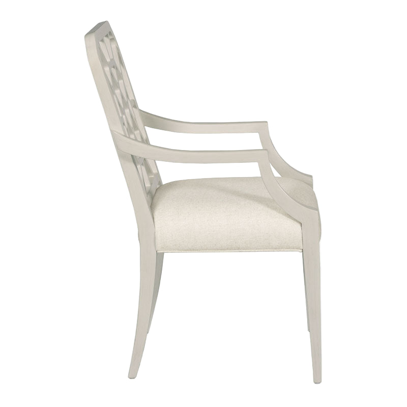 The Merrion Dining Arm Chair features a pierced fretwork back that creates an elegant and sculptural silhouette. The seat is upholstered in Performance Repel Stainguard Linen with a matching welt.
