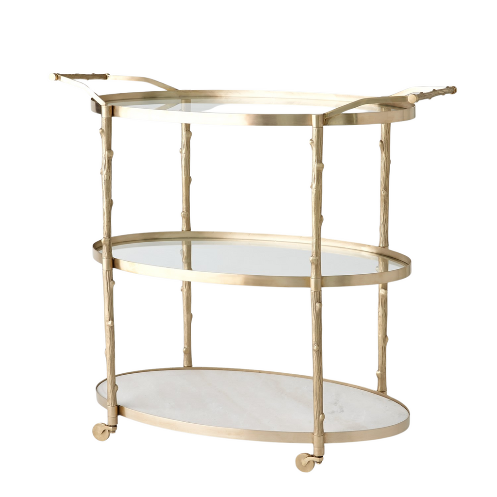 This brass bar cart compliments the natural motif of our Arbor collection. It has twig textured detailing on the supports and handles, a solid white marble bottom shelf, and two glass upper shelves. Solid brass pivoting wheels make for easy mobility.