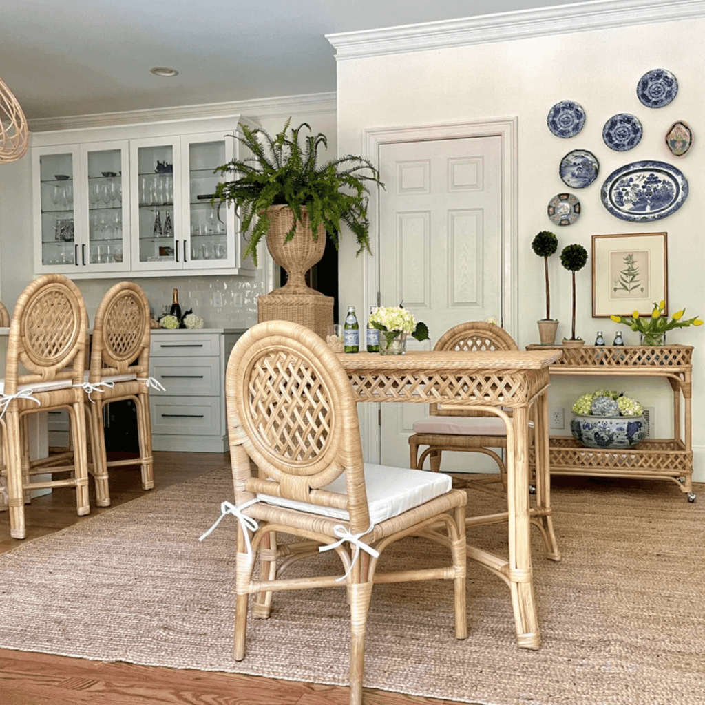 This trellis-backed chair is just the natural accent necessary for a patio dining or game table. The rattan piece comes from the Sarah Bartholomew Garden Collection.