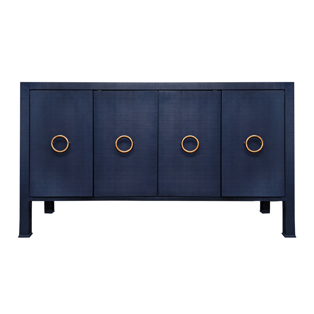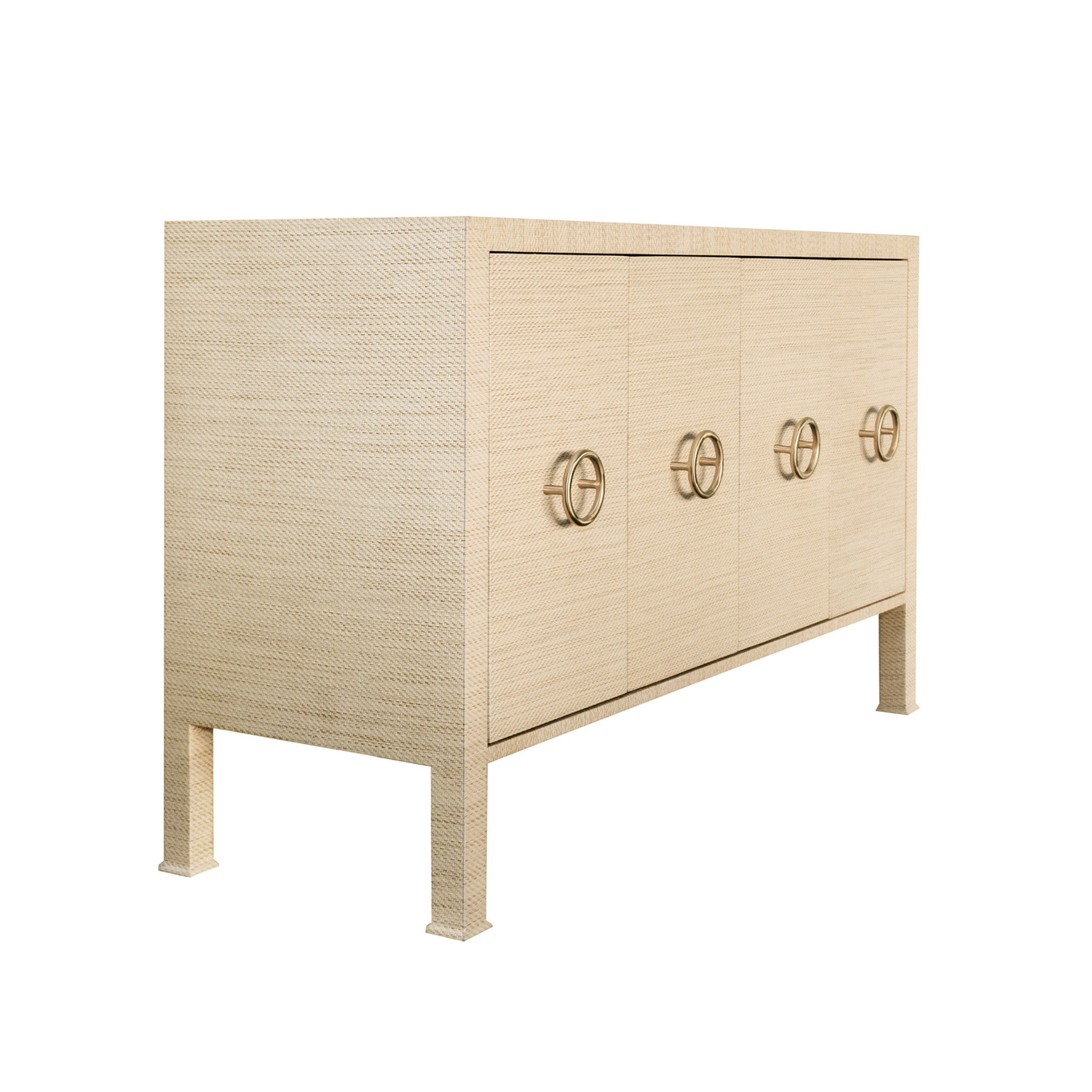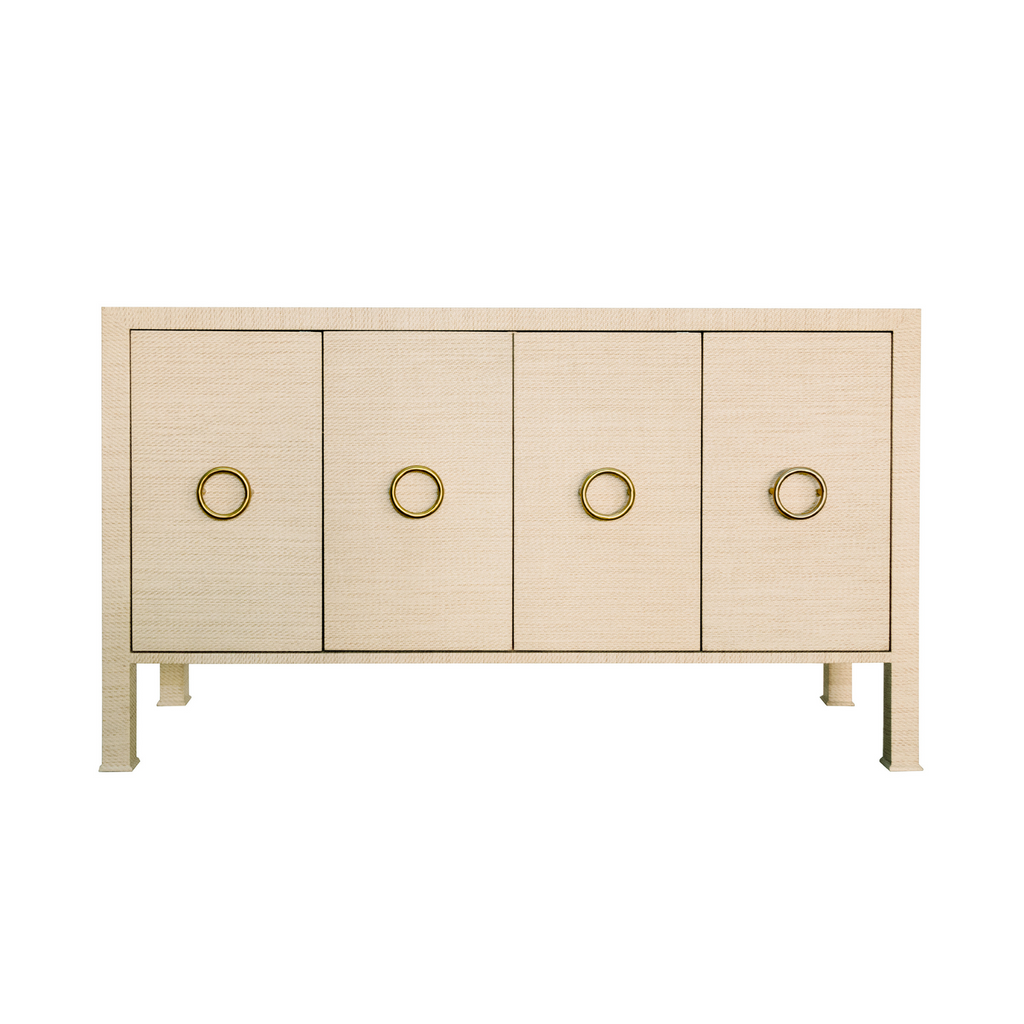 The Rue buffet cabinet features four doors, a textured linen finish, and brass circular hardware.