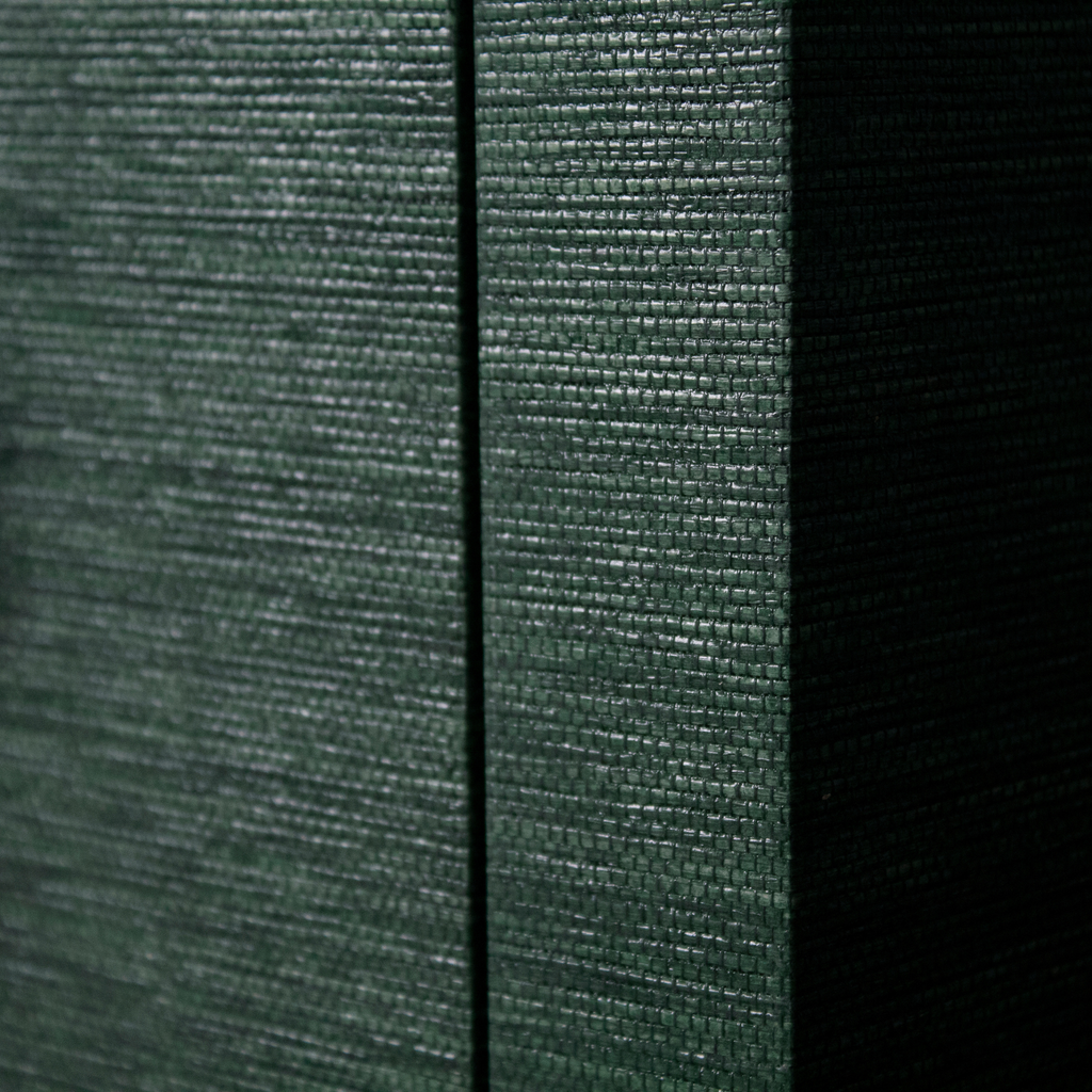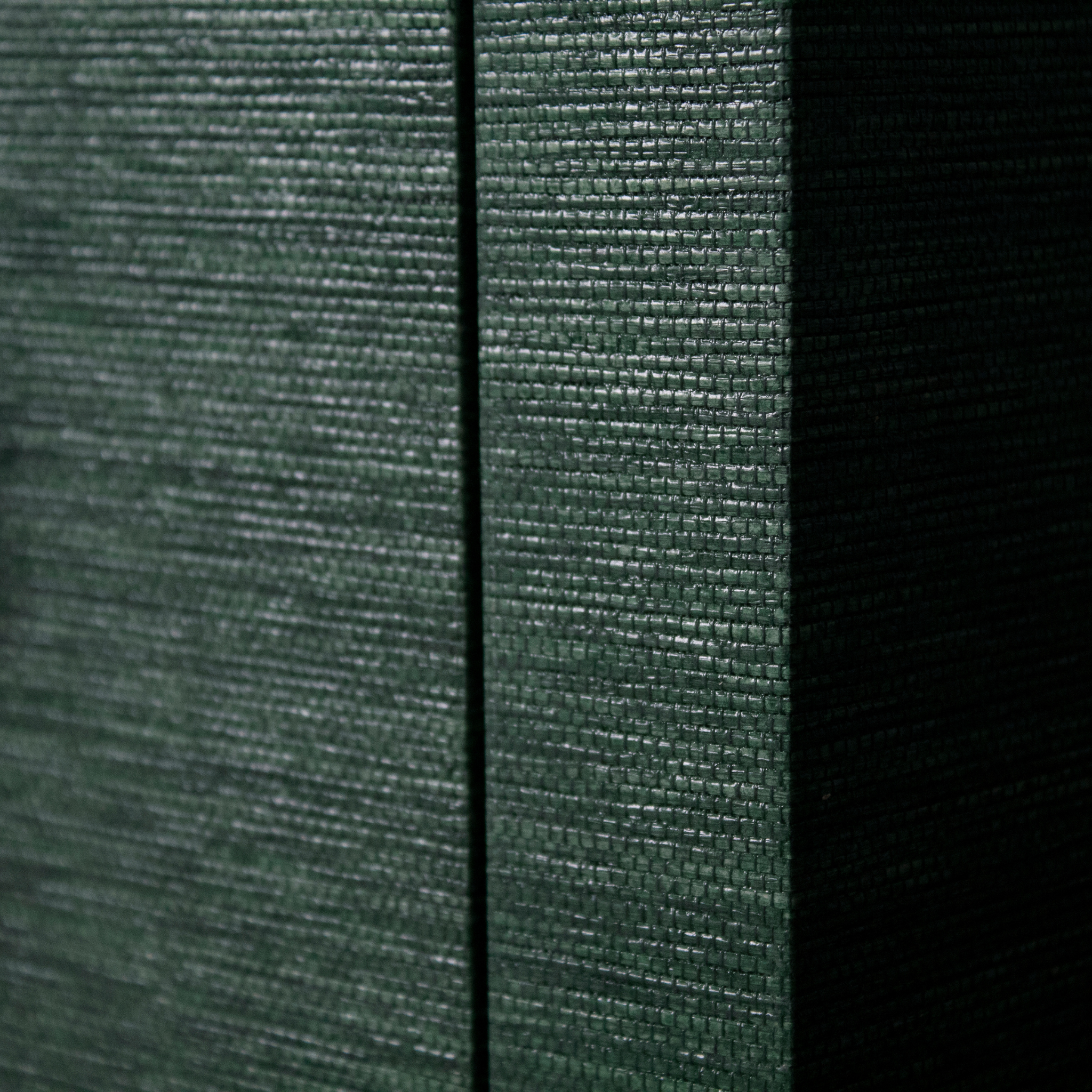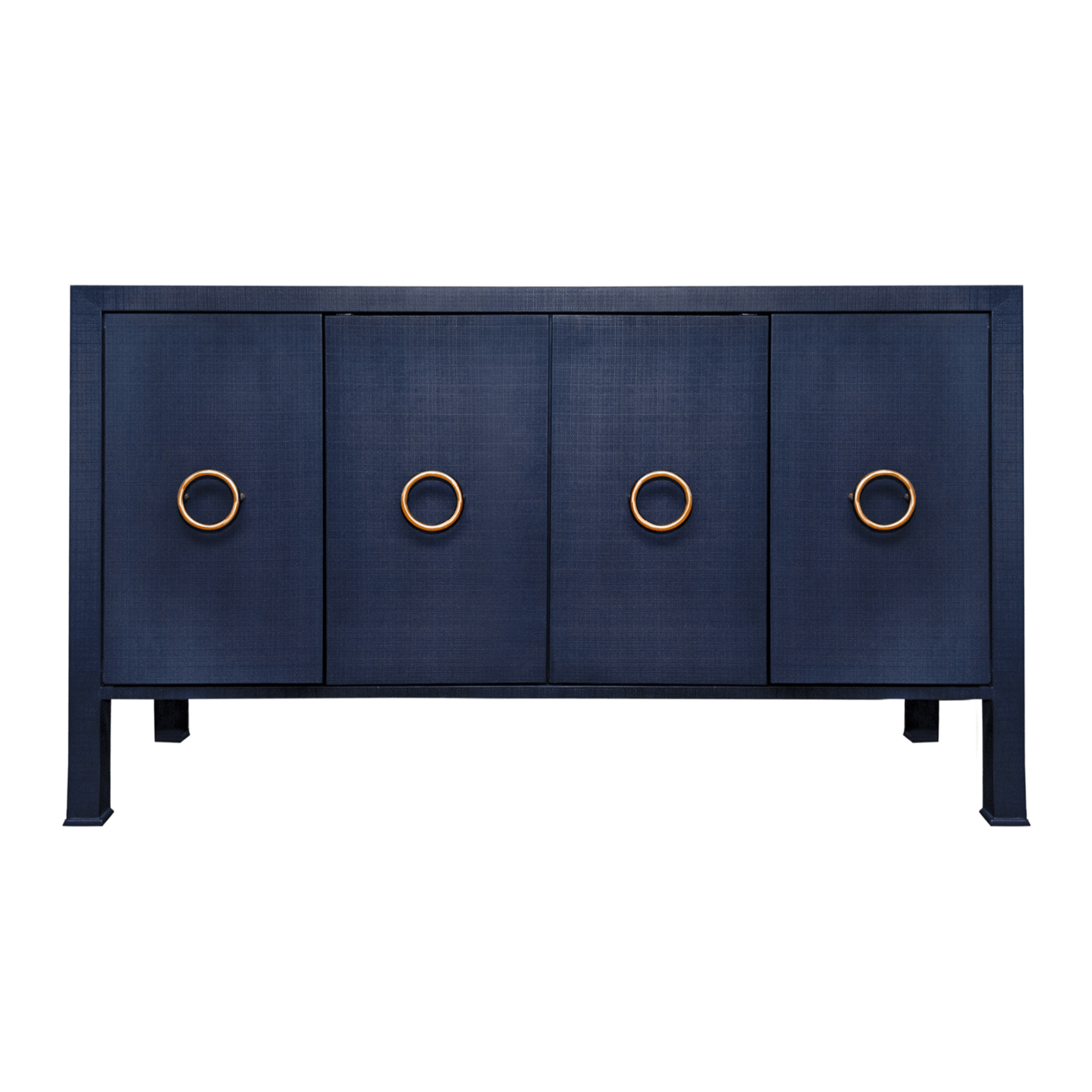 The Rue buffet cabinet features four doors, a textured linen finish, and brass circular hardware.