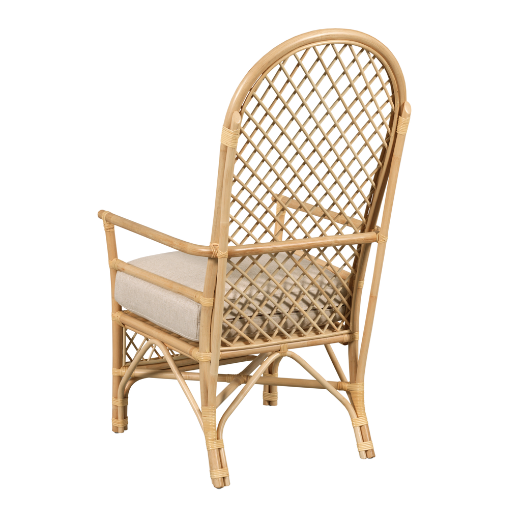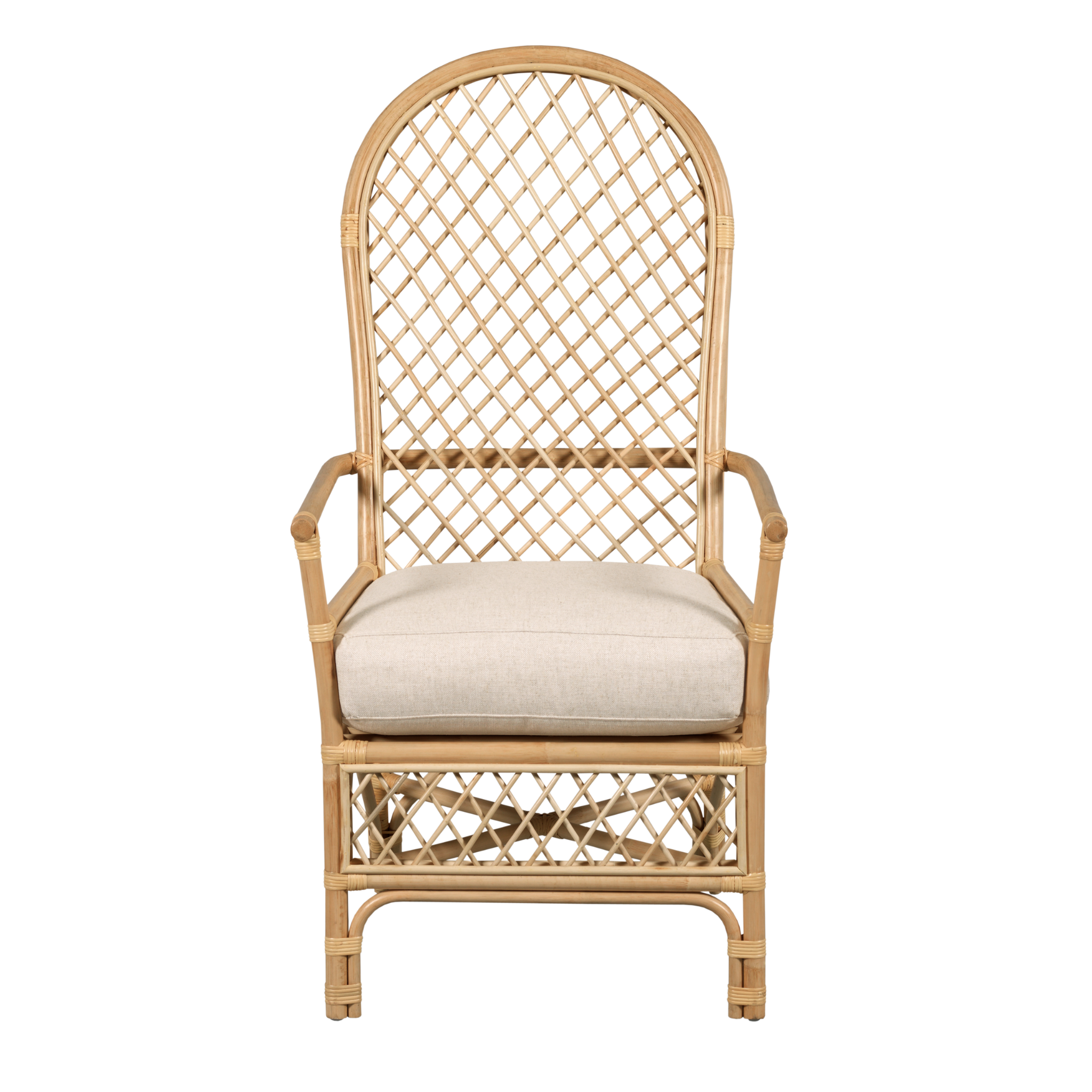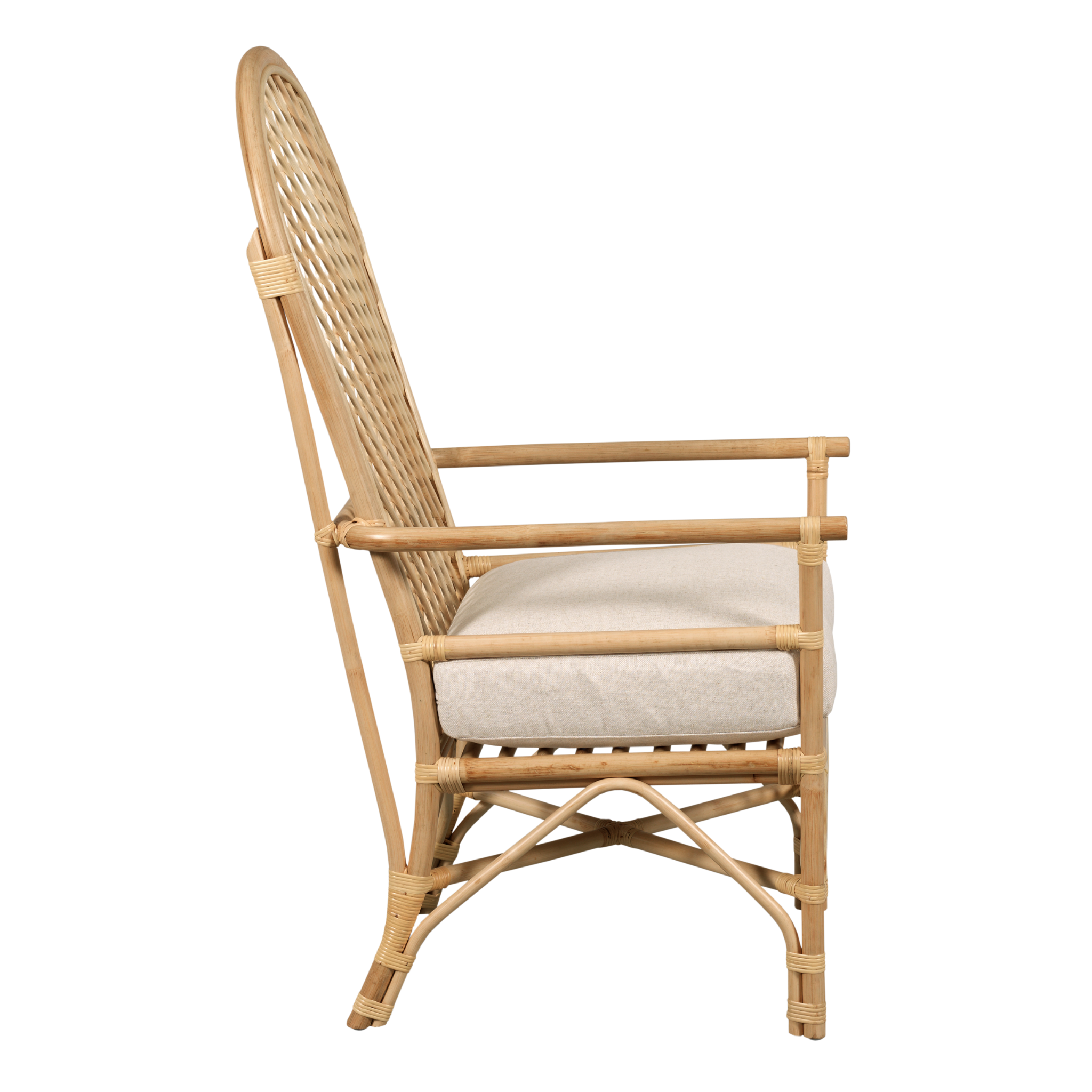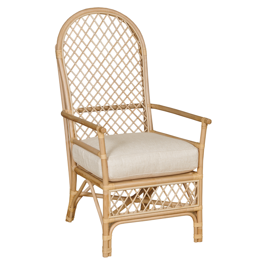 A lovely chair designed in the spirit of 19th Century English regency originals. The high hooped back is fitted with a myriad of interlaced rattan poles over an upholstered seat elevated on rattan pole legs.