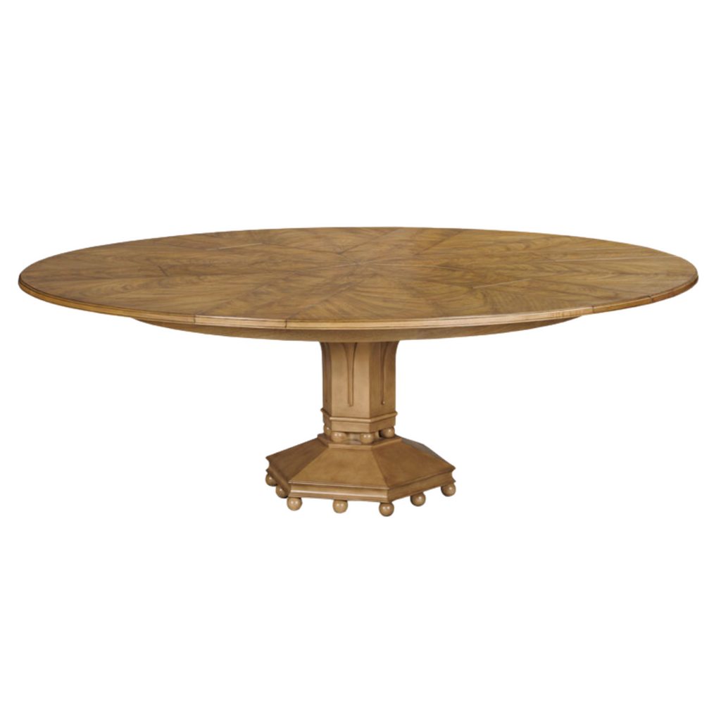 A wonderful expanding table with traditional styling. The top expands using a patented mechanism dating back to 1835 by Johnstone, Jupe & Company. The top expands from 66" to 86.75" in diameter and rests over a robust central column accented with carved laurel leaves over a hexagonal base elevated on bun feet.