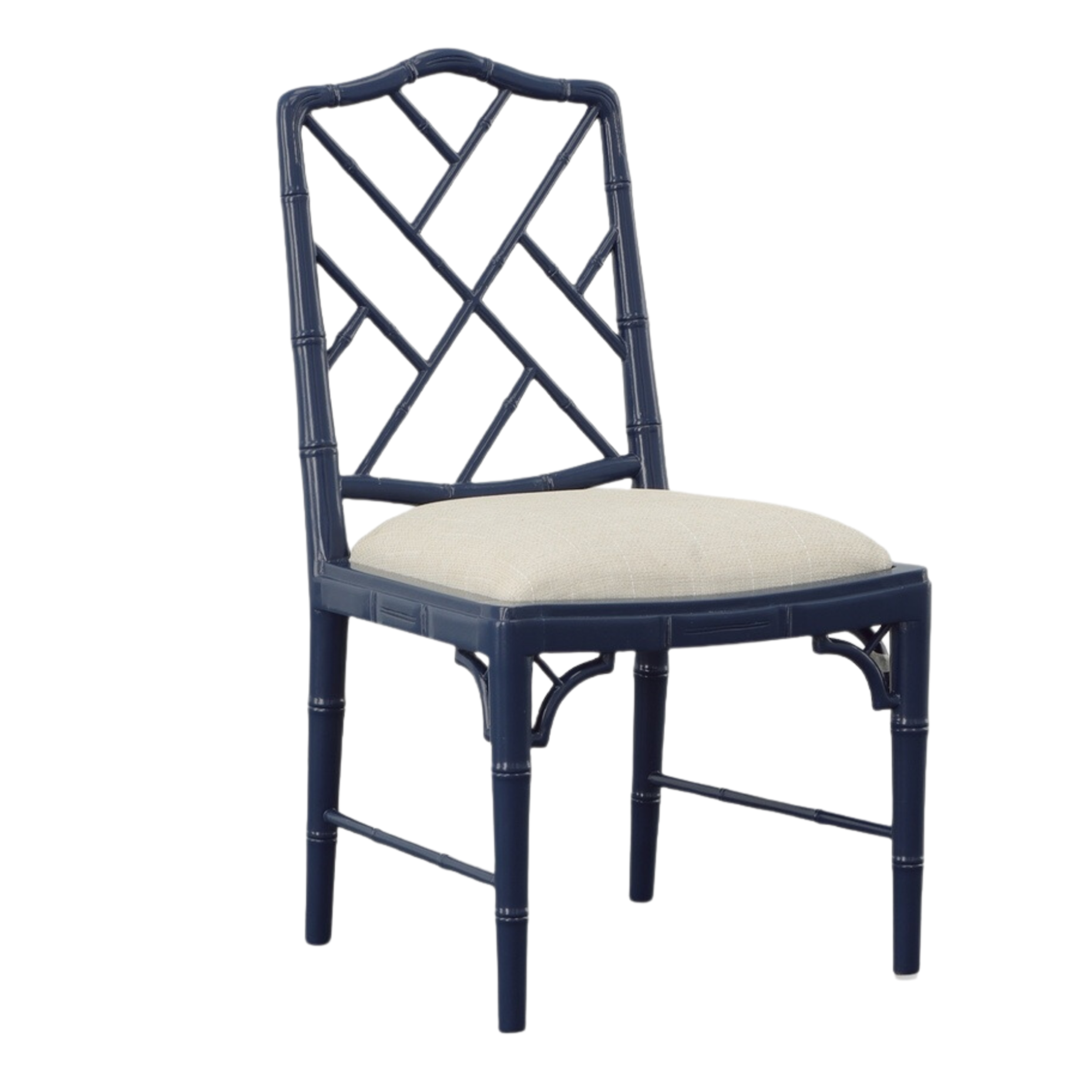 Who doesn't love blue?  This handsome Chinese Chippendale side chair is as happy at a desk or vanity, as it is at your dining table.  The solid mahogany frame belies its delicate appearance, and the neutral performance fabric on the drop in seat adds another touch of practicality to this stunningly stylish side chair. Click images for greater detail.