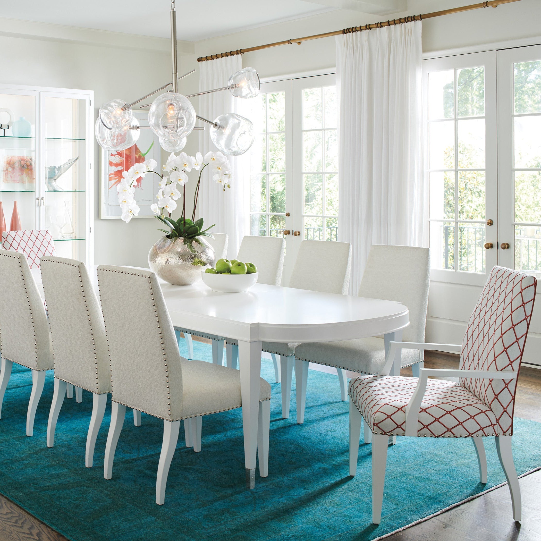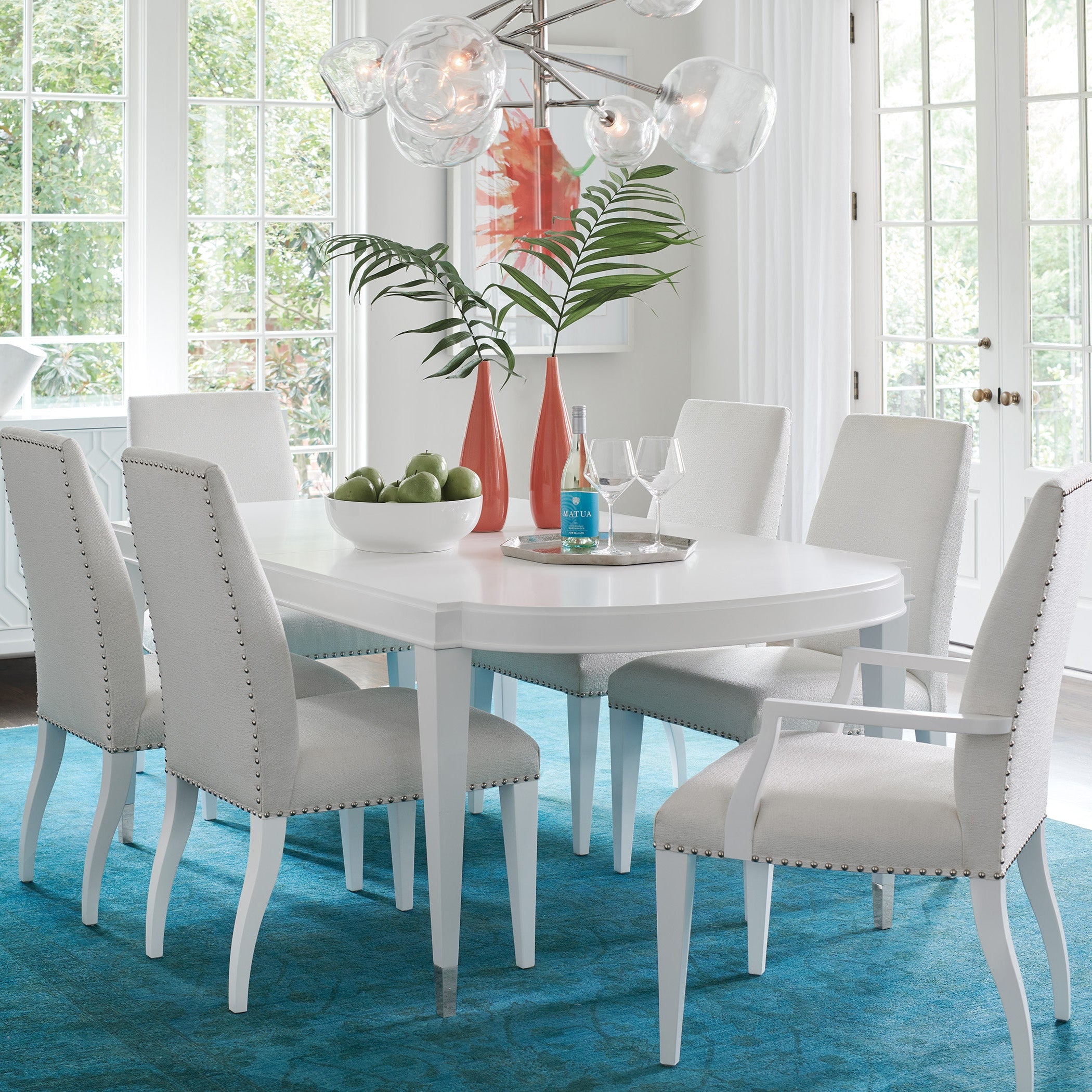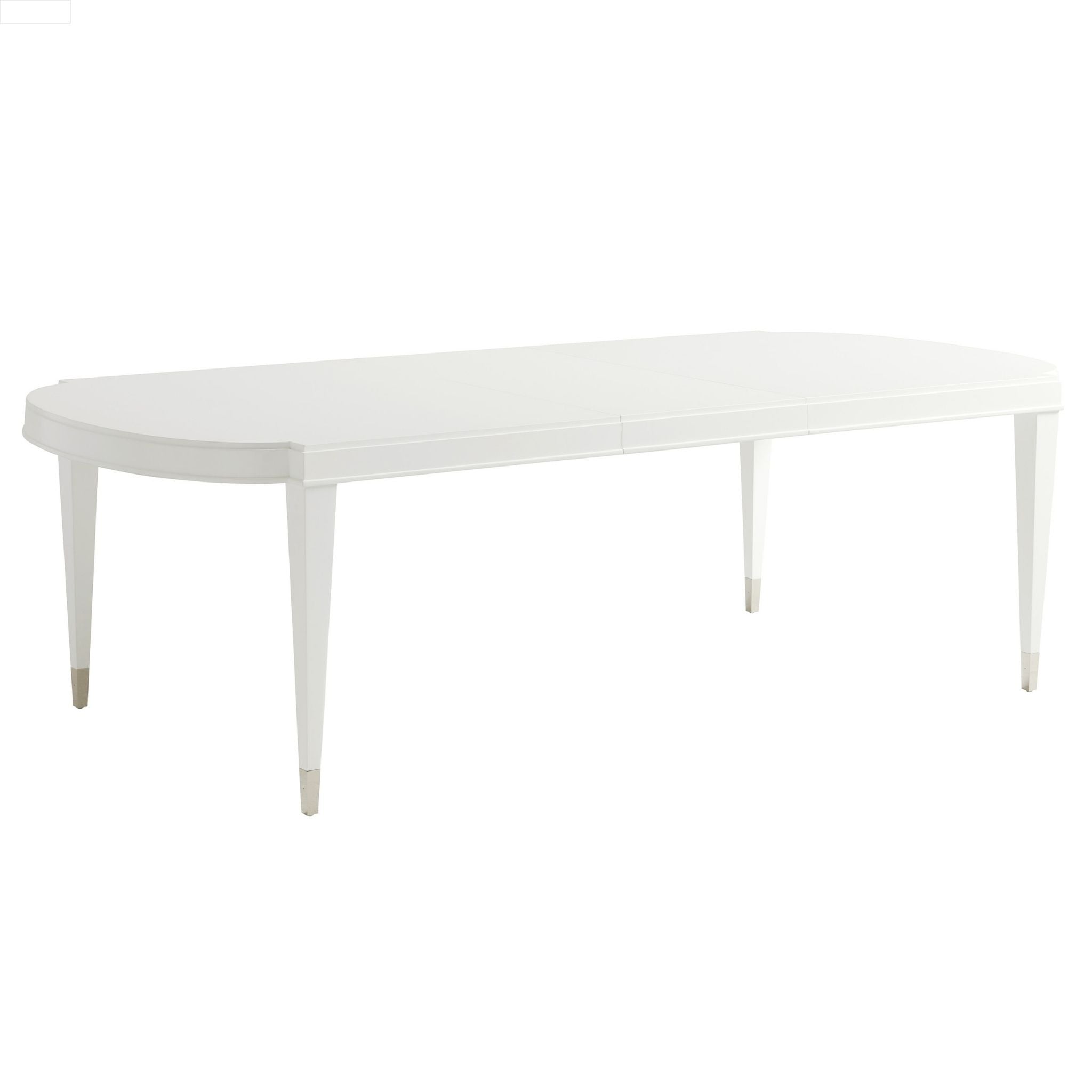 The Vernon Hills Rectangular Dining Table blends refined craftsmanship with transitional style. Measuring 80 inches wide and extending to 120 inches with two 20-inch leaves, this elegant dining table features gently rounded ends, sleek tapered legs, and polished nickel ferrules for a sophisticated touch. Crafted from premium hardwoods with a soft Alabaster finish, the Vernon Hills table comfortably seats up to ten.