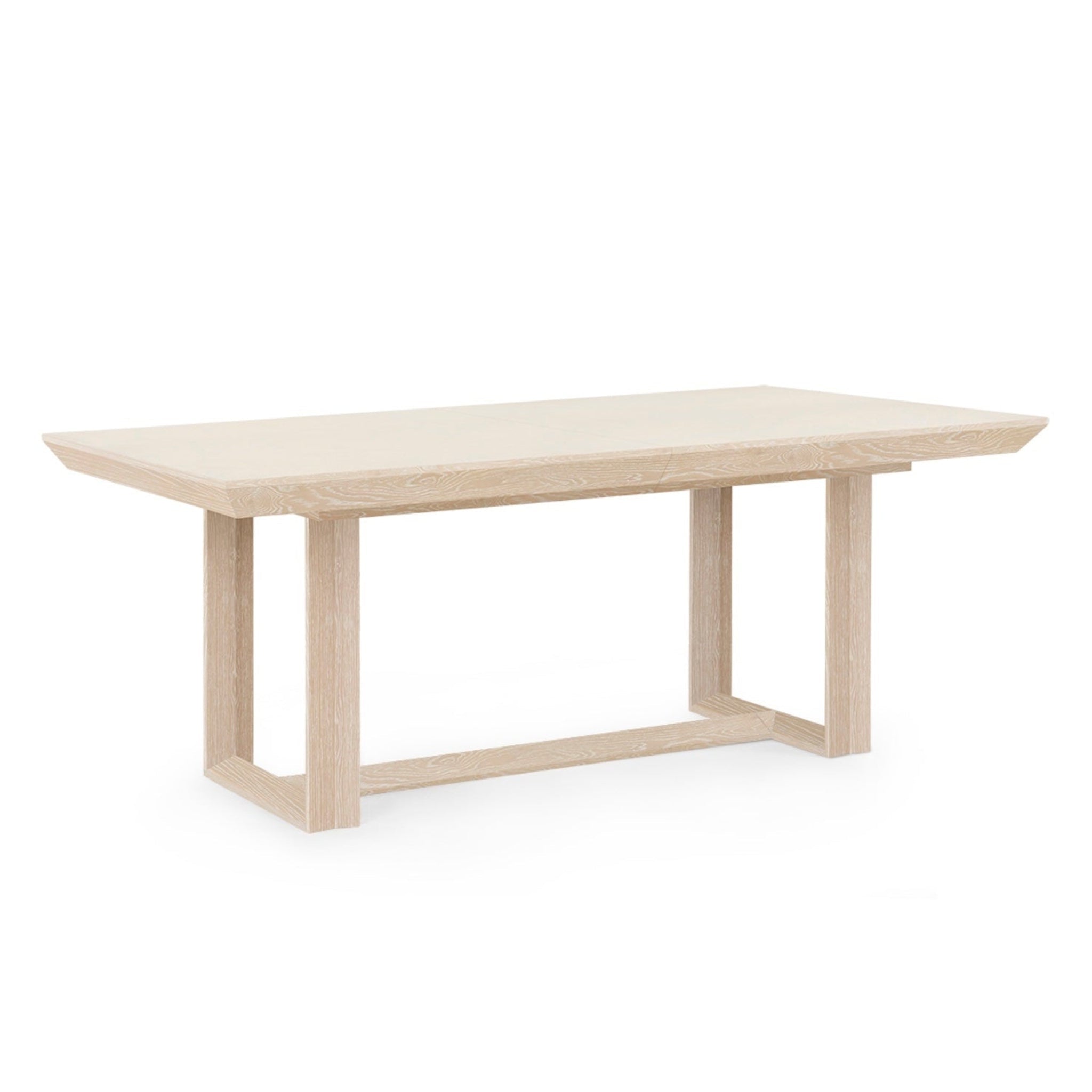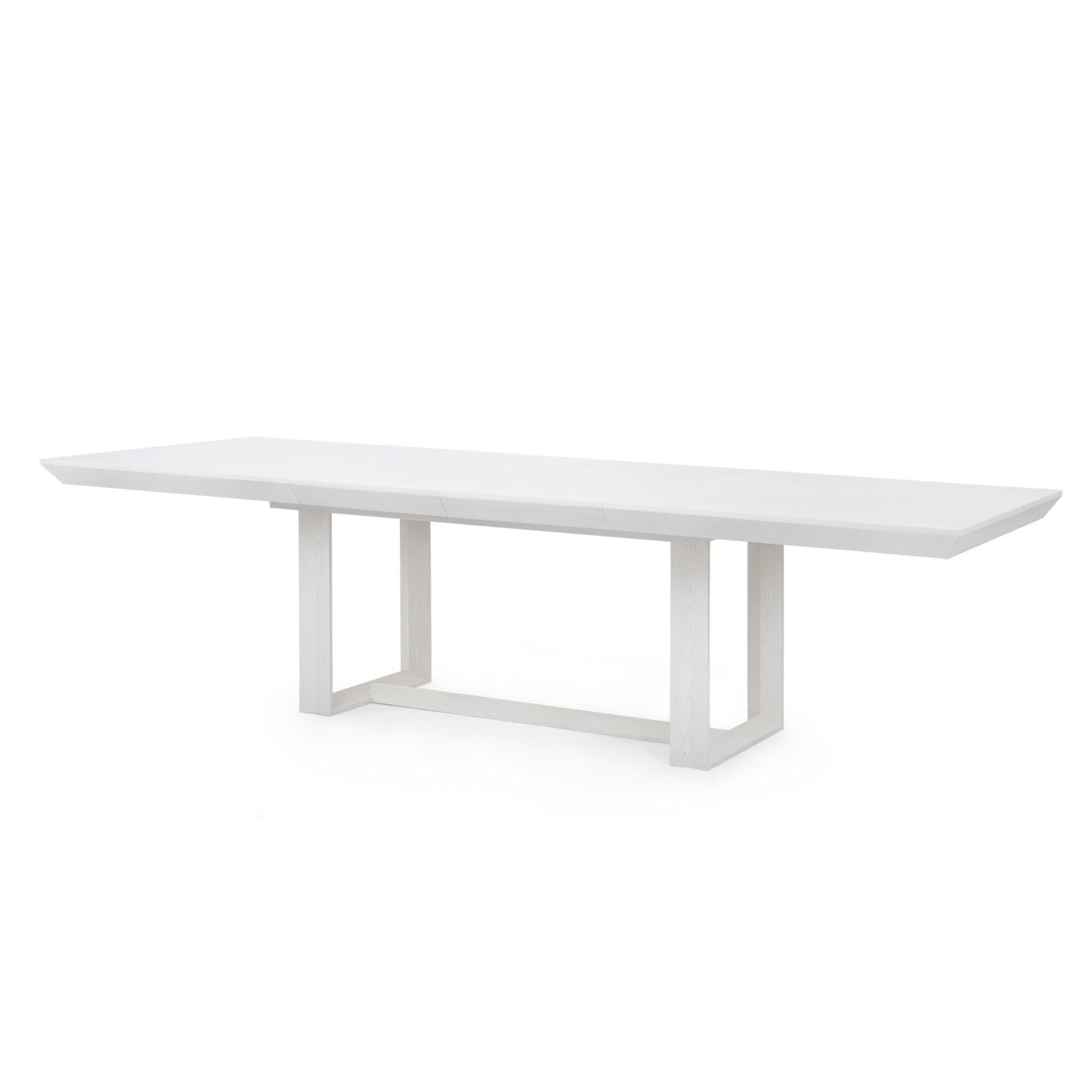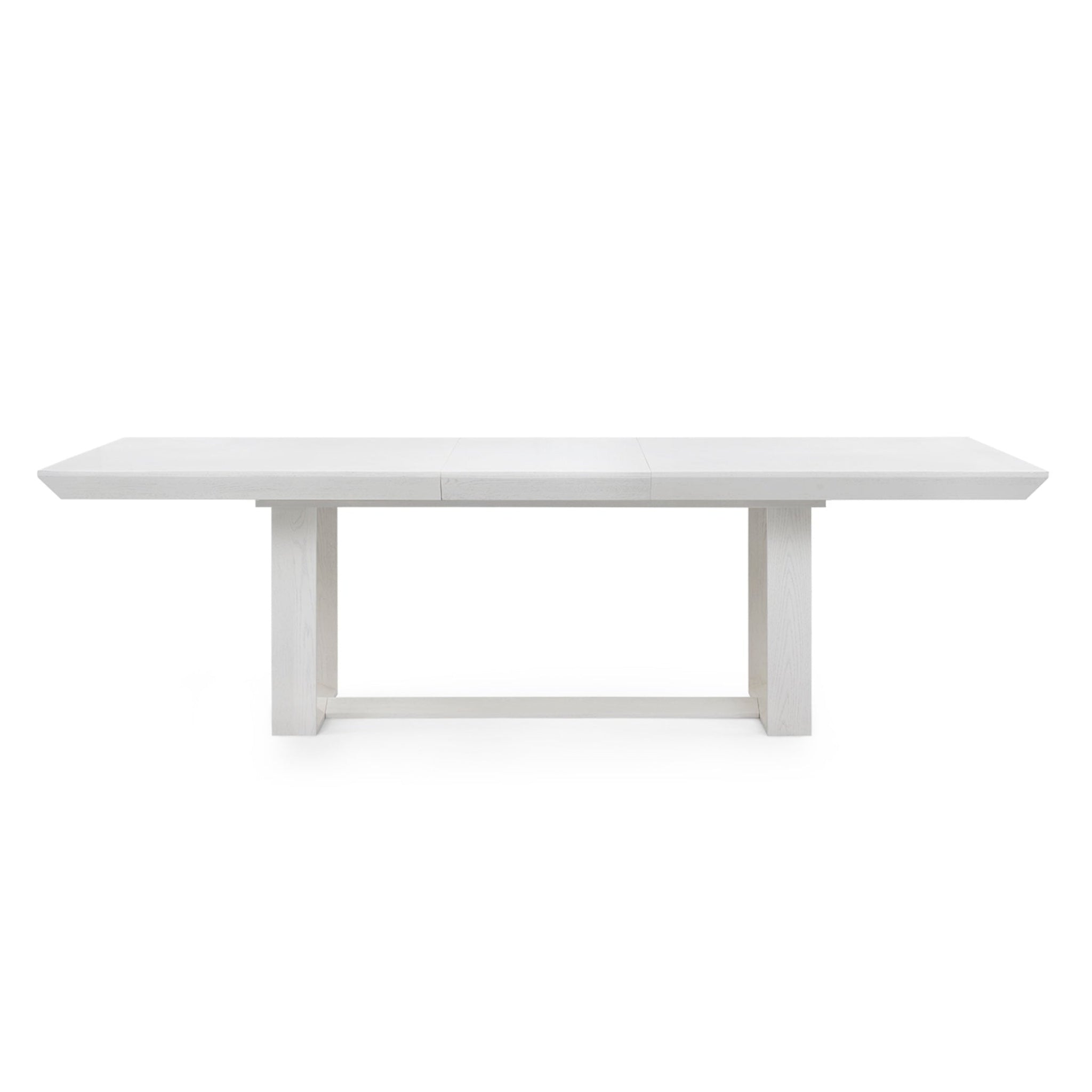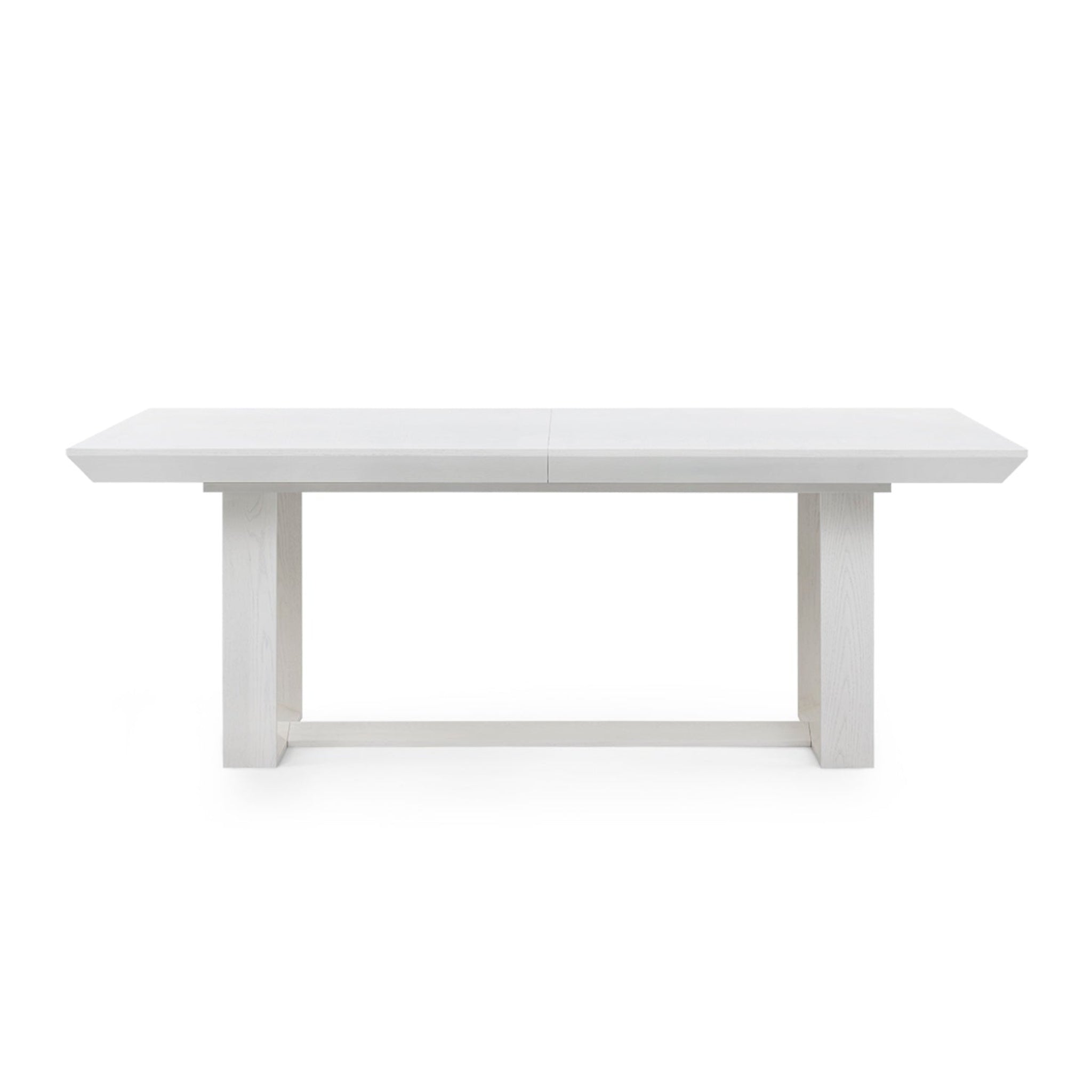 The Finn Dining Table combines deco-inspired elegance with modern architectural precision, featuring a bold rectilinear silhouette in glazed whisper white. With two soft-close extension leaves that allow the table to extend up to 128" with one cleverly stored beneath.