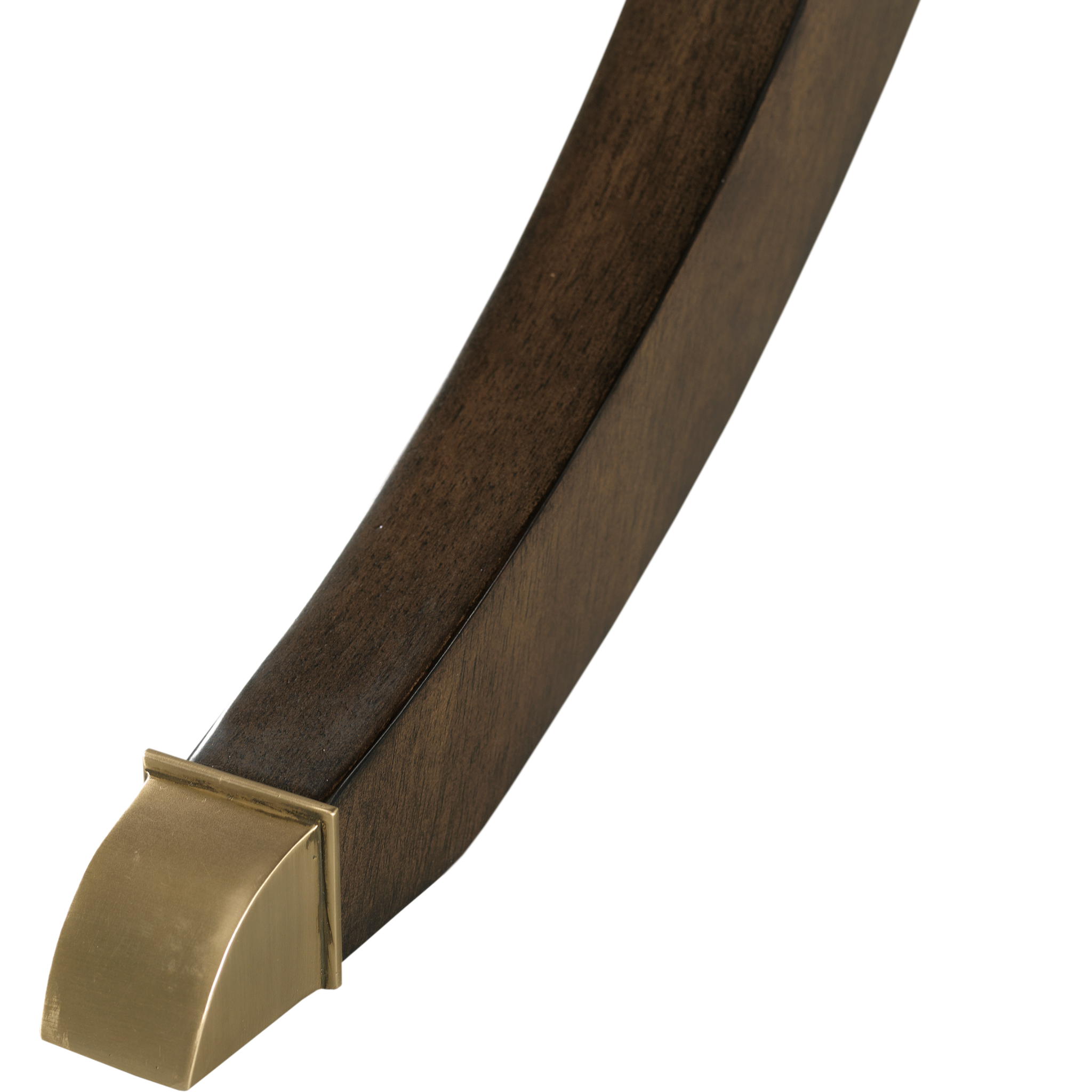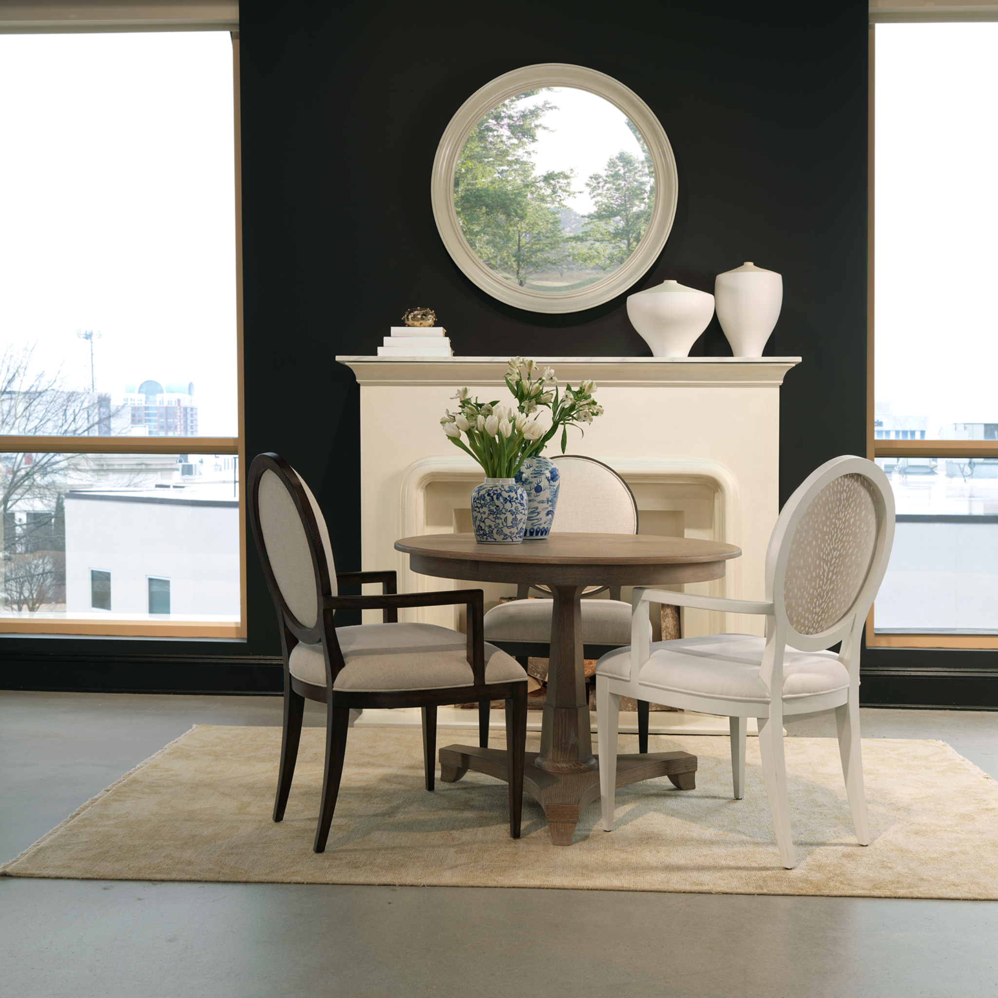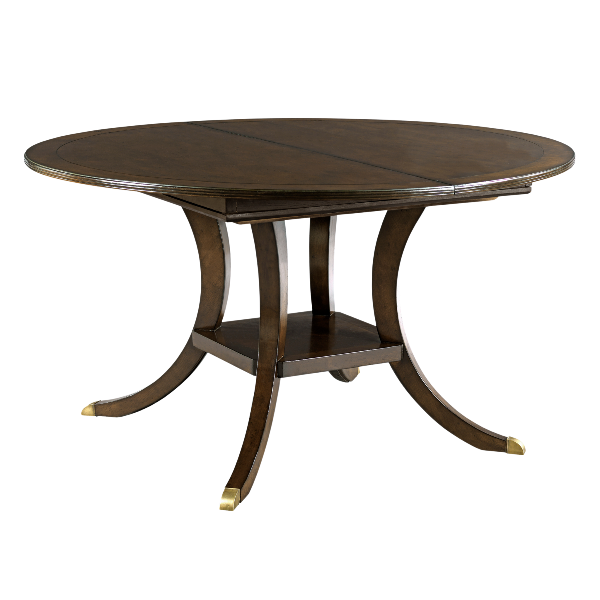 A wonderful table for dining with a round top that divides at its center to accommodate 2-18” fillers. The table is elevated on ample sable legs that are joined by a low square shelf.